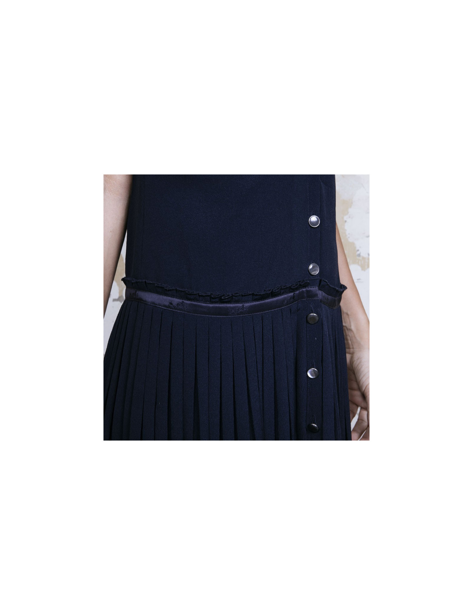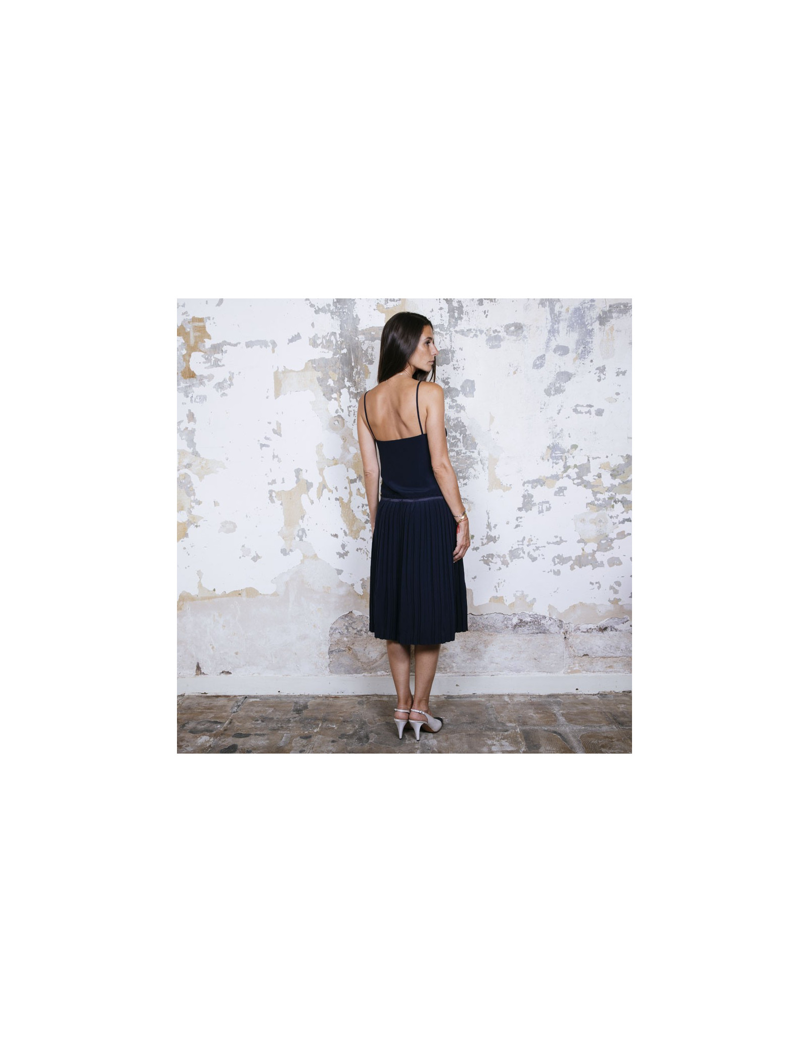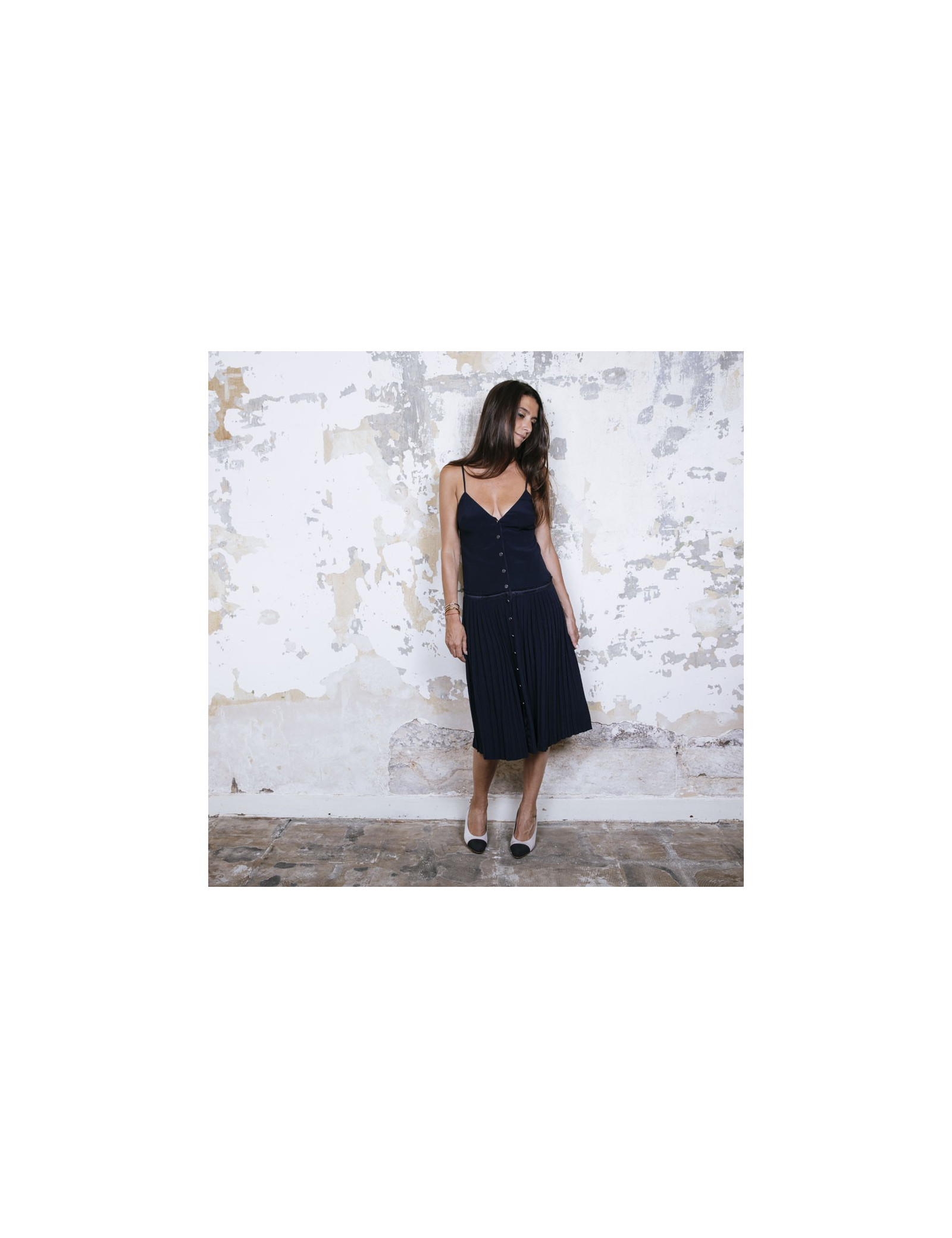 Robe Hermès en soie bleue marine à fines bretelles et boutonnée sur l'avant. Taille 34.