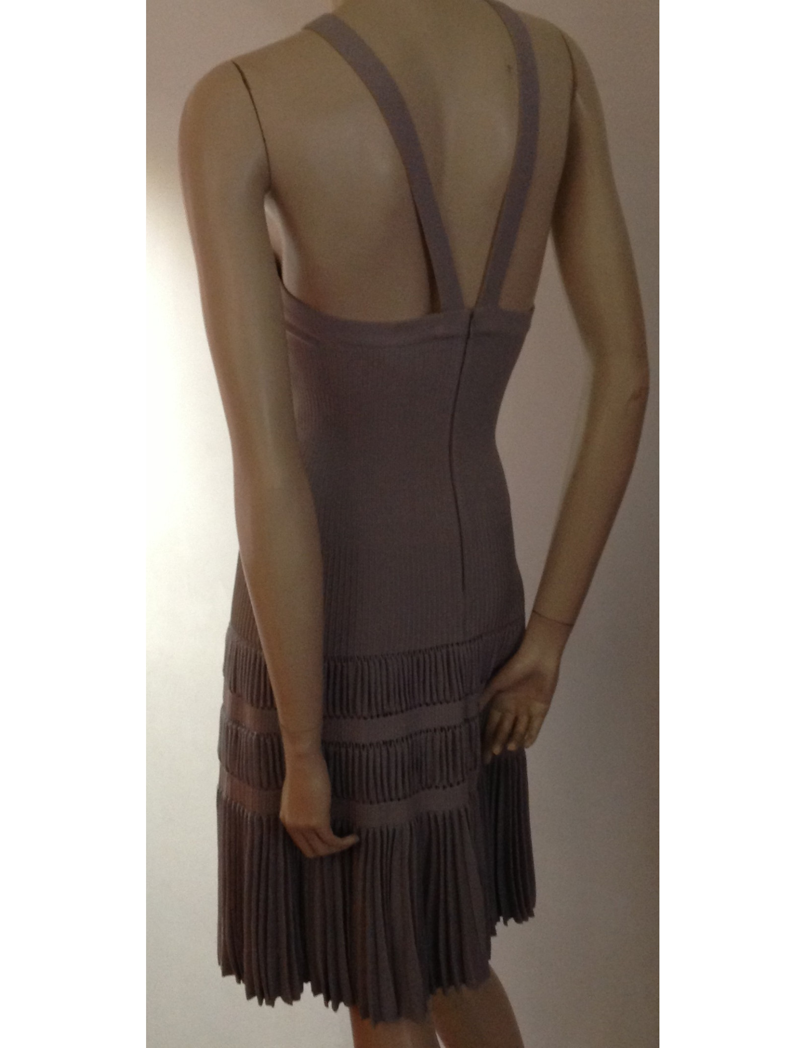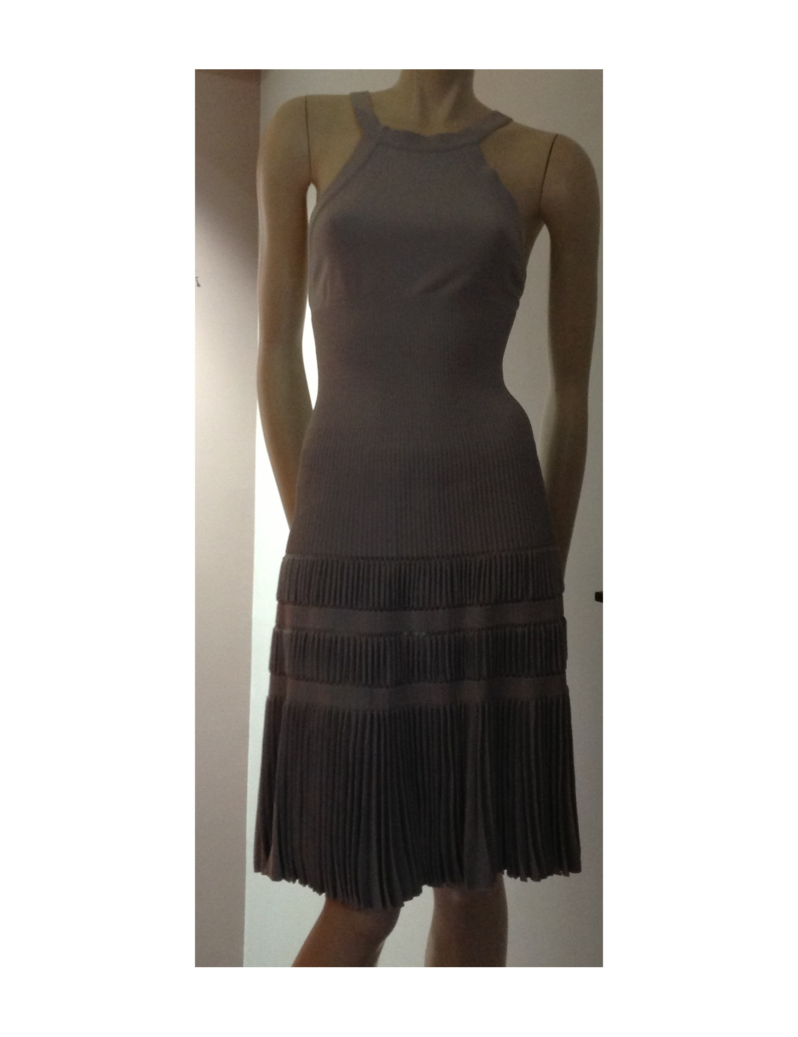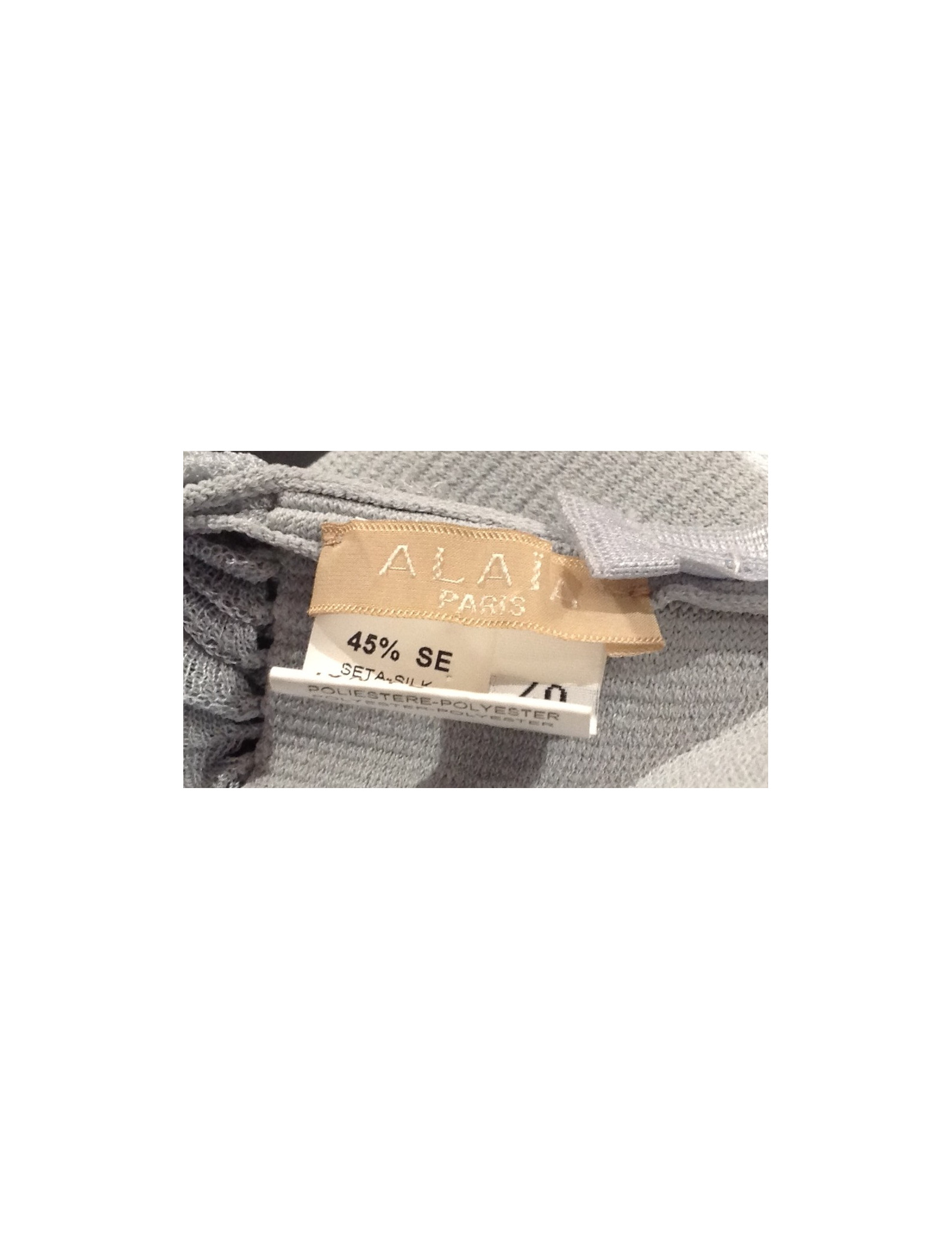 Très belle robe ALAIA - T40 de couleur gris bleu, en maille extensible, sans manches, ajustée au buste, et plissée sur une partie du bas. Les bretelles ne sont pas réglables. La fermeture éclair se trouve dans le dos. Composition: 45% soie et 45% viscose.