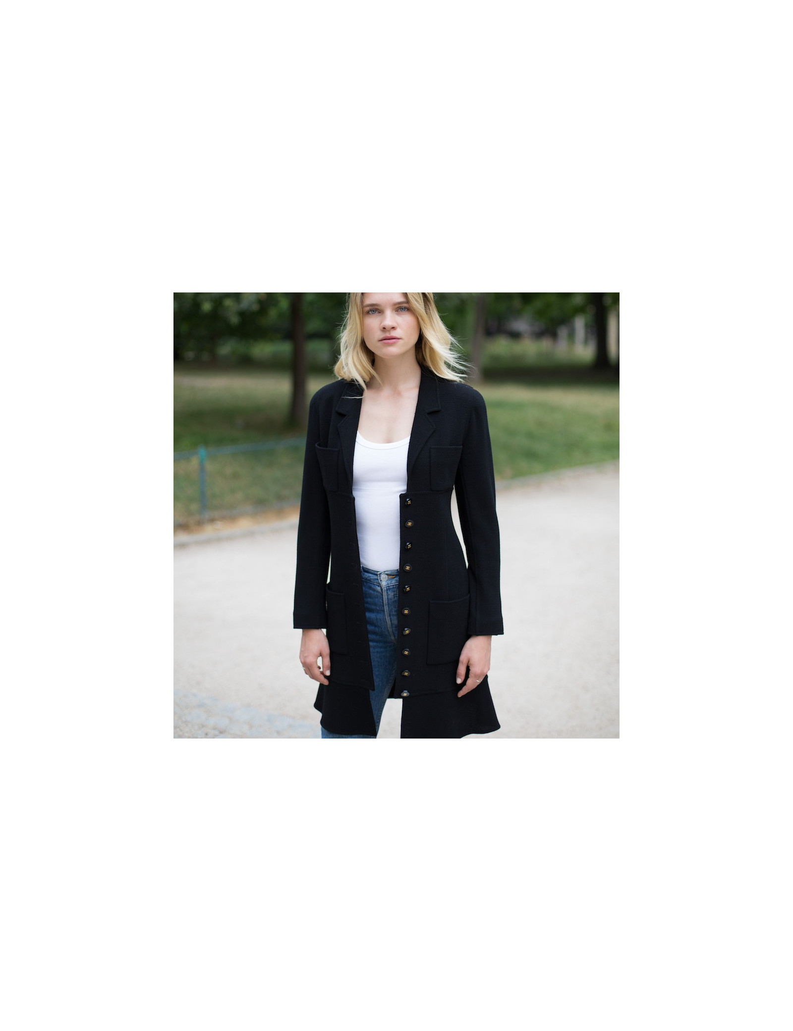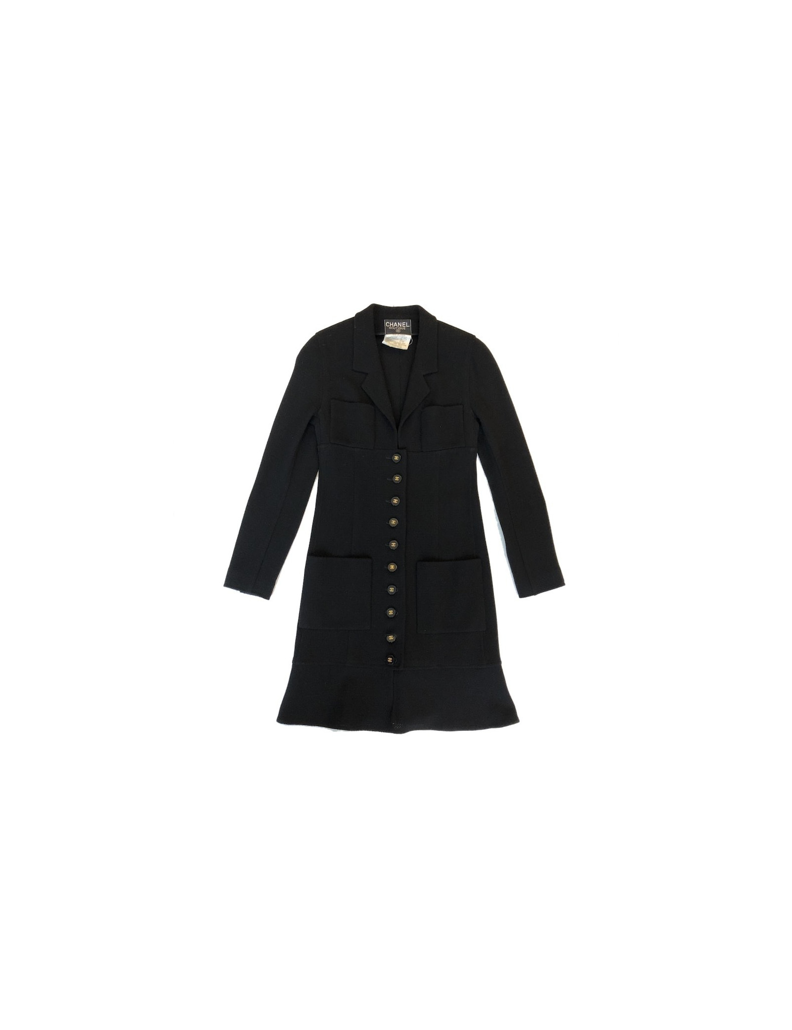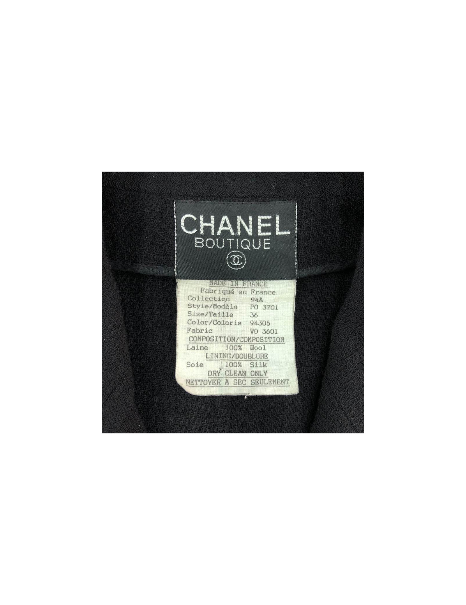 Wow! Incroyable pièce qui symbolise les années 90 de la Maison CHANEL, pièce créée par Karl Lagerfeld qui a su perpétrer le style incomparable de Gabrielle Chanel, tout en le modernisant. C'est aussi la naissance des supermodels telles que Claudia Schiffer, Carla Bruni ou la somptueuse Naomi Campbell portant à merveille les pièces de la Maison. La coupe de cette veste est droite et près du corps se finissant par un volant. Il y a quatre poches à l'avant de la veste. Les boutons sont noirs siglés "CC" dorés. Cette pièce peut être portée soit décontractée soit de façon plus élégante, aussi bien sur une robe que sur un jean. Cette veste longue peut se transformer en robe manteau, elle n'est pas doublée donc très légère.