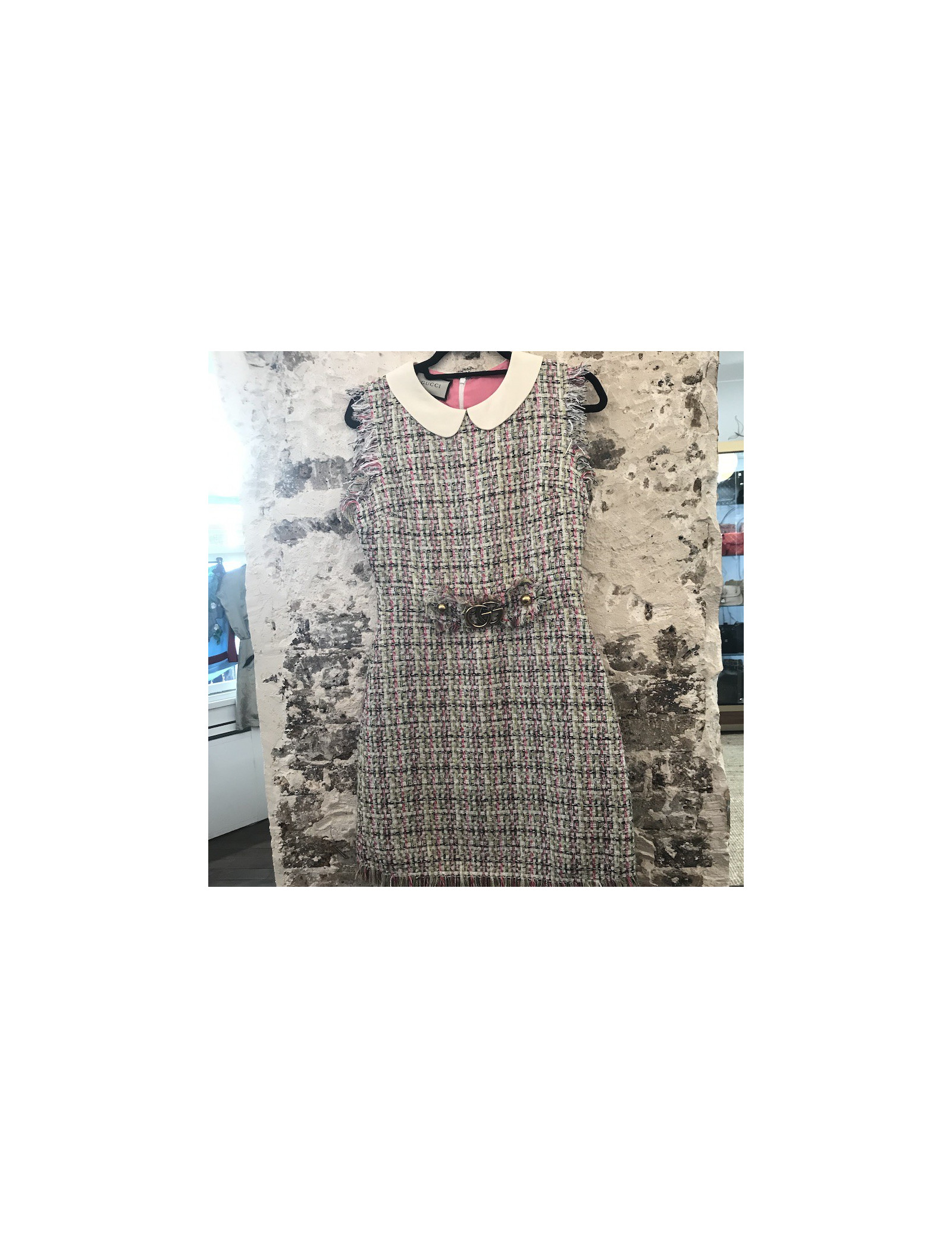 Derniers articles en stock ROBES Robe CHANEL tweed T38 Paris Rome CHANEL 33165 2 700,00 € Robe CHANEL tweed T38 Métiers d'Art Automne-Hiver 2015-2016 Condition : très bon étatPays de fabrication : FranceModèle : robe Matière : laineDoublure : soie Couleur : base noire, bleu, ruban argent et fils d'argentBijouterie : argent vieilli, noirTaille : 38FRDimensions : Largeur épaules raglan : 40 cm, Sous les aisselles 48 cm, Longueur des manches 40... Ajouter au panier