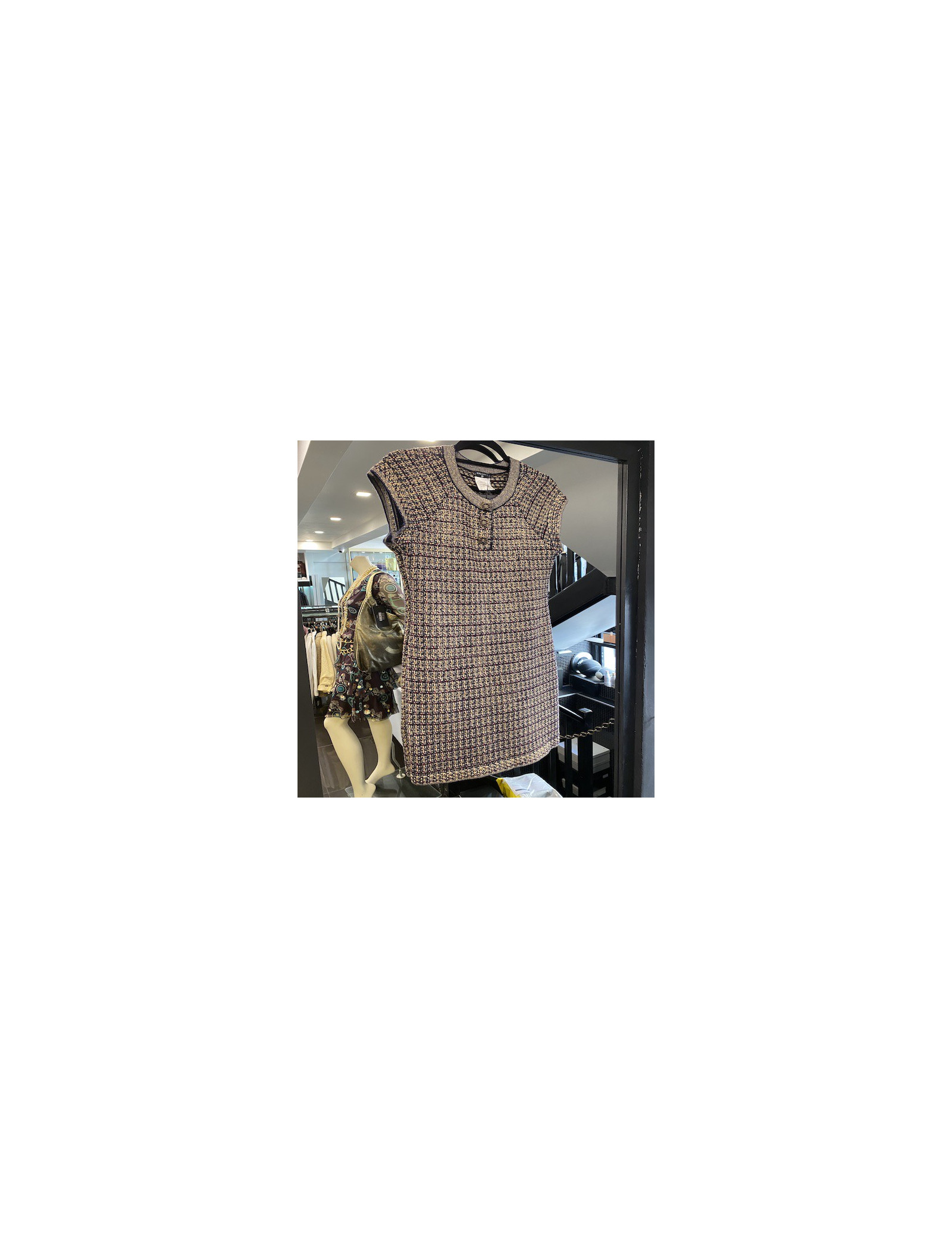 Derniers articles en stock ROBES Robe CHANEL T 38 tweed rose et bleu marine CHANEL 21523 2 400,00 € Robe CHANEL T 38 tweed rose et bleu marine Robe courte de la Maison Chanel en tweed rose et bleu marine, taille 38 FR. Pays de fabrication : Made in France. Broche camélia en tweed rose et bleu marine placée sur la poitrine. Fermeture éclair le long du dos. Doublure en soie rose monogram.Condition : En très bon état.Dimensions à plat : largeur de poitrine... Ajouter au panier