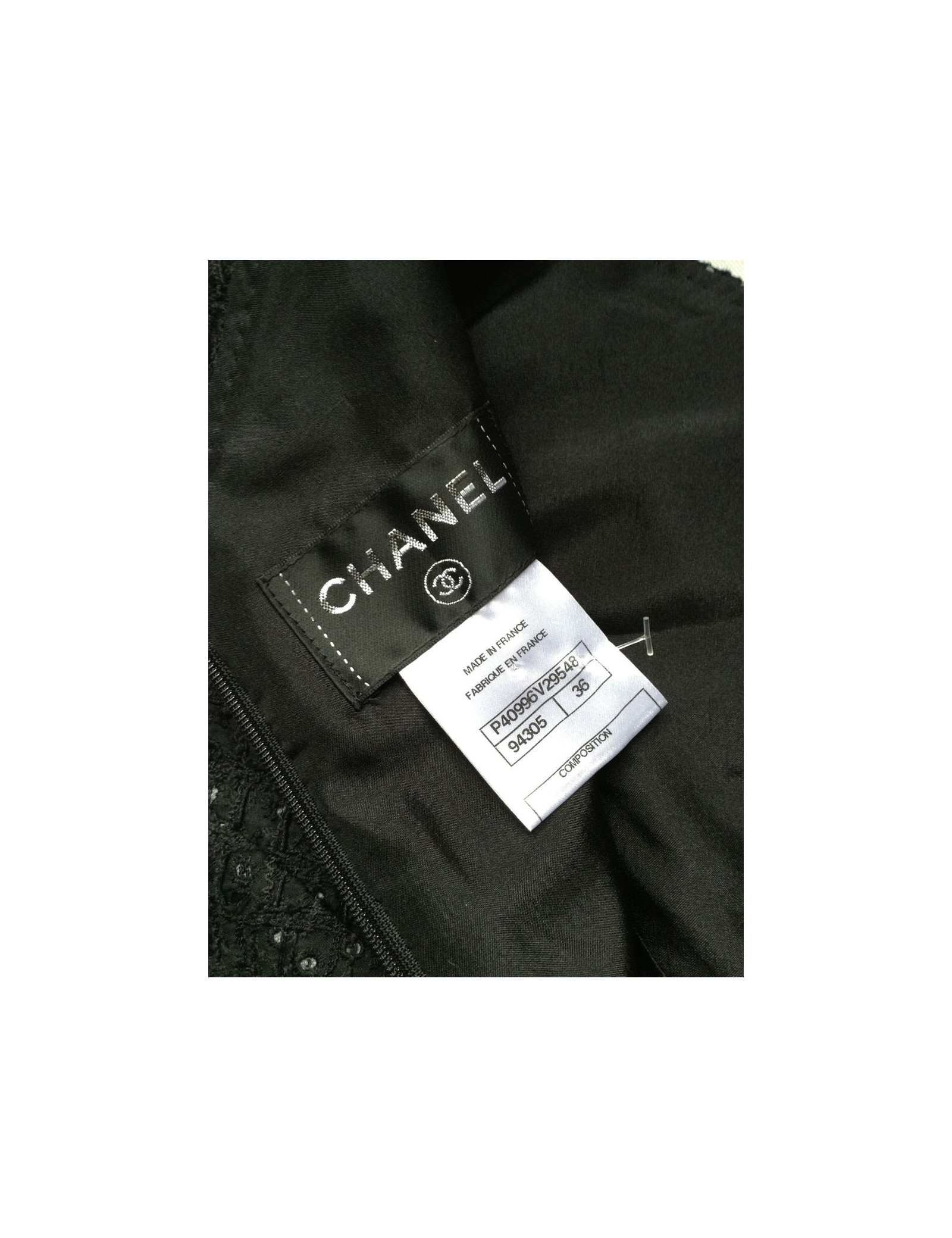 Robe CHANEL T36 fr en tweed noir (jamais porté), à manches raglans, une bande de tissu géométrique en tweed noir à la forme arrondie de la même couleur que la robe est appliquée à l'avant comme à l'arrière. Il y a 1 poche sur chaque coté de la robe et un tout petit col V au dos, suivi d'une longue fermeture fine noire zippée au logo CC. Composition: 90% coton, doublure est en soie 100%. Une jolie robe qui développera tout son potentiel de féminité lorsqu'elle sera portée avec des talons. (Étiquette Chanel barrée) Collection récente.