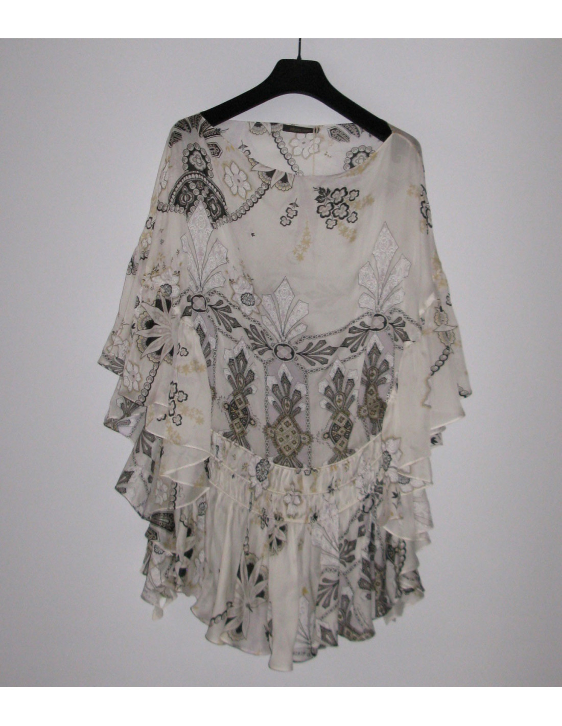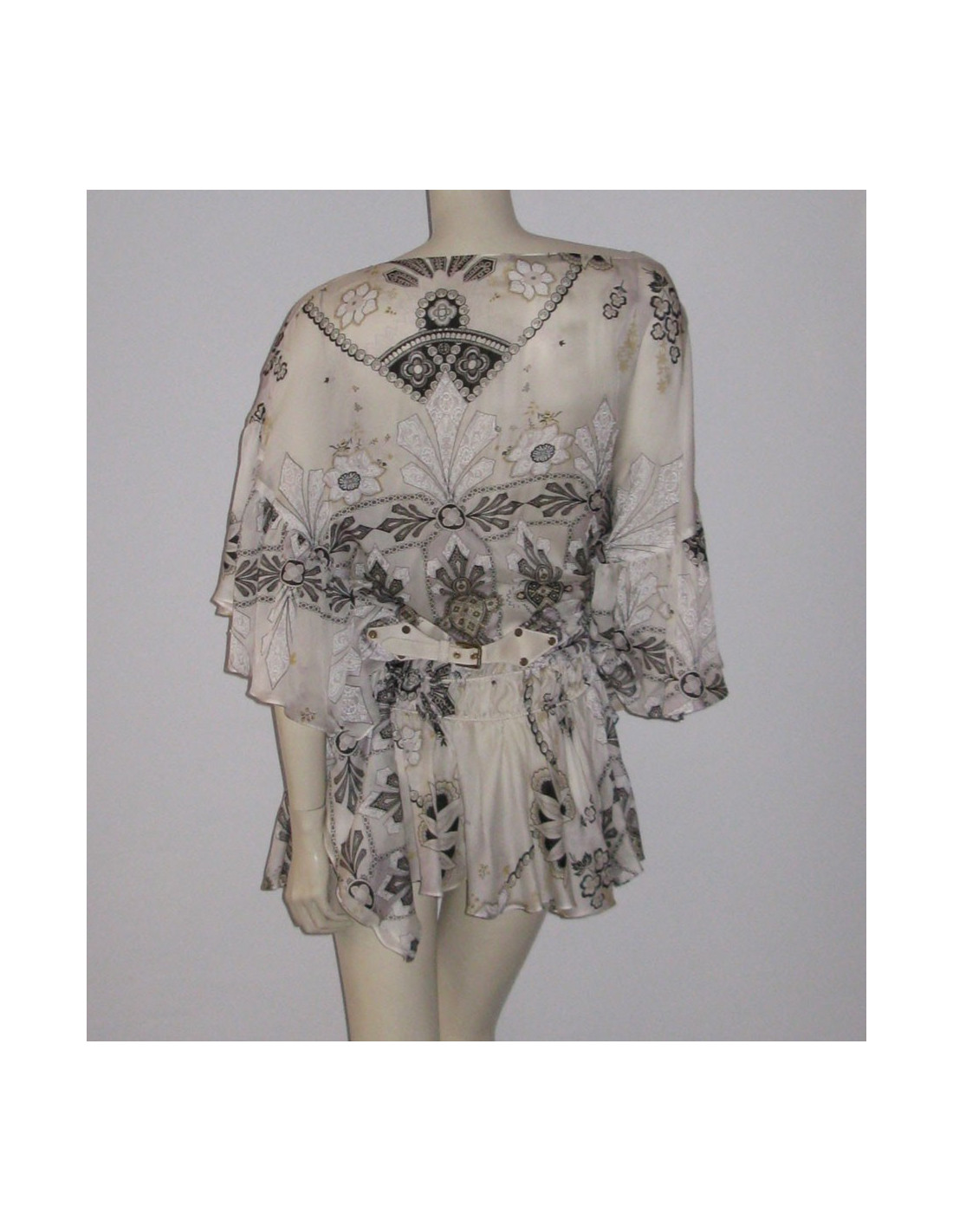 Magnifique! Tunique ROBERTO CAVALLI en soie imprimée assortie d'une ceinture drappé. Encolure ronde, manches à volant asymétrique ainsi qu'au bas du top. Ceinture élastique intégrée à la taille. Taille 40it. 100% soie.