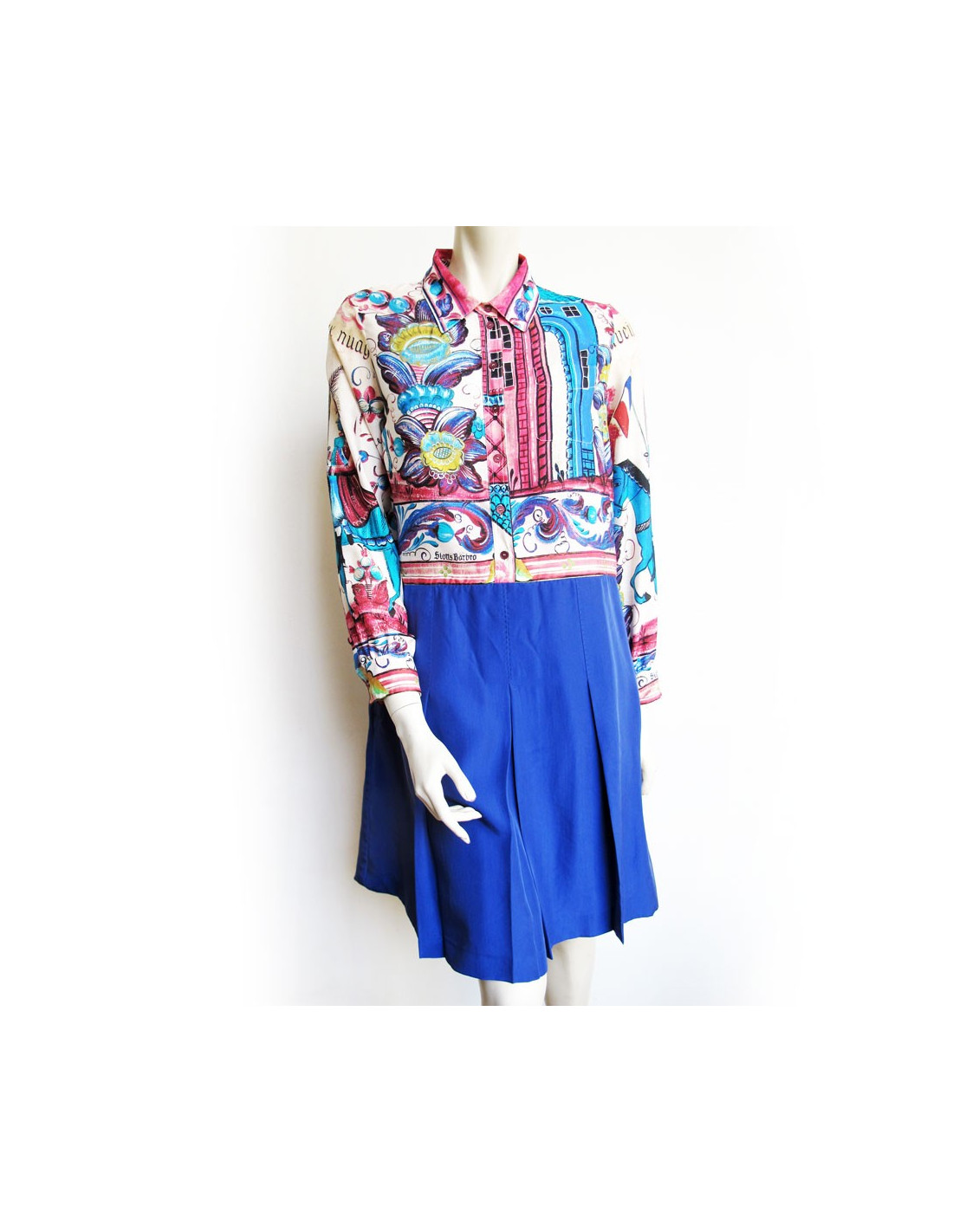 Sur le chemisier, des impressions comme sur un tableau de fleurs, un cheval, drapeau, ... Le reste de la robe à partir de la taille est violet avec deux de chaque côté. Elle est également plissée.
