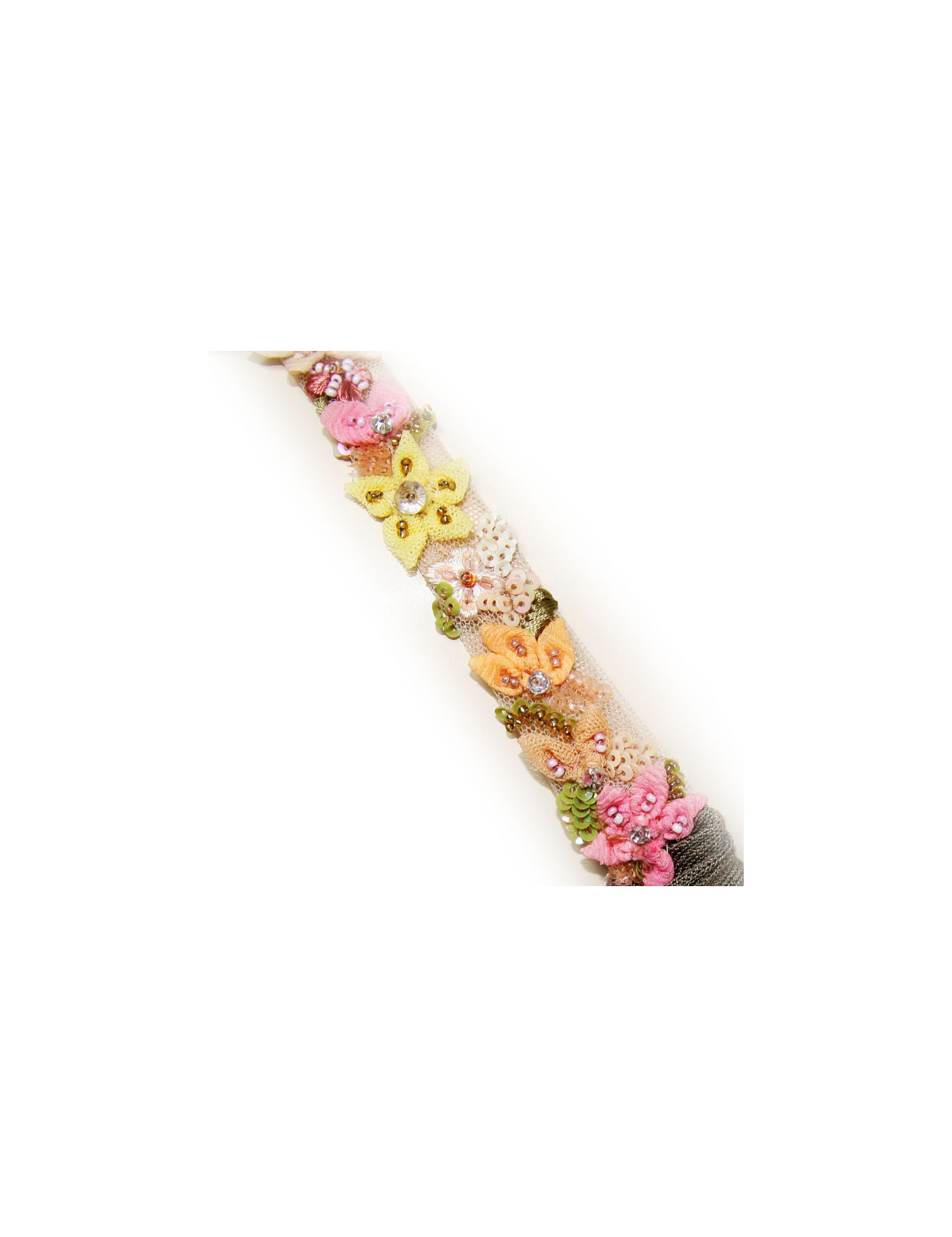 A la taille et sur les bretelles, broderies de fleurs en dentelle.