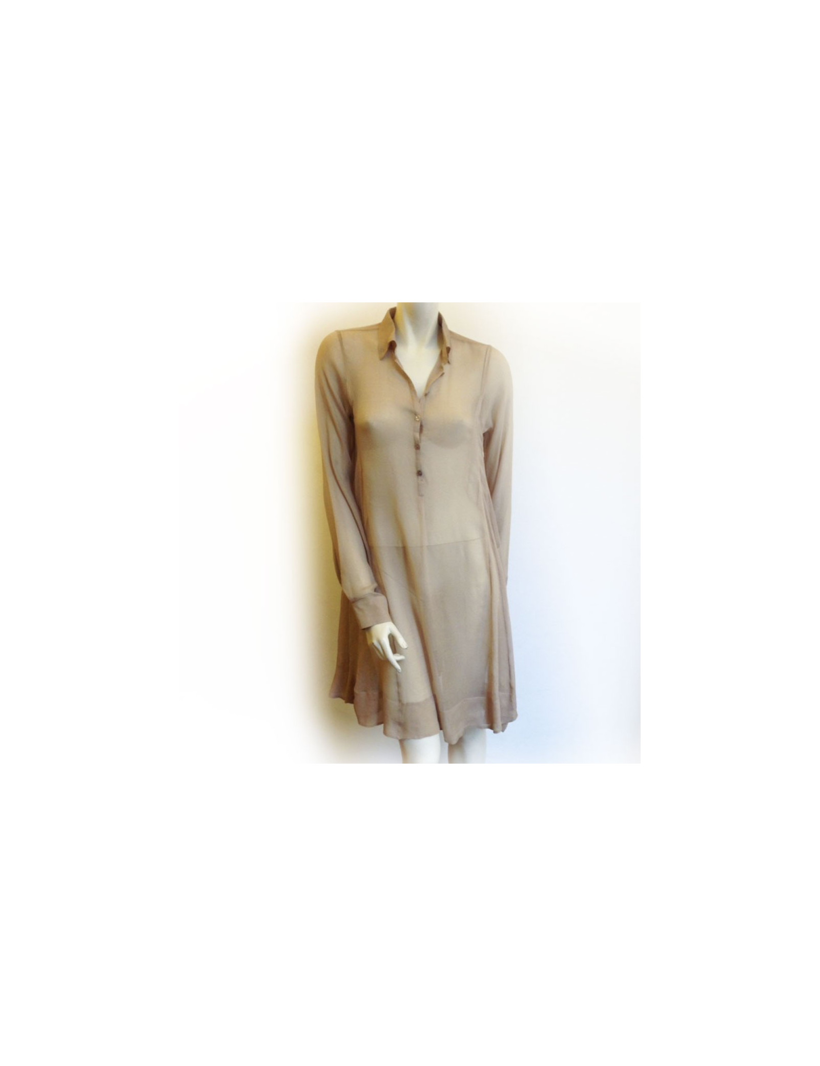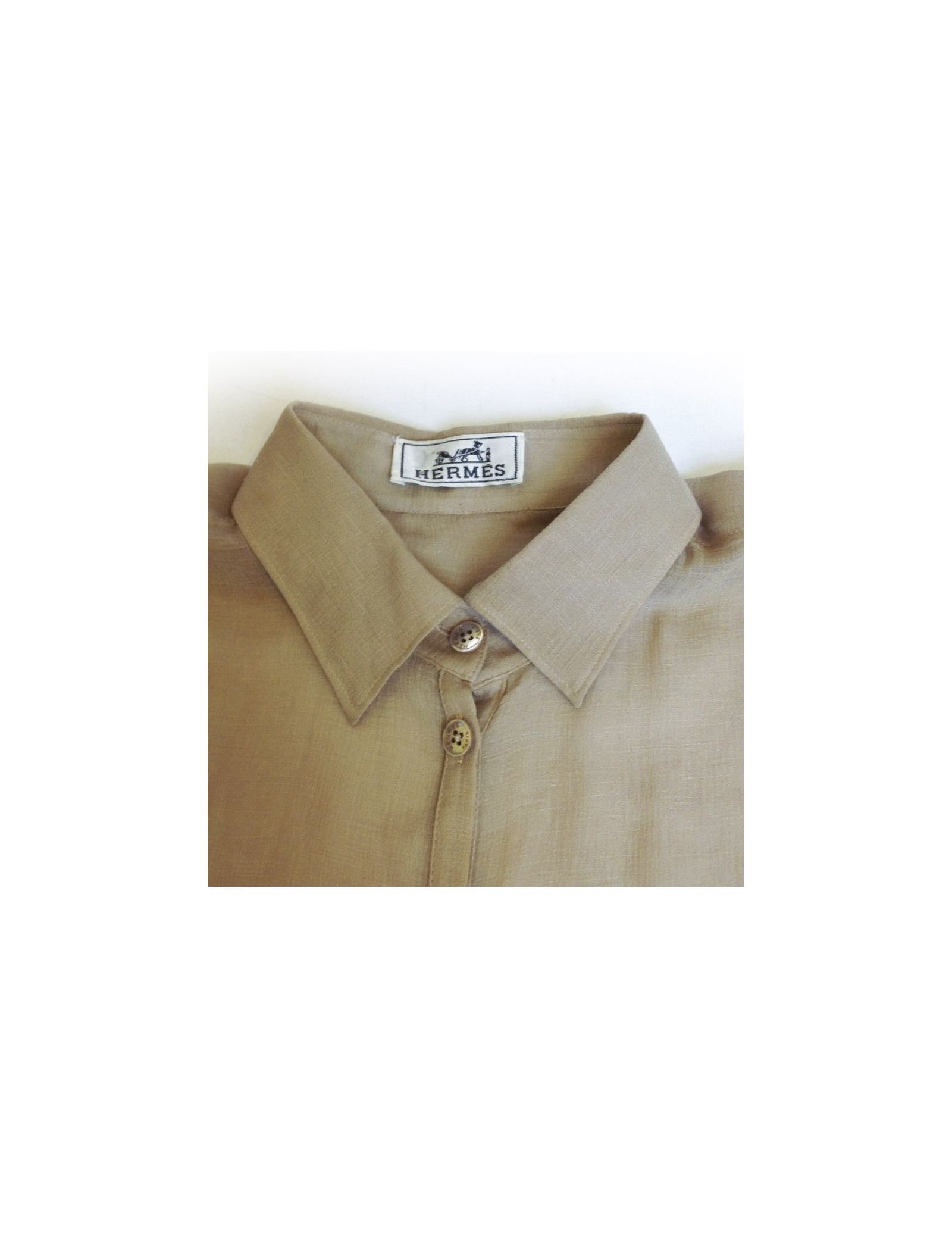 Tunique Hermès couleur sable en crêpe de soie. Manches longues. Col chemise. Ferme Elle se ferme par des boutons. Poignées fermeture 1 bouton. taille 38 Pas d'étiquette de taille. En bon état. Marque de stylo au niveau de l'épaule droite.