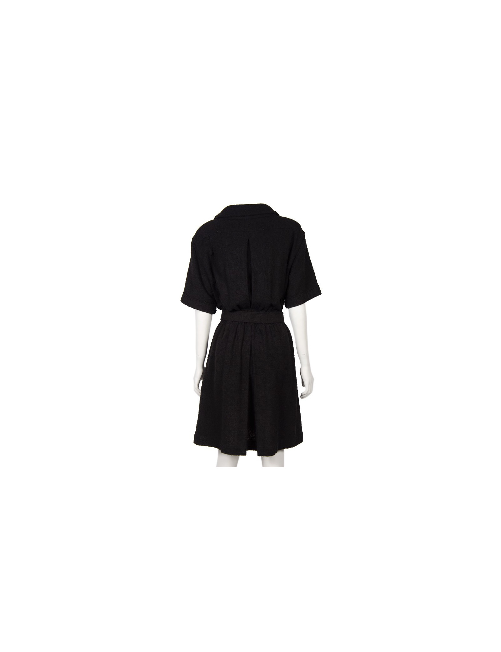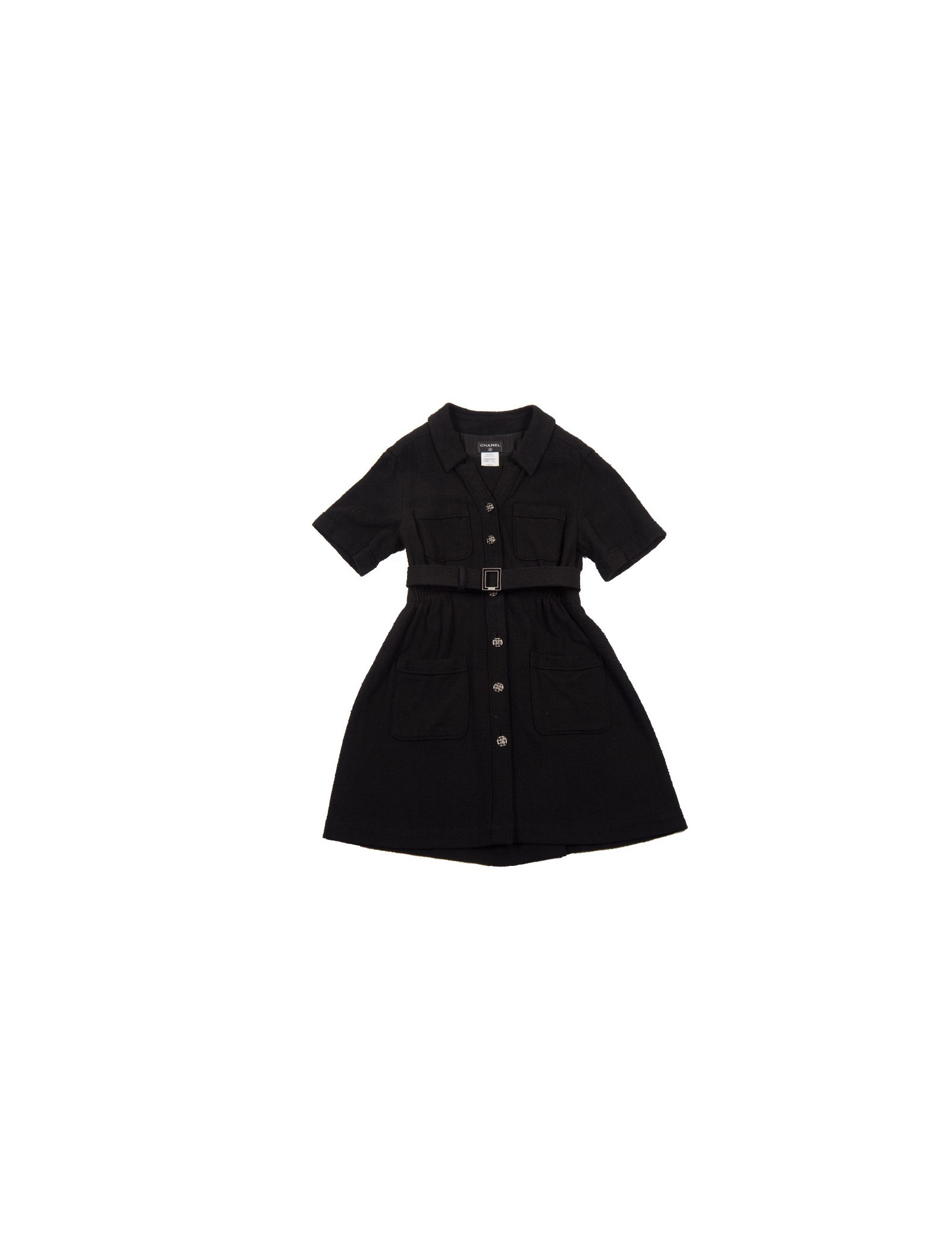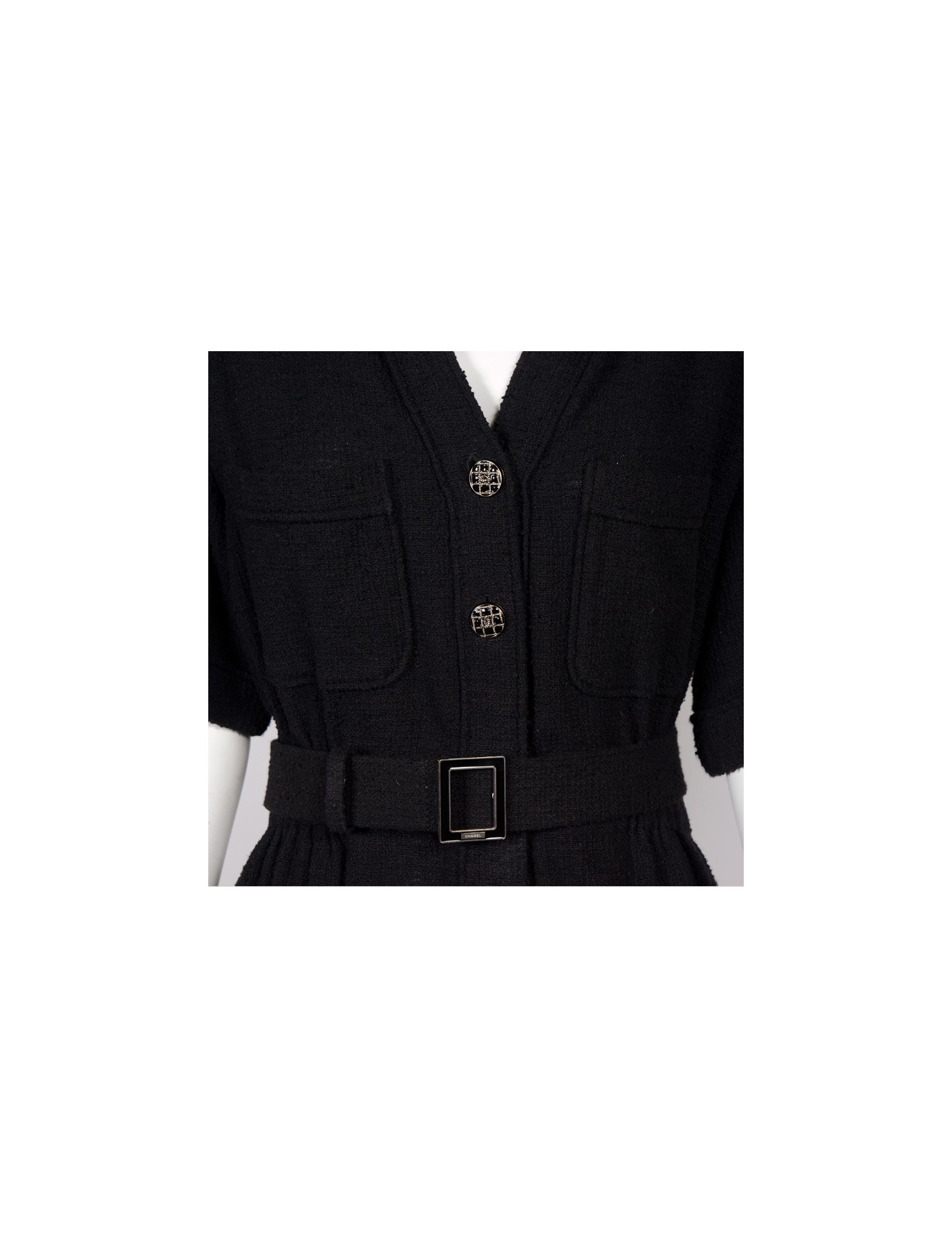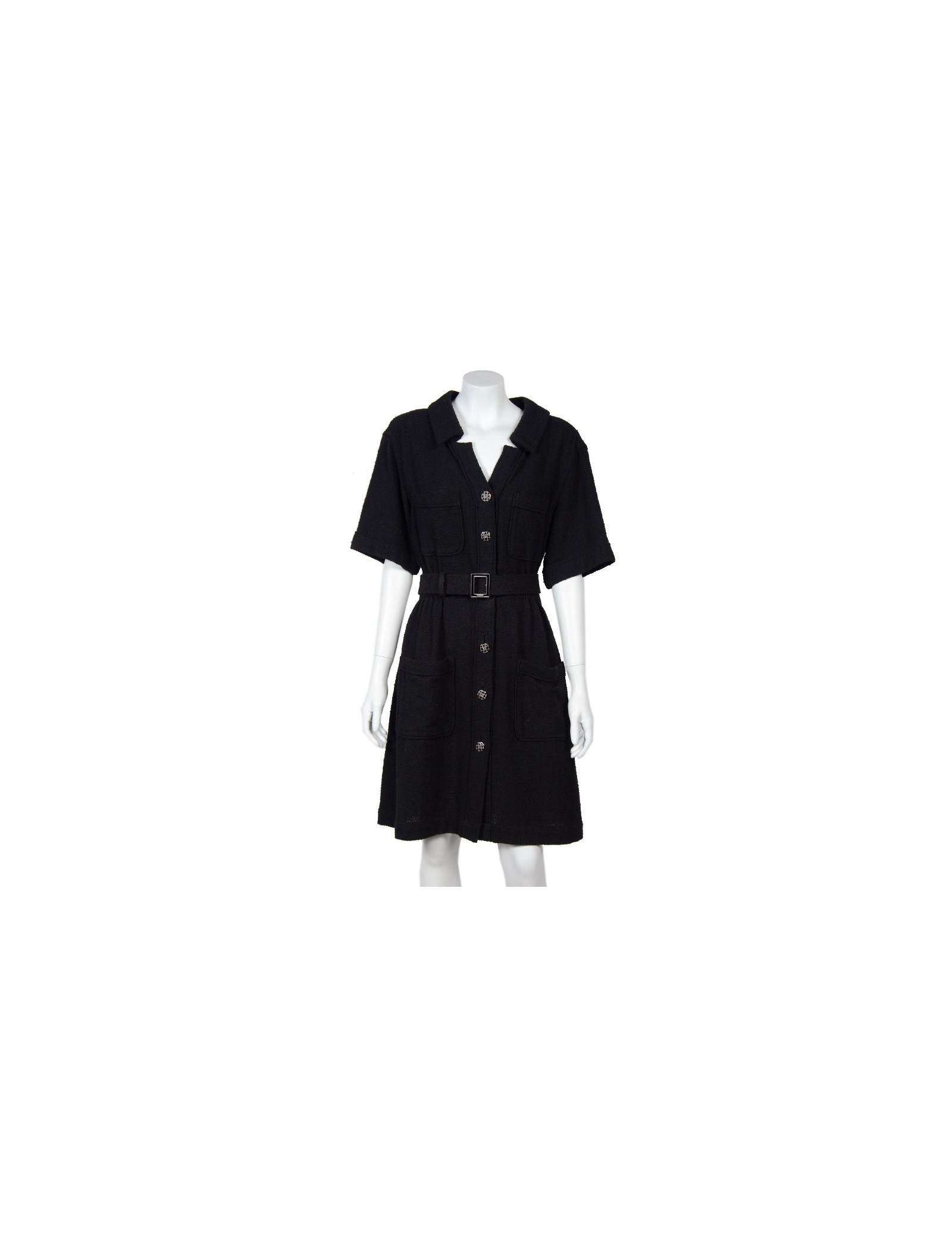 Superbe robe "Paris-Singapour" d'un grand classicisme , taille 42 Chanel en tweed noir. Elle a des manches courtes, deux poches sur la poitrine, une taille resserrée par un gros élastique et deux autres grandes poches. Elle se ferme de haut en bas par des boutons argentés grillagés avec un double "C" au centre. Afin de marquer davantage la taille il y a une ceinture doublée de cuir noir avec une boucle rectangulaire émaillée noire.
