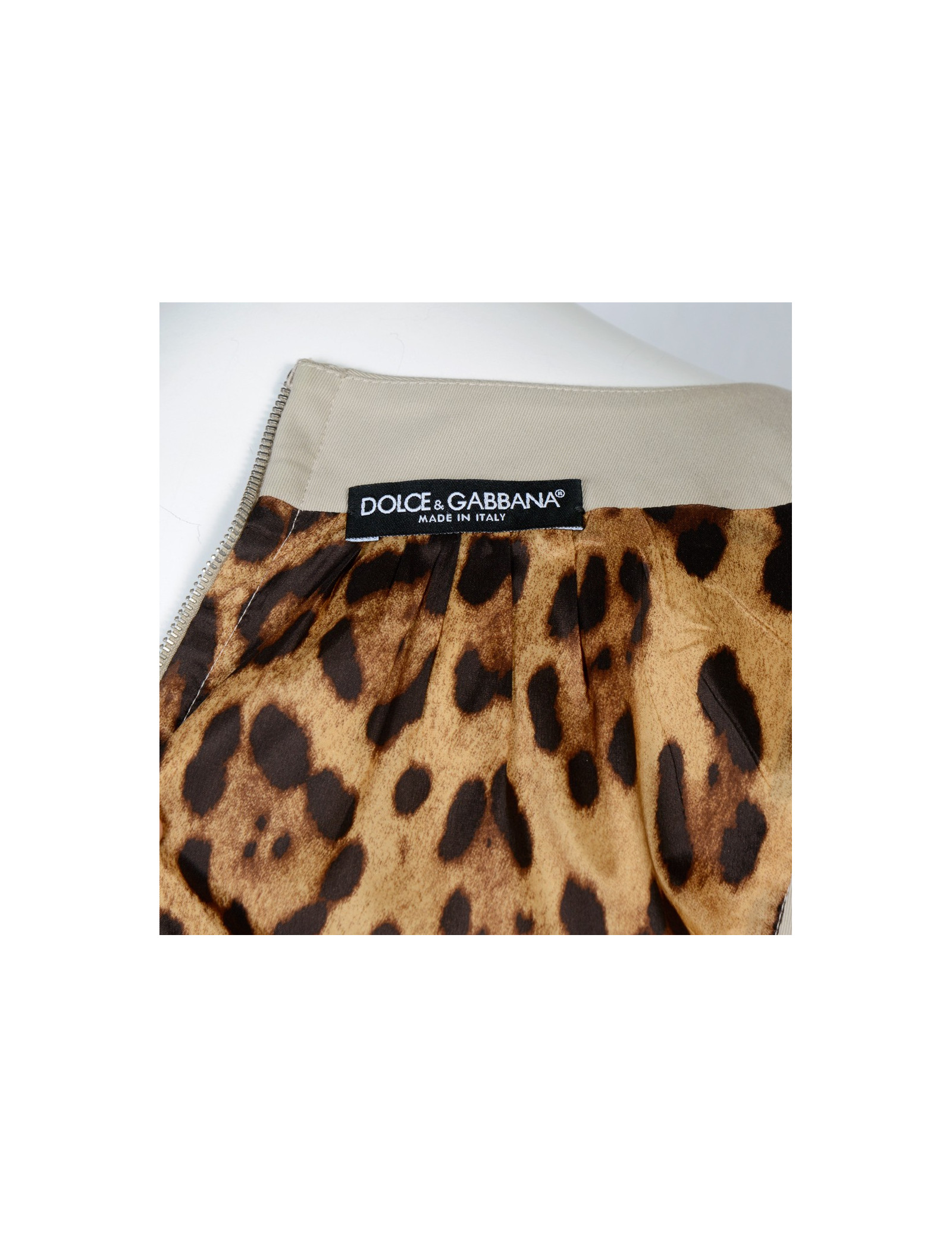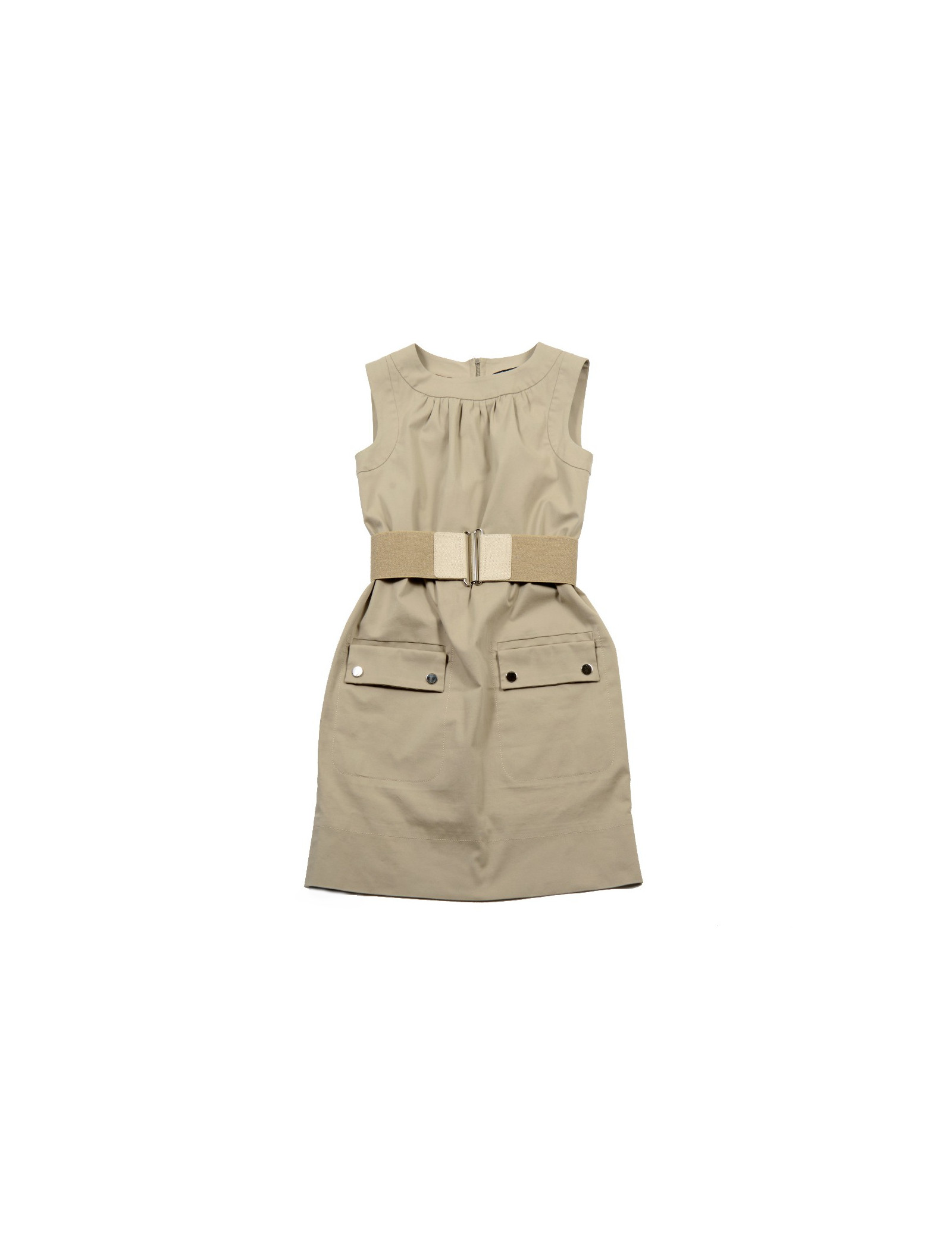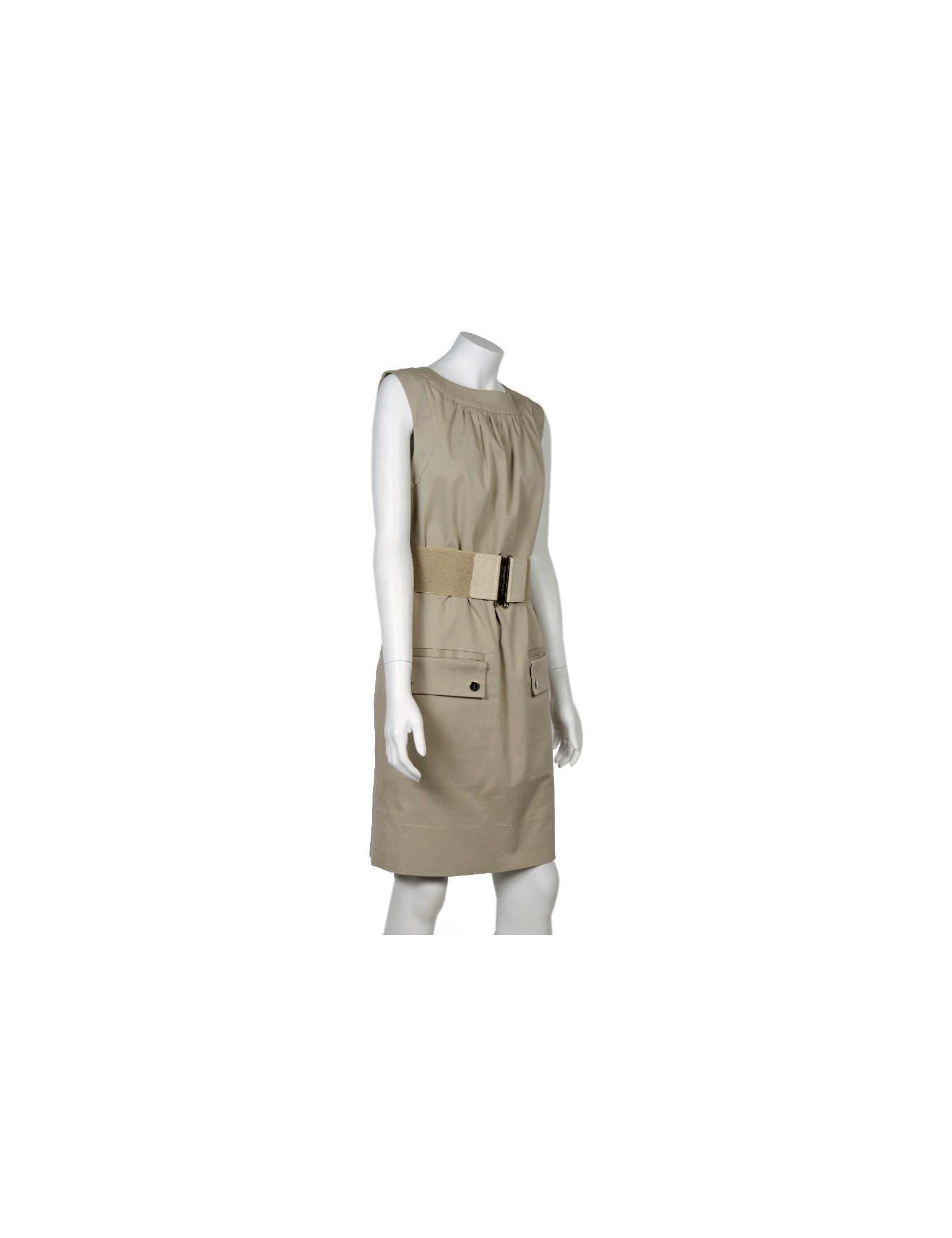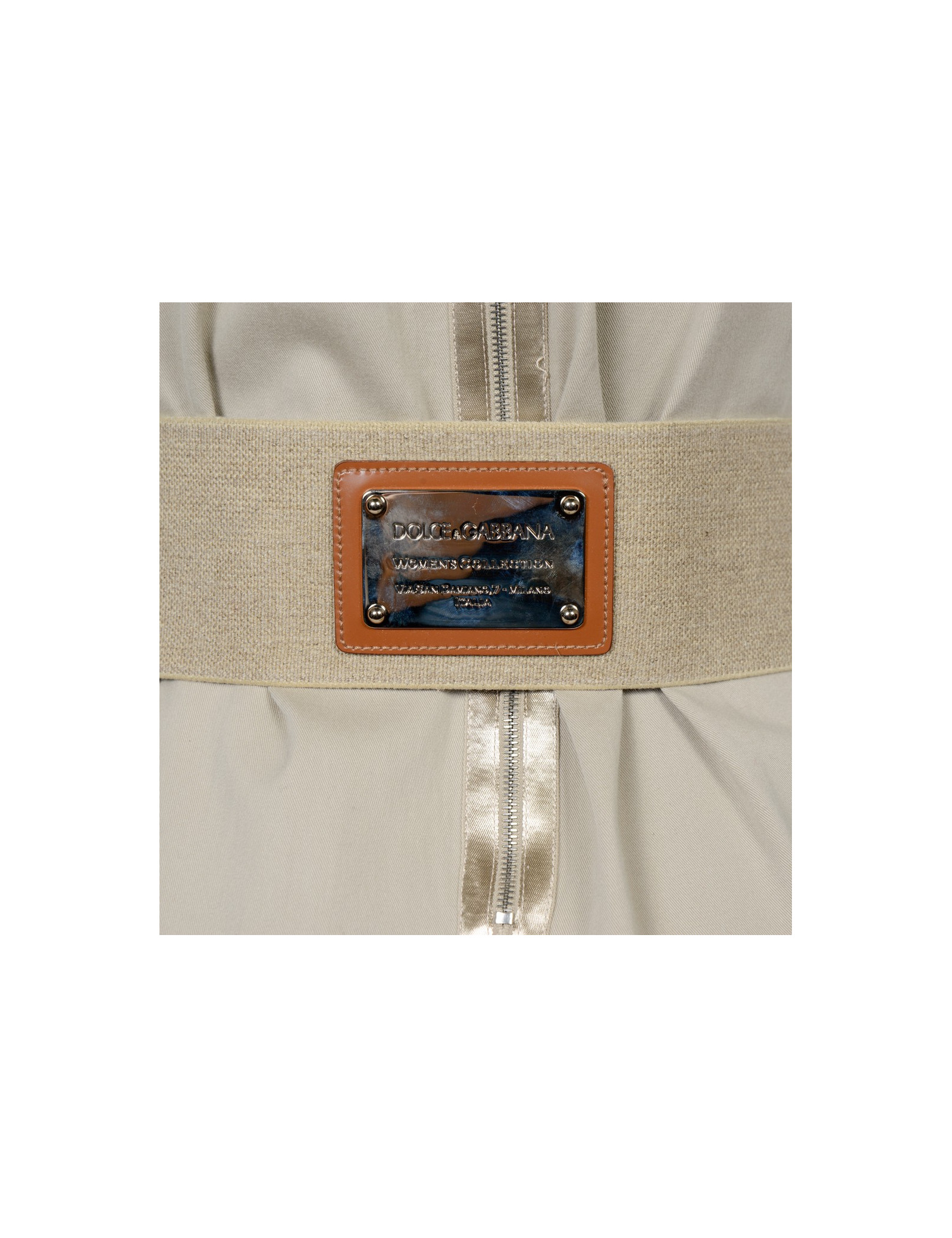 Robe Dolce & Gabbana en coton de couleur beige. Taille 44 italien équivaut à une taille 40 française. La doublure est en imprimé léopard. Fermeture zippée dans le dos. Une poche plaquée de chaque côté. Une large ceinture en stretch vient resserer la taille. Au centre, une plaque en cuir verni et en métal argenté avec les inscriptions "Dolce & Gabbana ...." En très bon état.