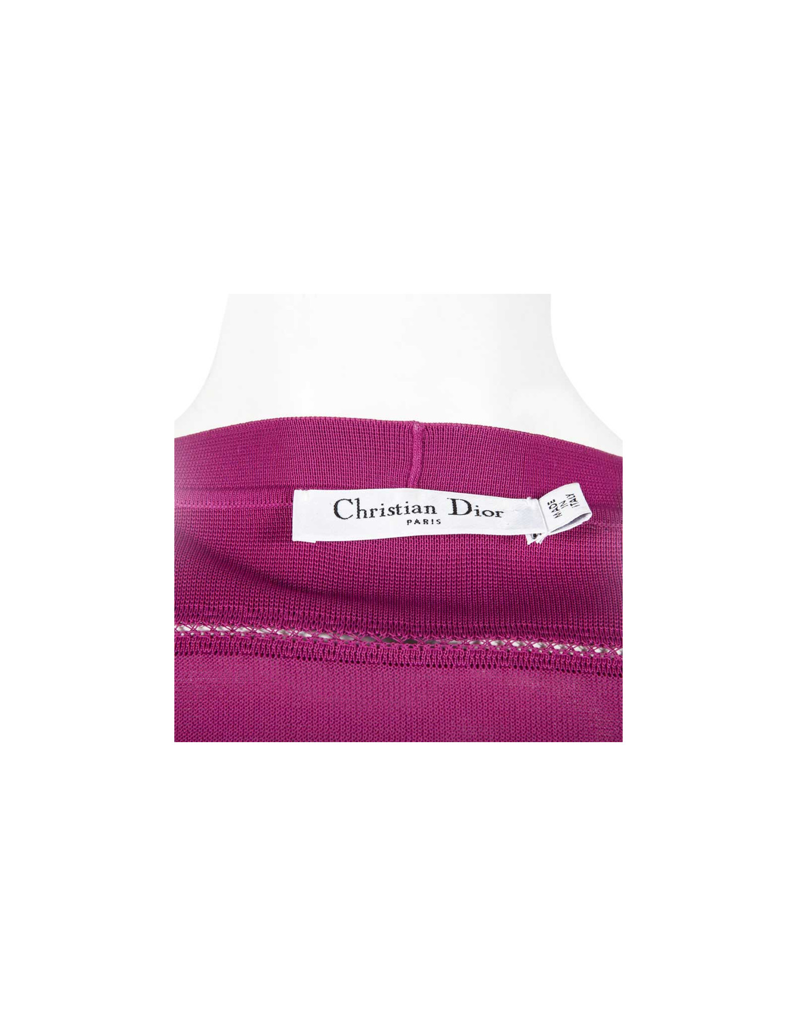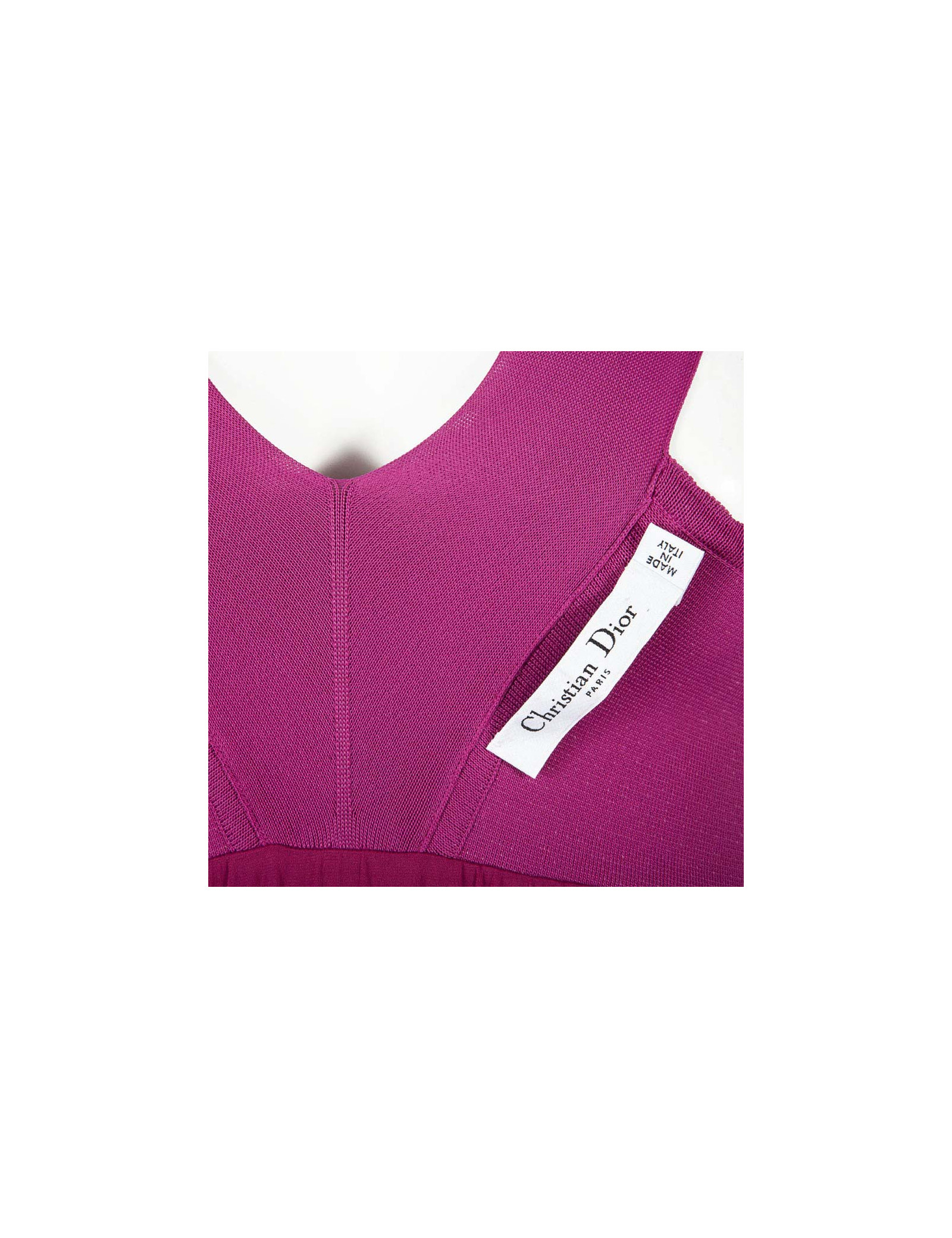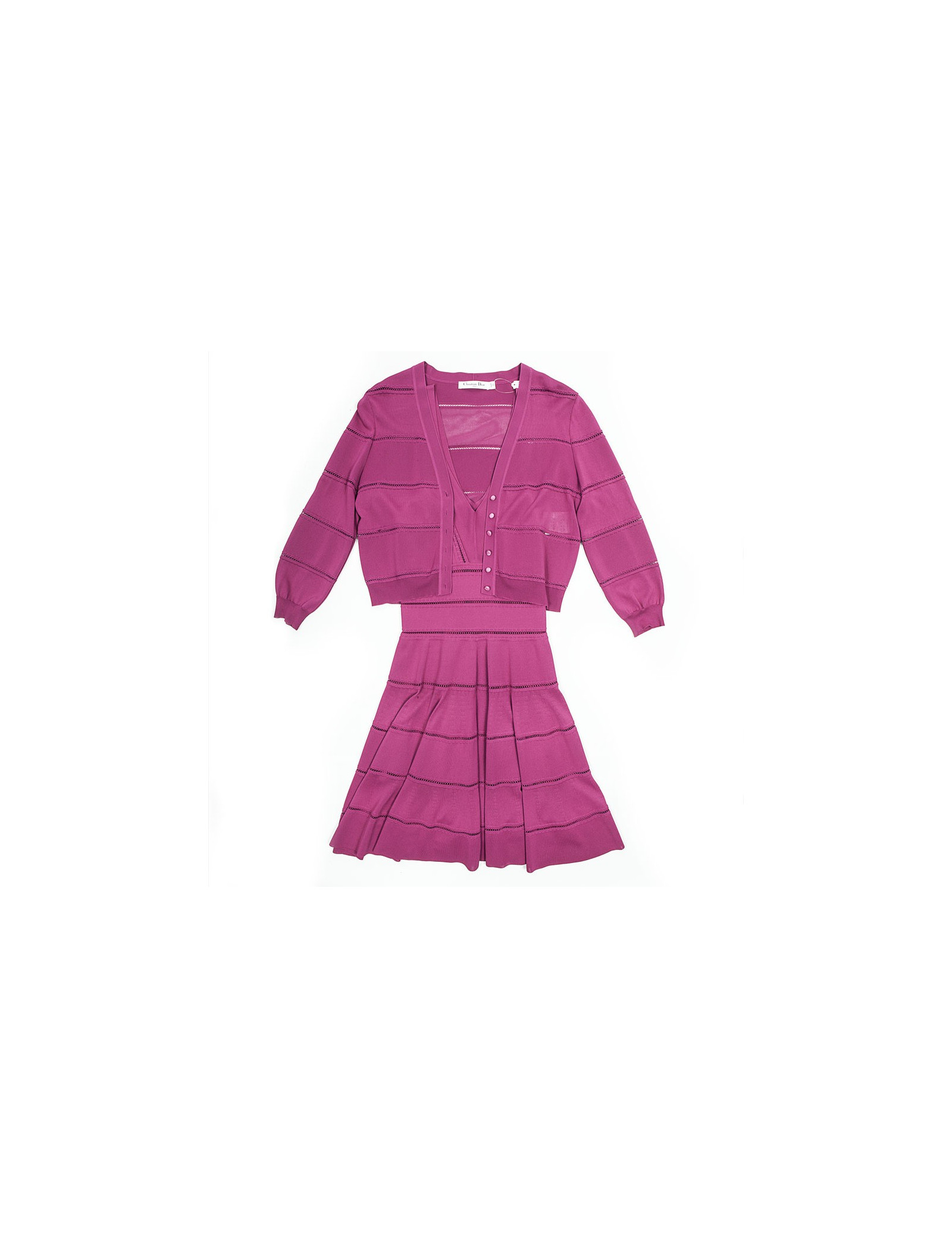 Sublime ensemble robe et gilet Christian Dior taille 38-40 de couleur rose fuschia en maille ajourée. La robe sans manches est de forme patineuse, elle marque bien la taille, elle se ferme par une fine fermeture zippée sur le côté. C'est une taille 38. Le gilet court à manches longues se ferme par six petits boutons Dior en nacre rose, c'est une taille 40. Cet ensemble est tout ce qui'il y a de plus ravissant. Les deux pièces sont en très bon état.