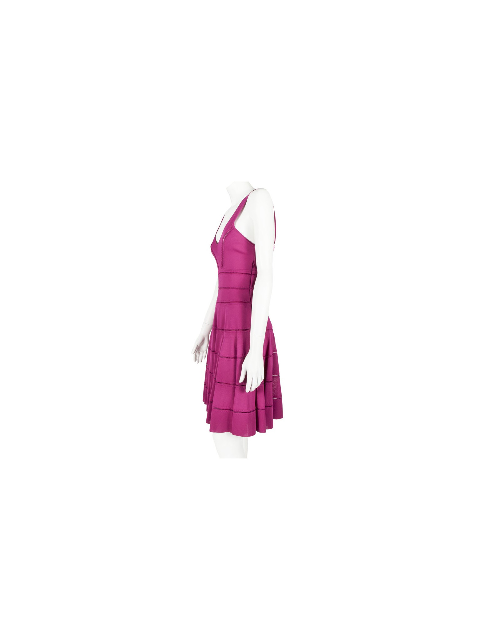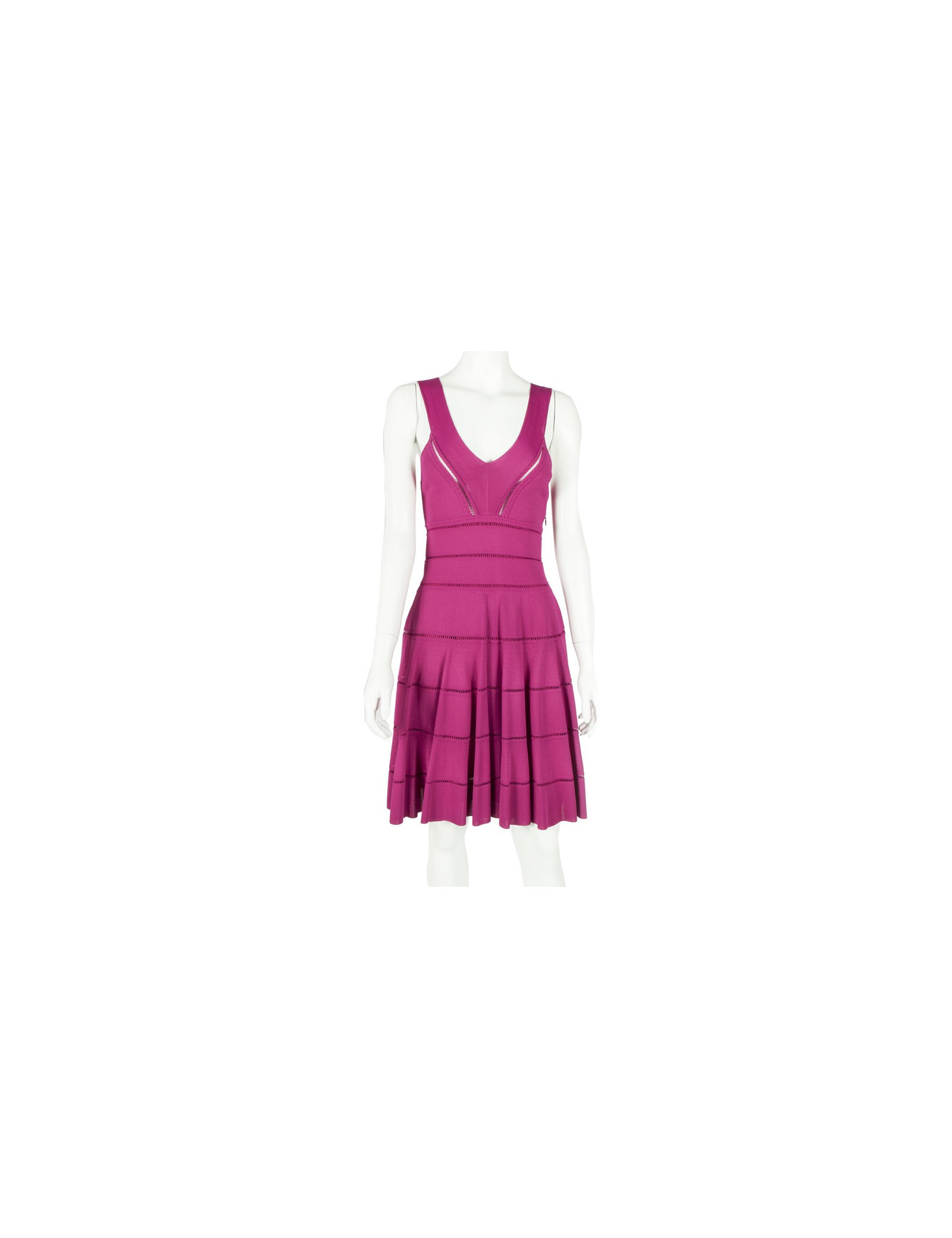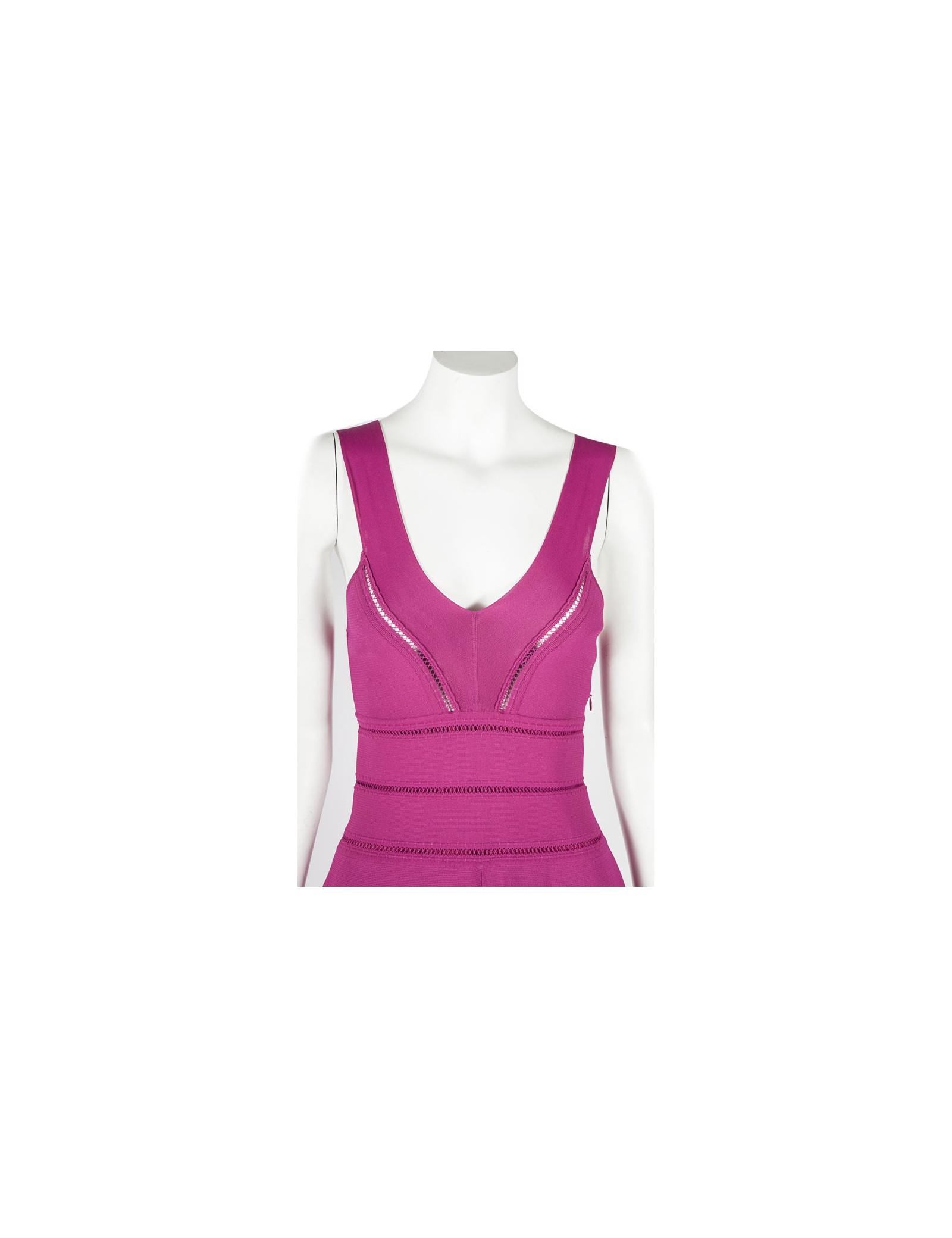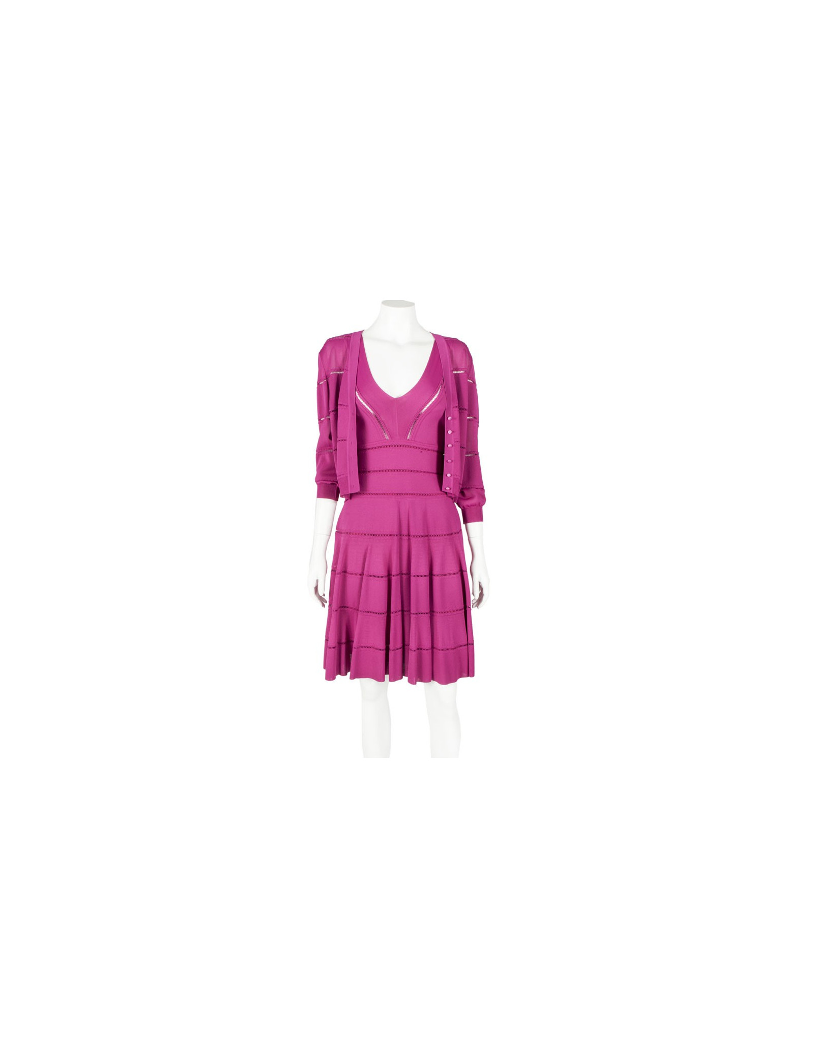 Sublime ensemble robe et gilet Christian Dior taille 38-40 de couleur rose fuschia en maille ajourée. La robe sans manches est de forme patineuse, elle marque bien la taille, elle se ferme par une fine fermeture zippée sur le côté. C'est une taille 38. Le gilet court à manches longues se ferme par six petits boutons Dior en nacre rose, c'est une taille 40. Cet ensemble est tout ce qui'il y a de plus ravissant. Les deux pièces sont en très bon état.