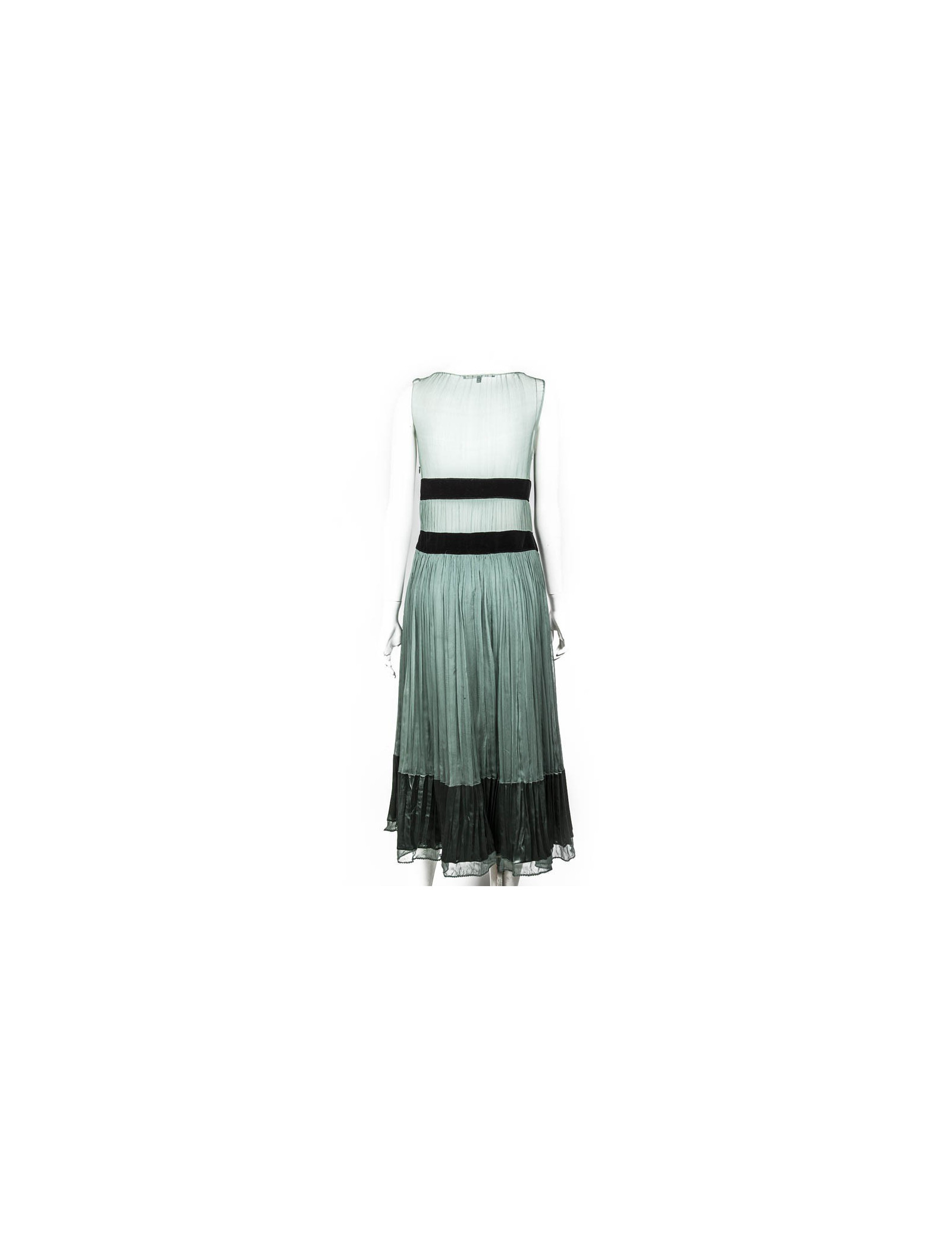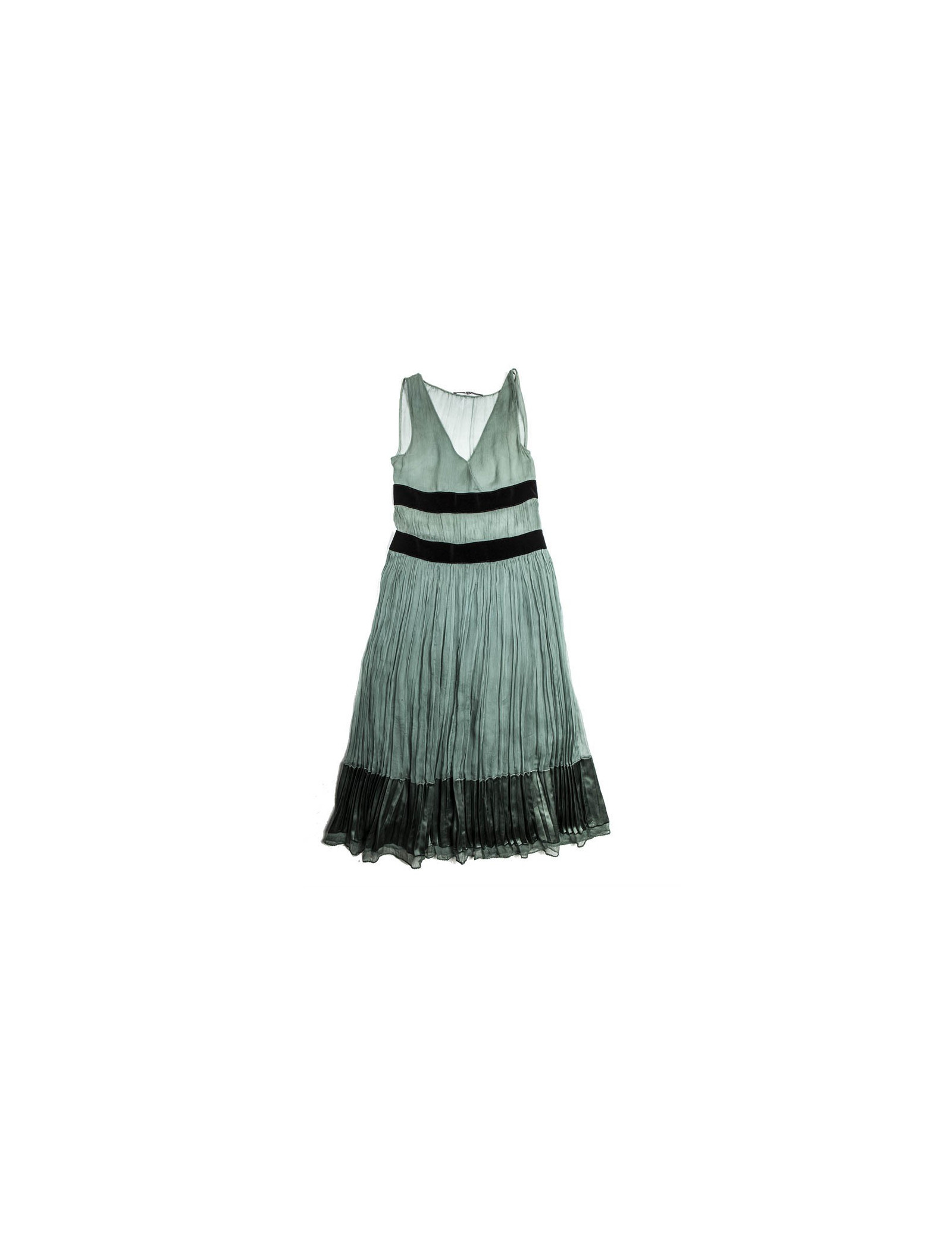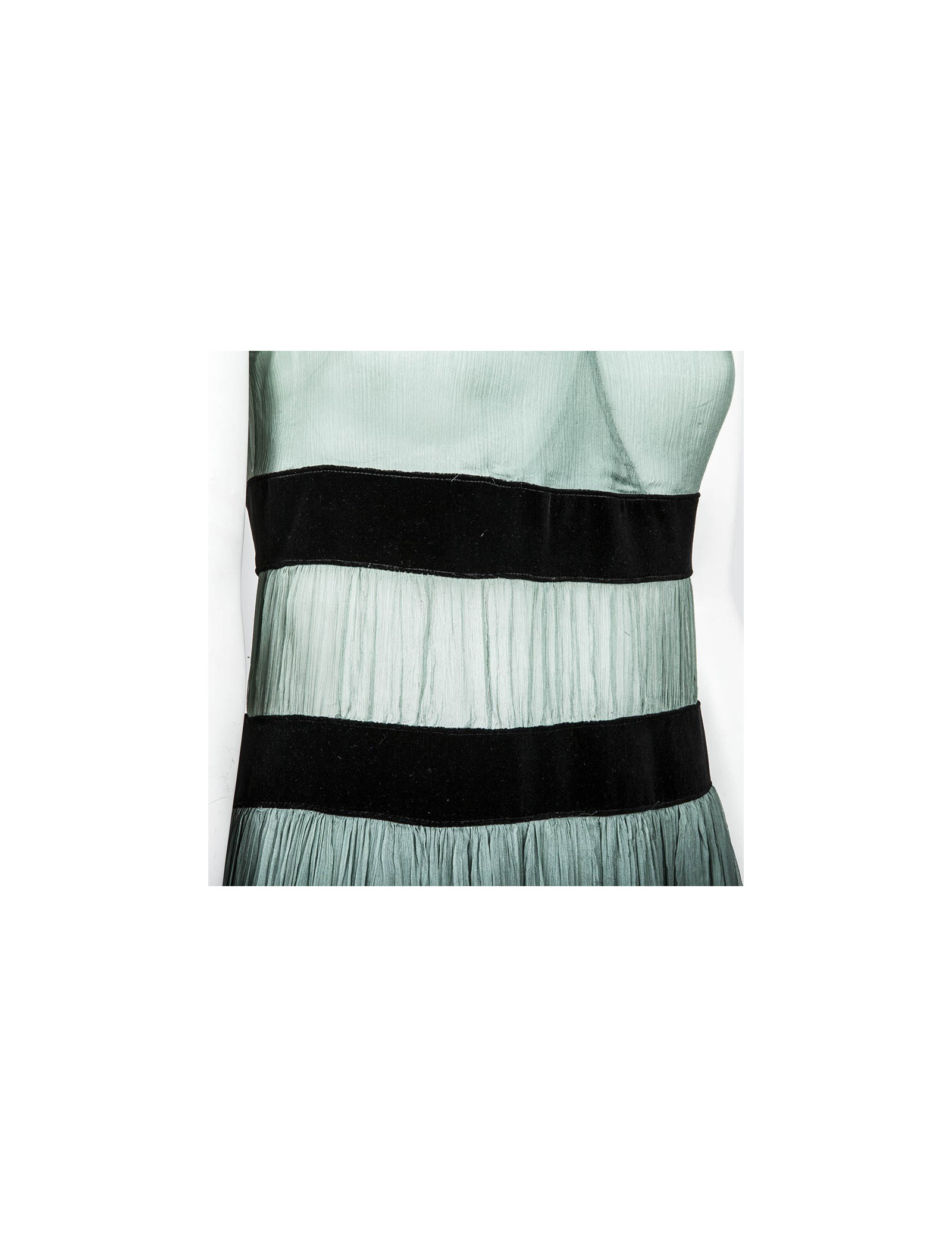 En pure soie, marquée à la taille de velour noir et soulignée d'un plissé soleil de satin au bas. Cette robe aux allures de déesse grecque est une aude à la féminité. En bon état. Quelques fils tirés.