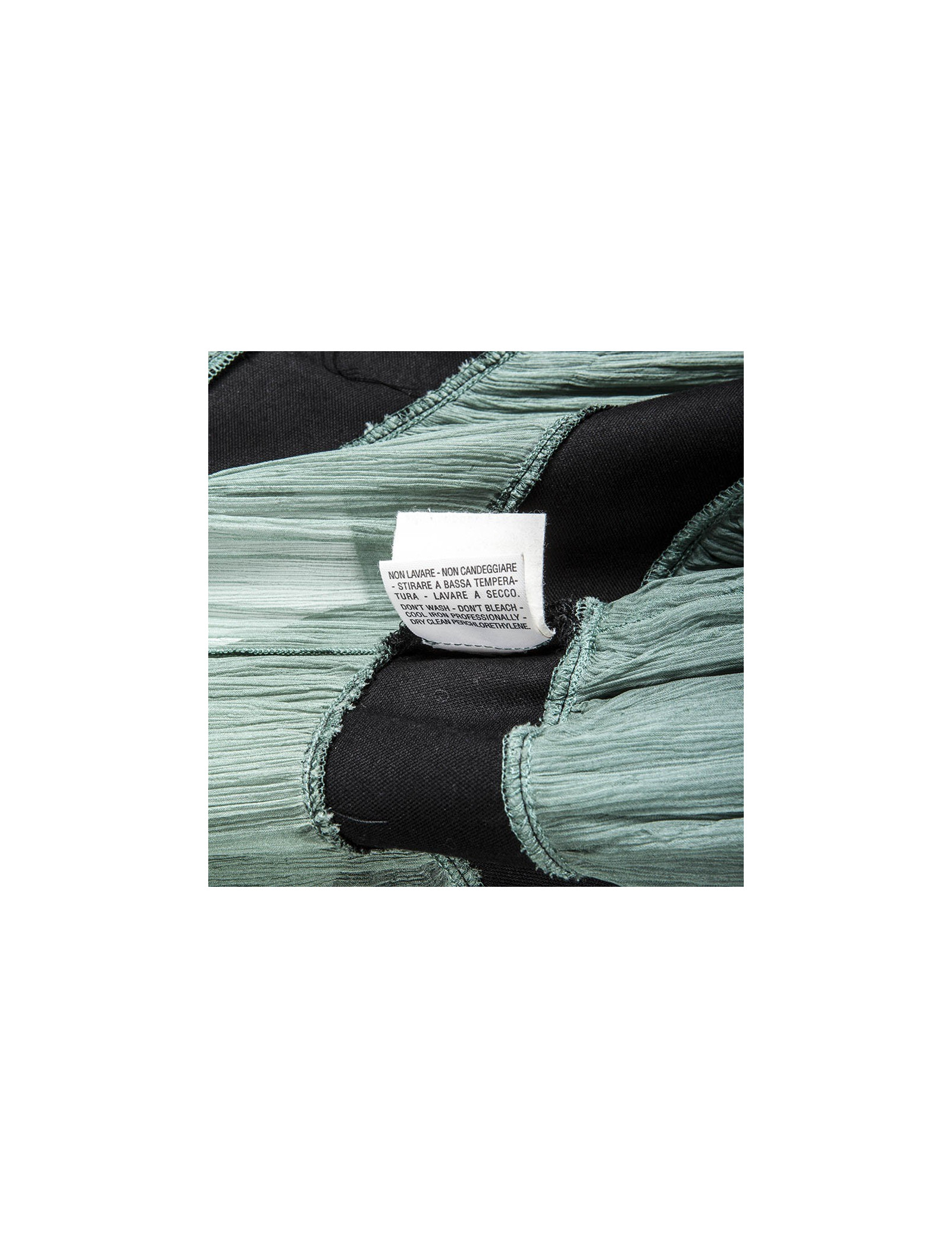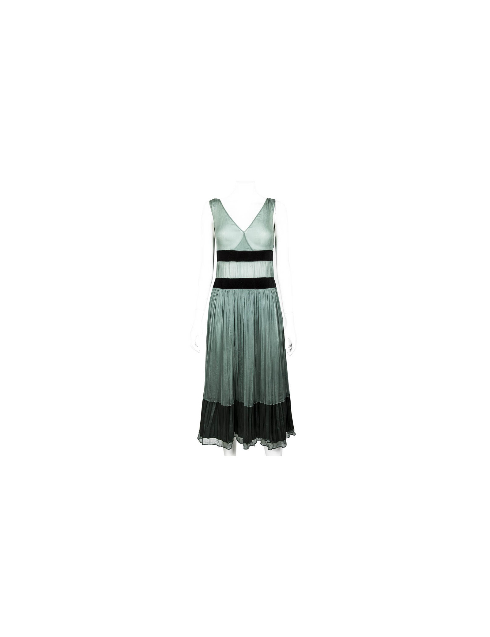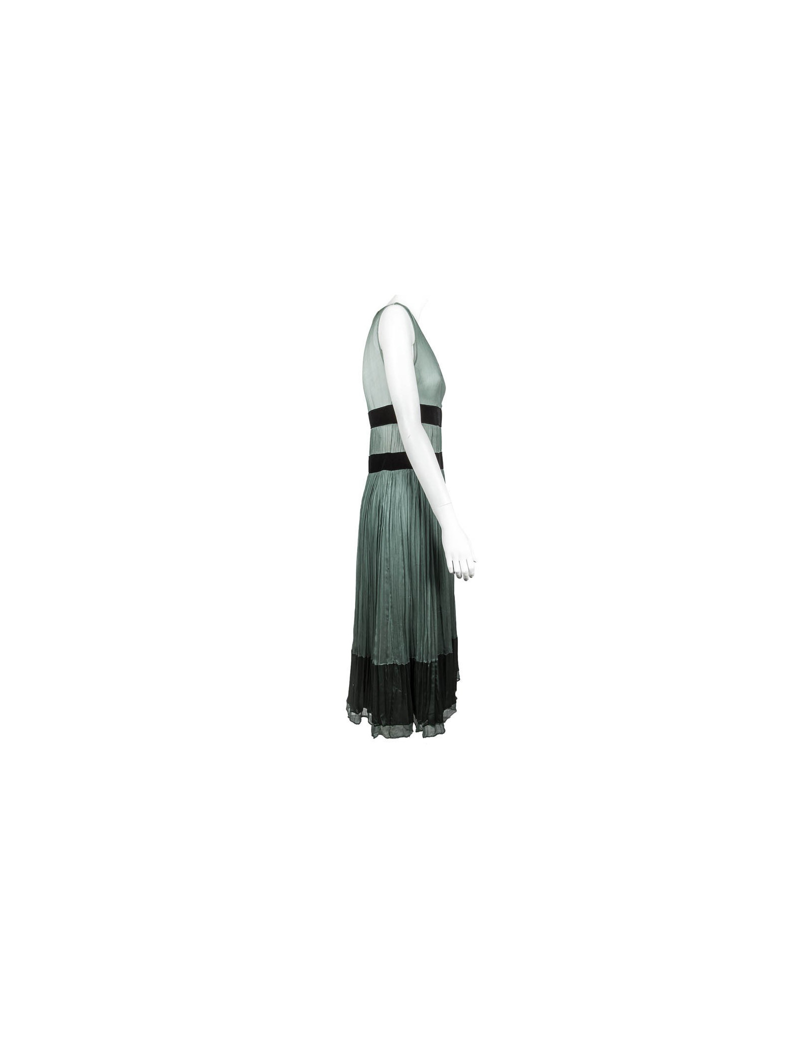 En pure soie, marquée à la taille de velour noir et soulignée d'un plissé soleil de satin au bas. Cette robe aux allures de déesse grecque est une aude à la féminité. En bon état. Quelques fils tirés.