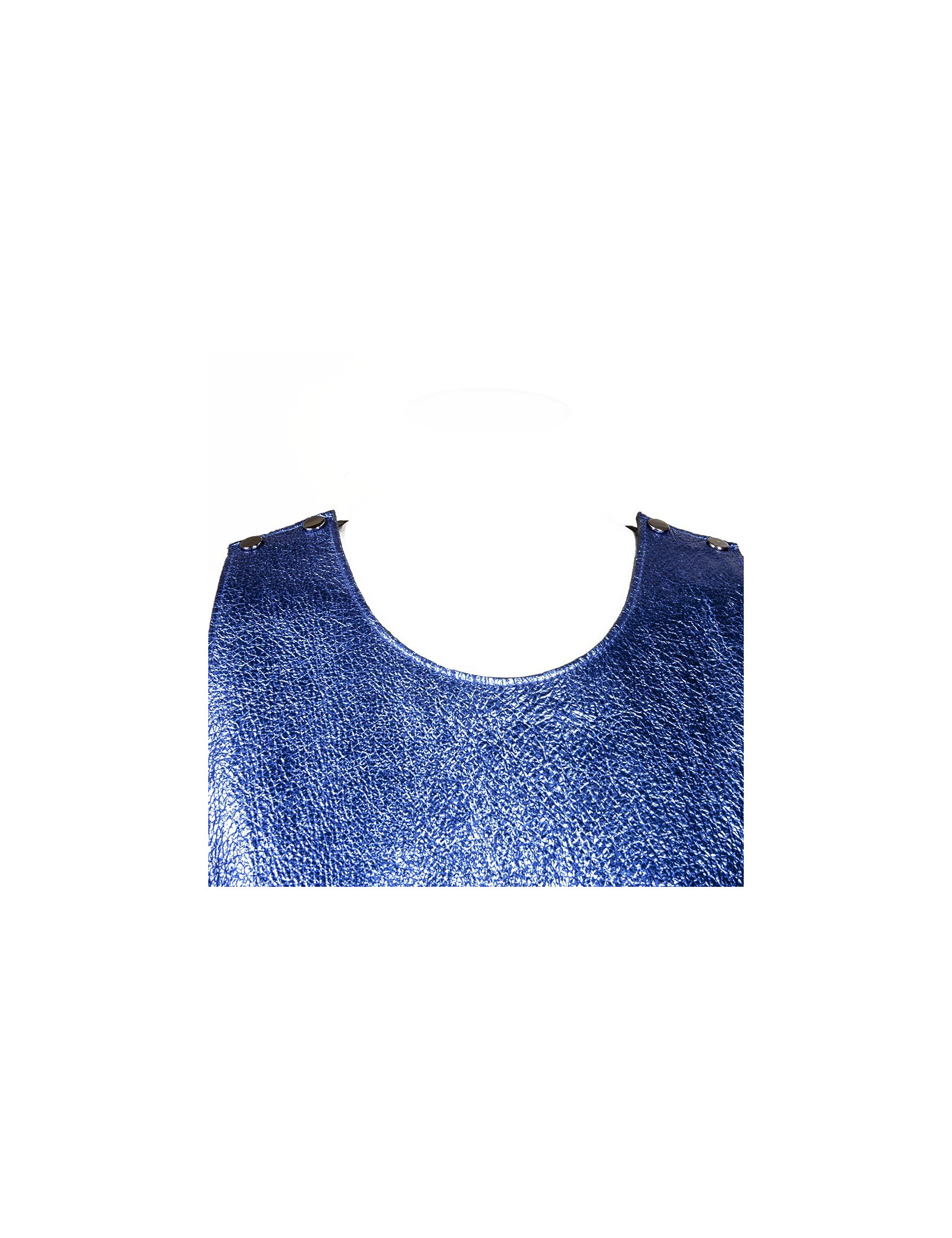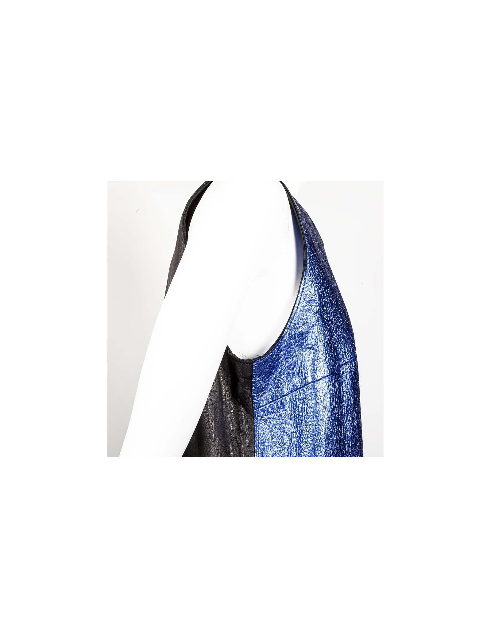 Robe taille 8 US / 40 FR, sans manches entièrement en cuir souple grainé. De couleur bleu électrique métallisé à fermeture dorsale zippée, ornée d'une paire de boutons pression métalliques sur chaque épaule. L'arrière est en cuir souple noir. En très bon état.