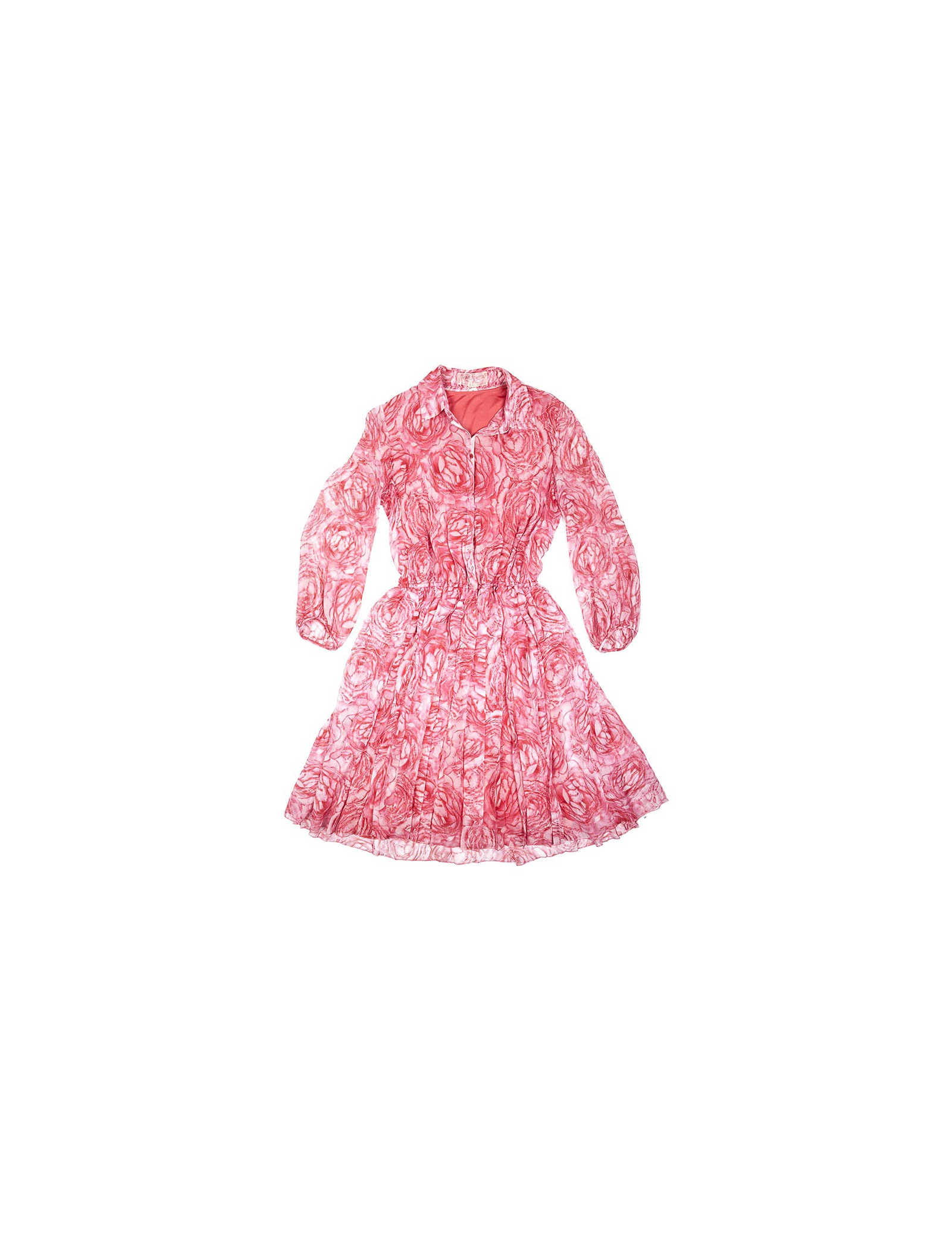 La taille est marquée par un élastique, les manches sont amples et resserrées au poignet, le bas de la robe est froncé.