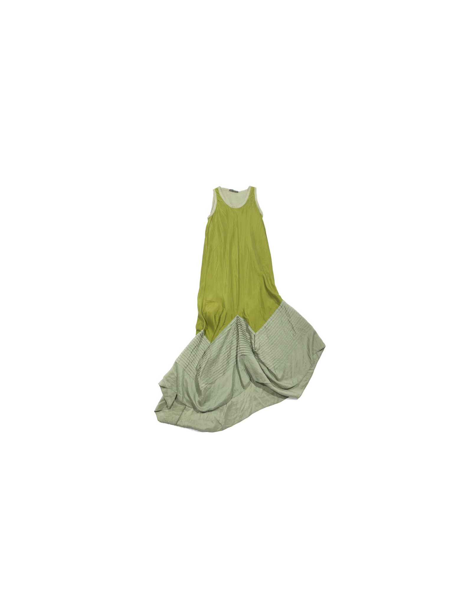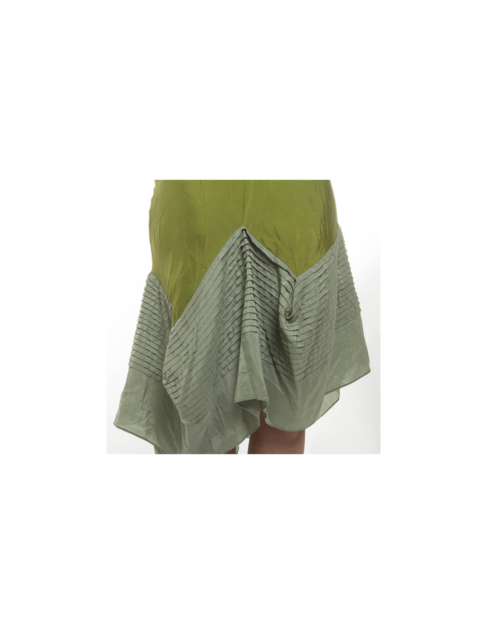 Robe sans manches en soie verte Alexander McQueen taille 38. Coupe droite en soie doublée de coton chiné, fond plissé (voir photo).