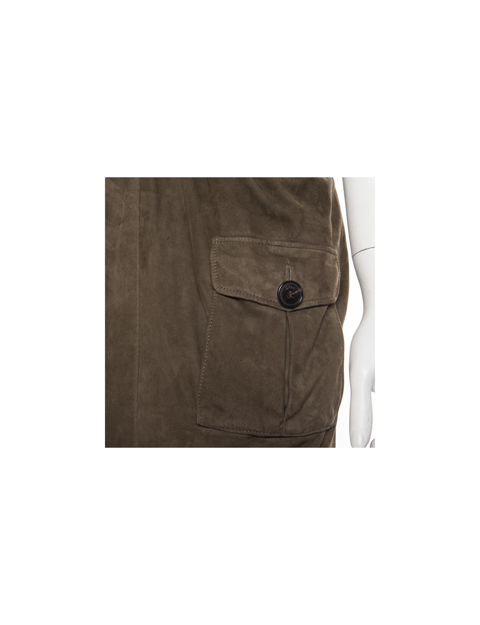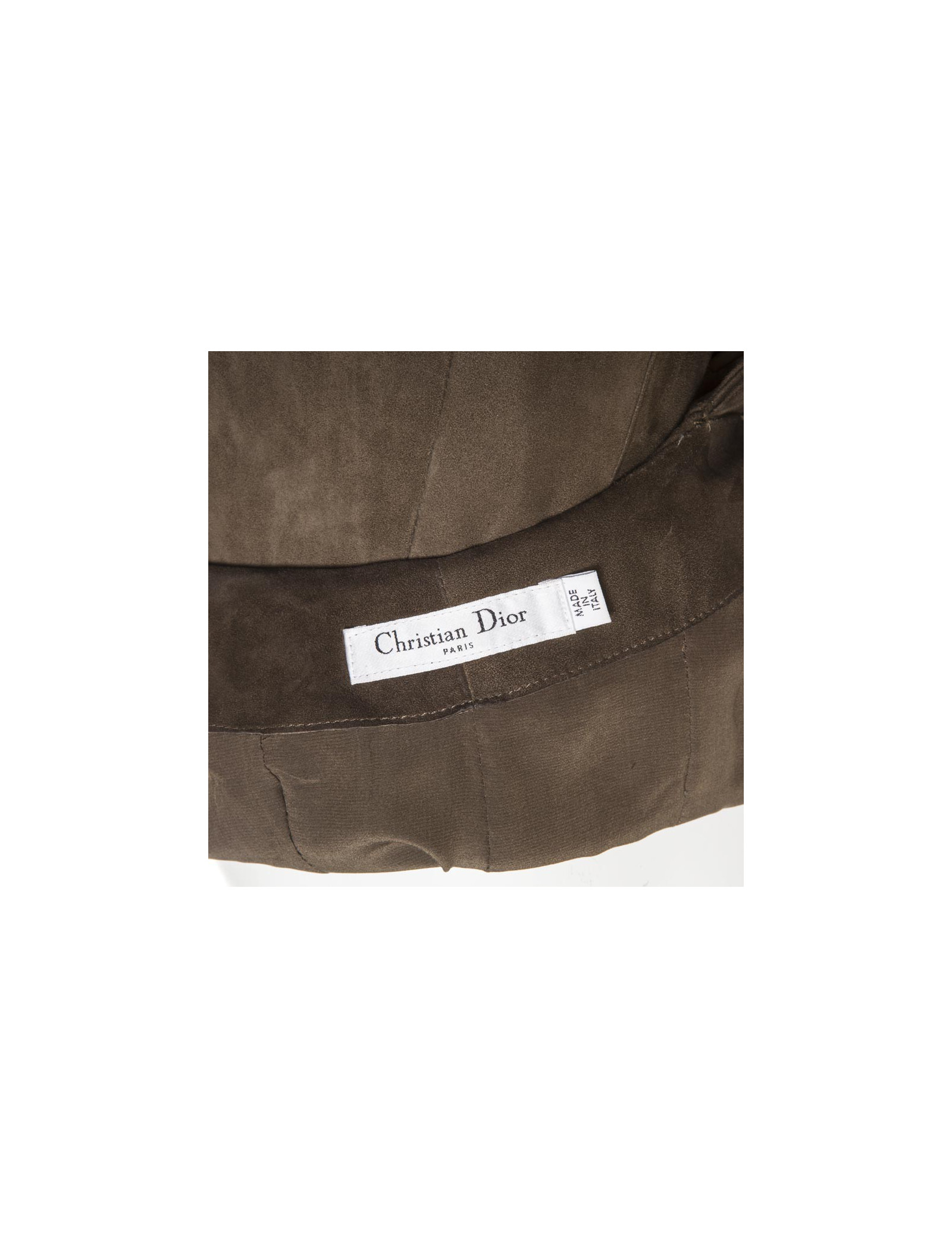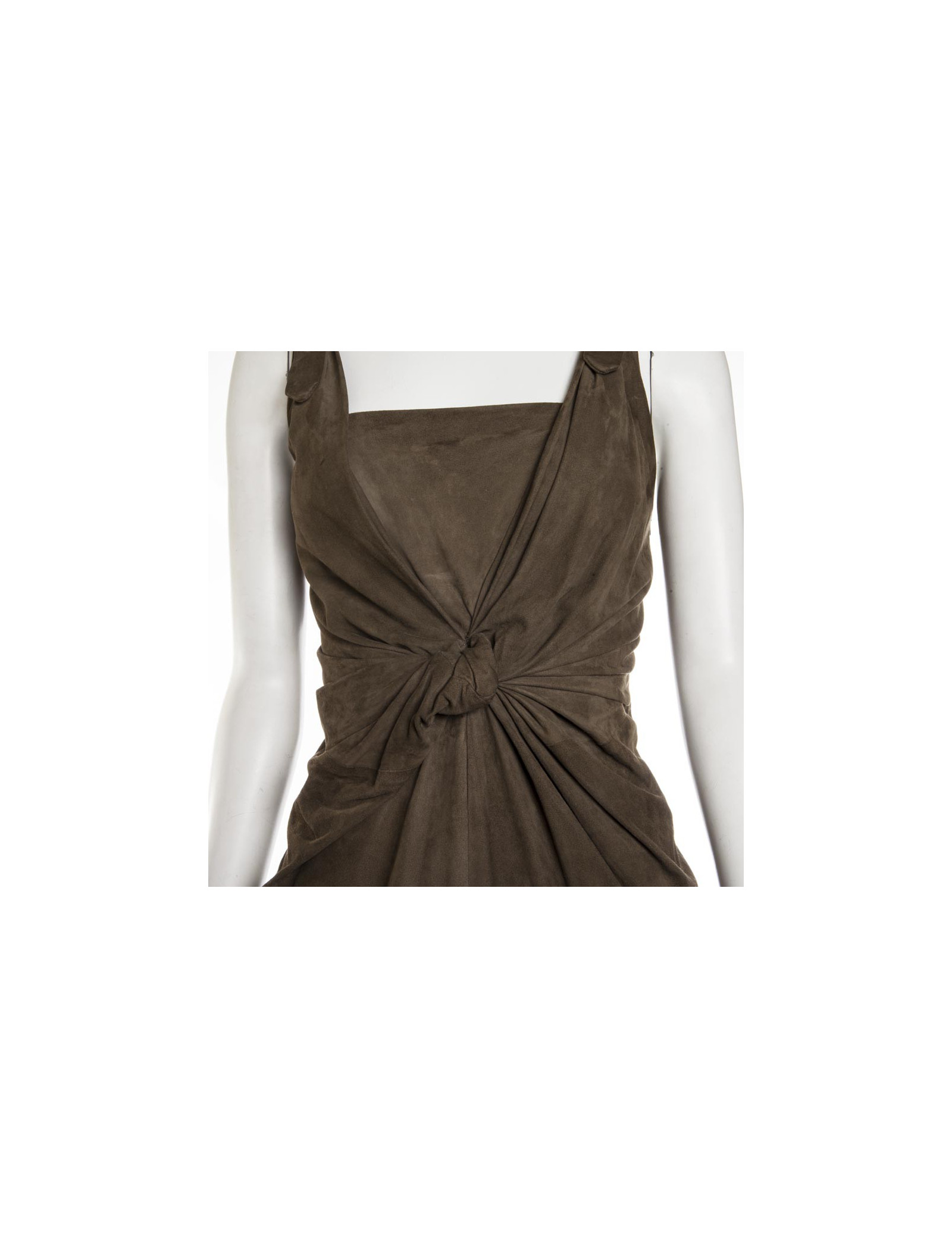 Robe à bretelles en daim kaki Christian Dior taille 36. Les bretelles, à crans, sont attachées chacune par une paire de boucles dorées siglées "Christian Dior". Cintrée, elle est drapée grâce à un noeud au niveau de la poitrine. Doublée de soie kaki, composée de deux poches fermées à boutons siglés Dior.
