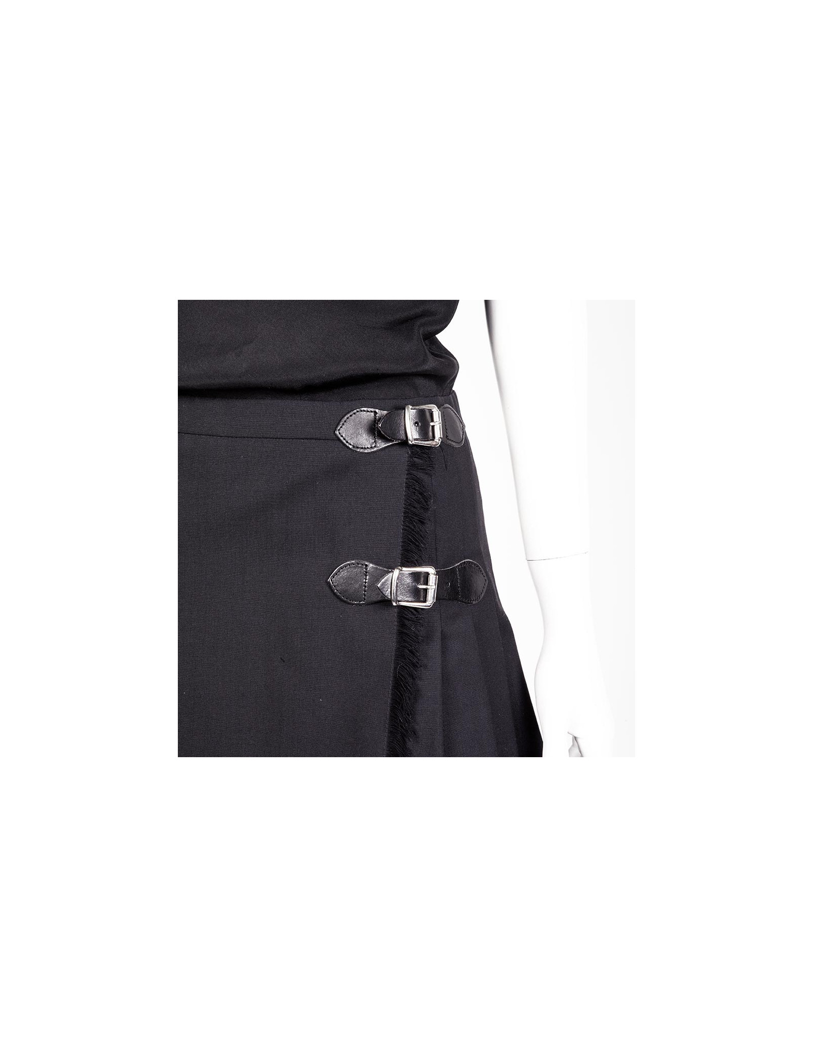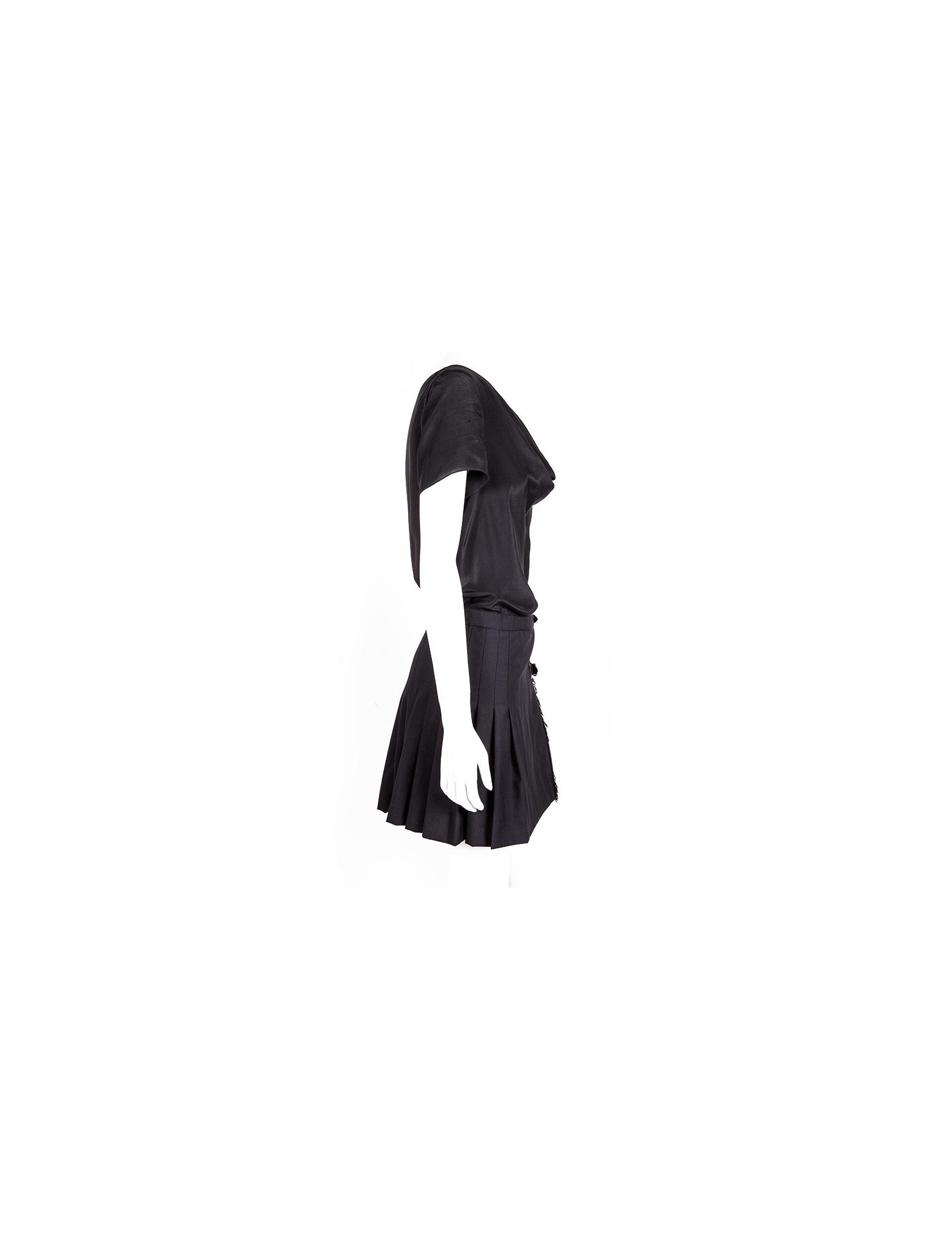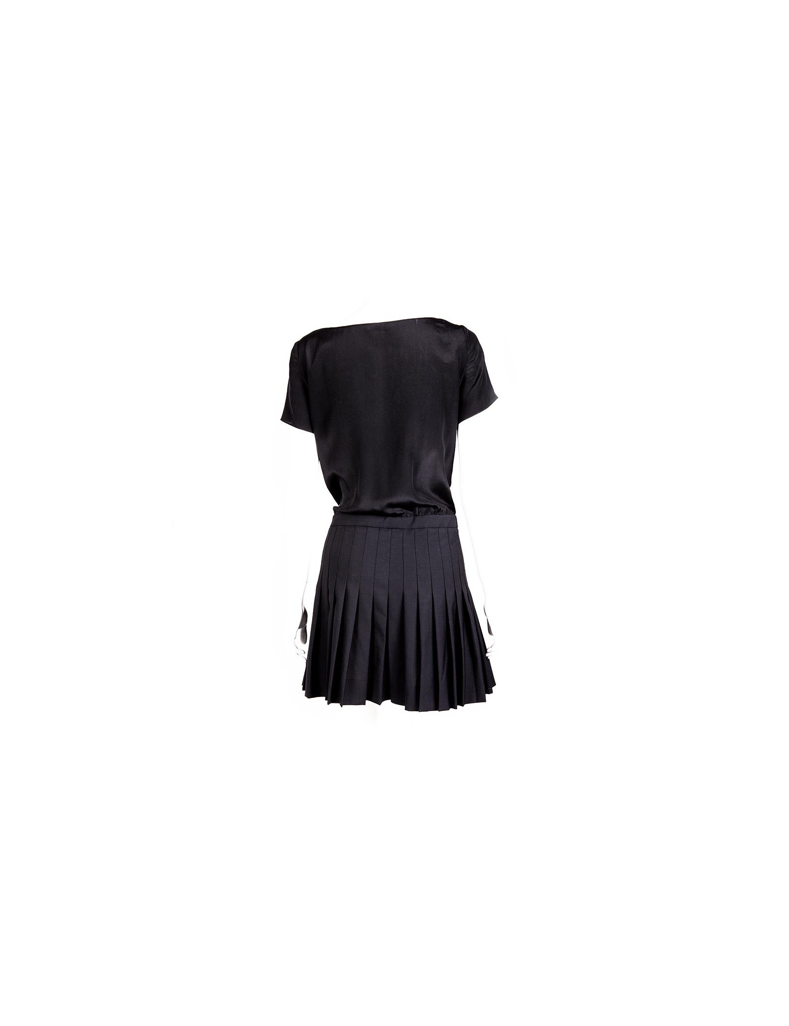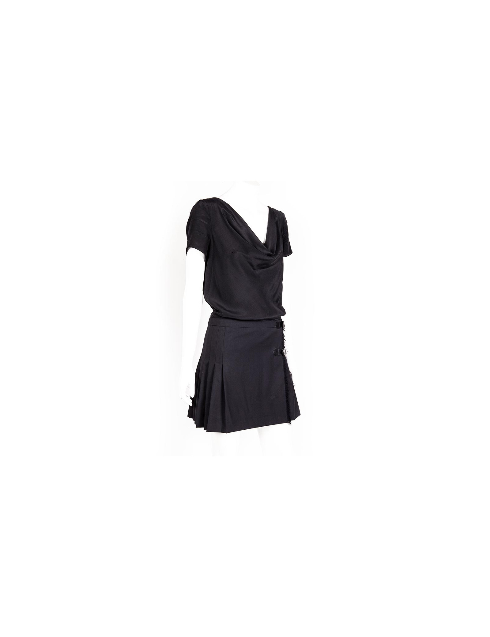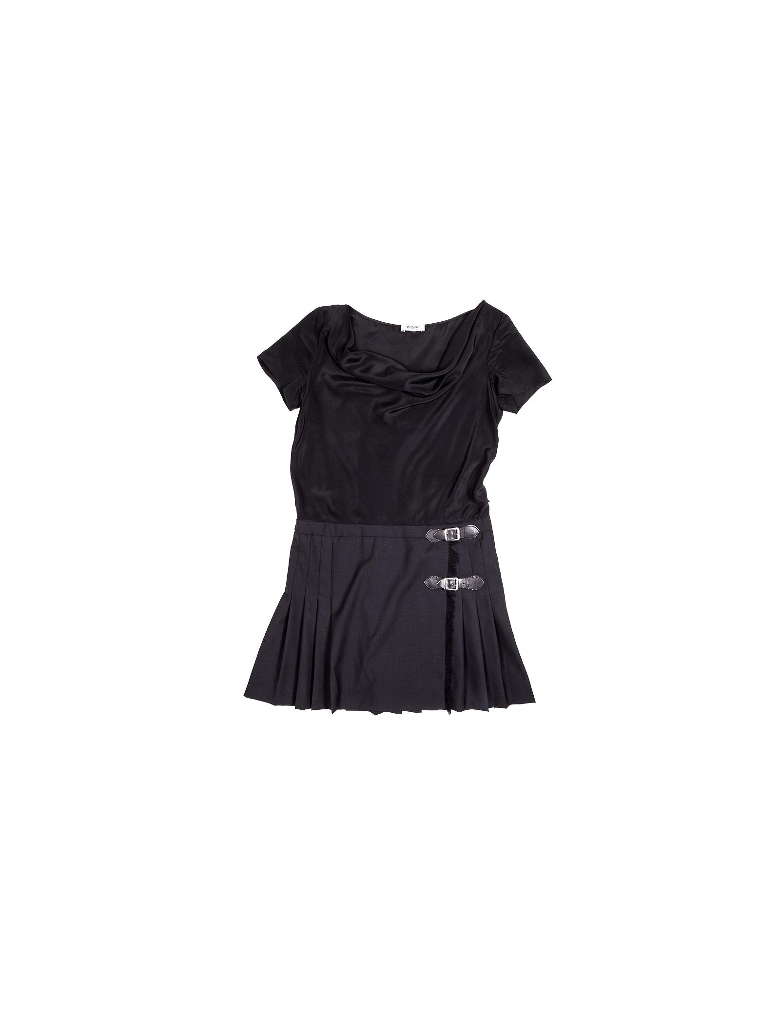 Robe à manches courtes noire Moschino taille 36 FR, composée de deux tissus, le haut en mousseline de soie, orné d'un décolleté drapé et le bas en laine, plissé, zippé sur le côté.