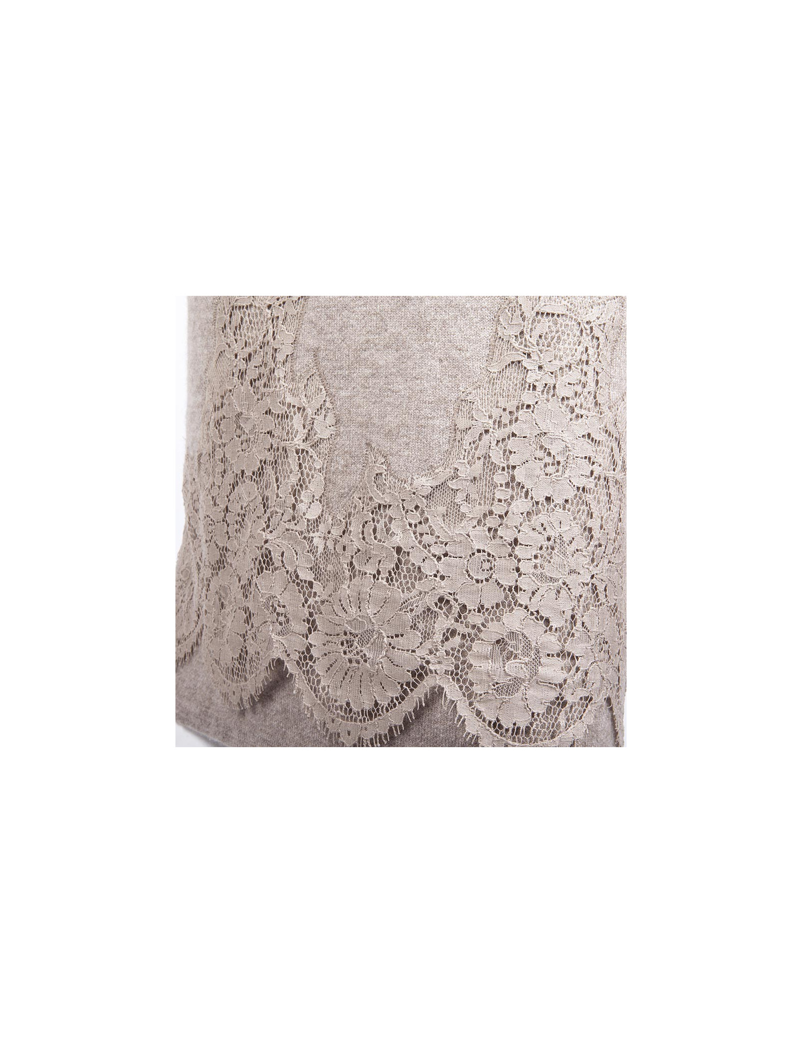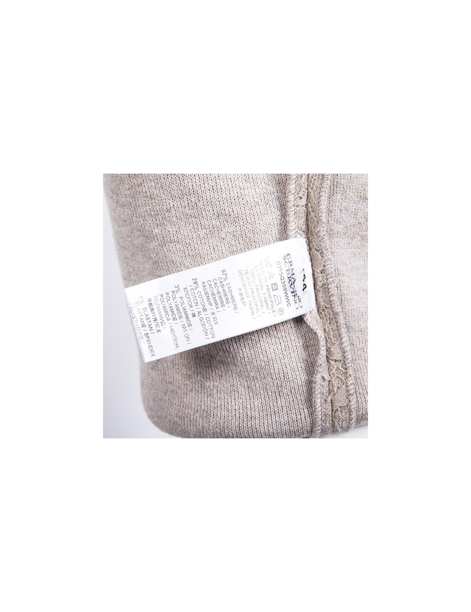 Robe longue fourreau sans manches en cachemire Ermanno Scervino taille 44 Italienne, correspondant à une taille 40 française. La robe est ornée de pièces de dentelle beige sur la partie inférieure. Simple et élégante, elle est zippée sur le côté gauche.