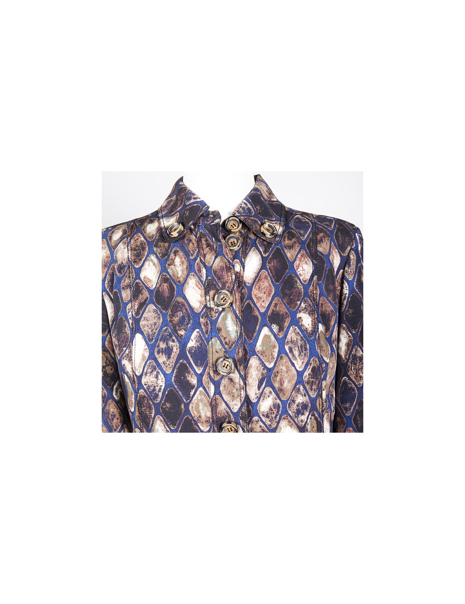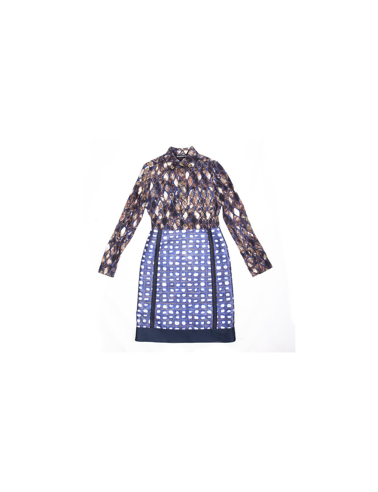 Le haut de la robe est dans un tissu en soie différent, donnant l'illusion d'une blouse. Boutons en corne. Couleurs : bleu, marron, beige, gris.