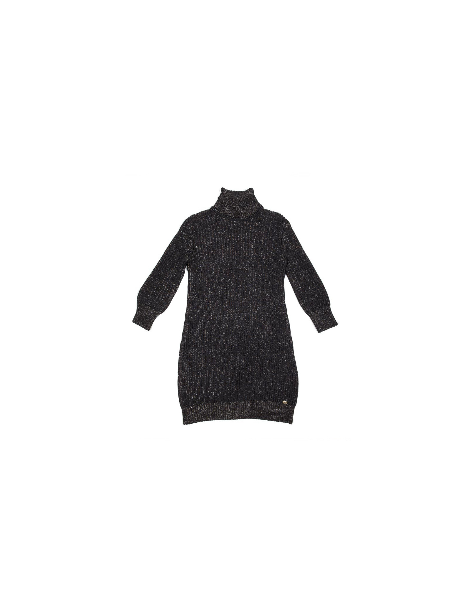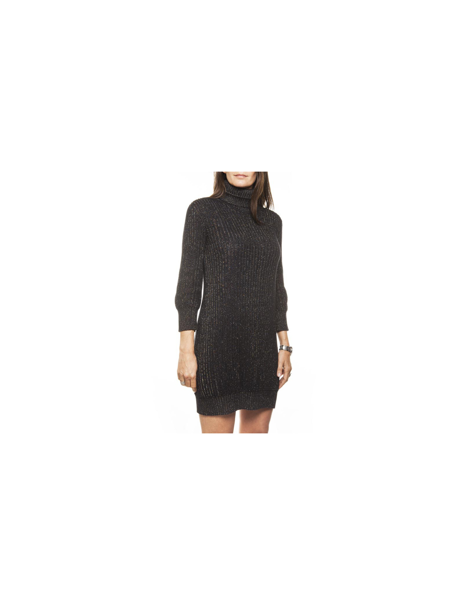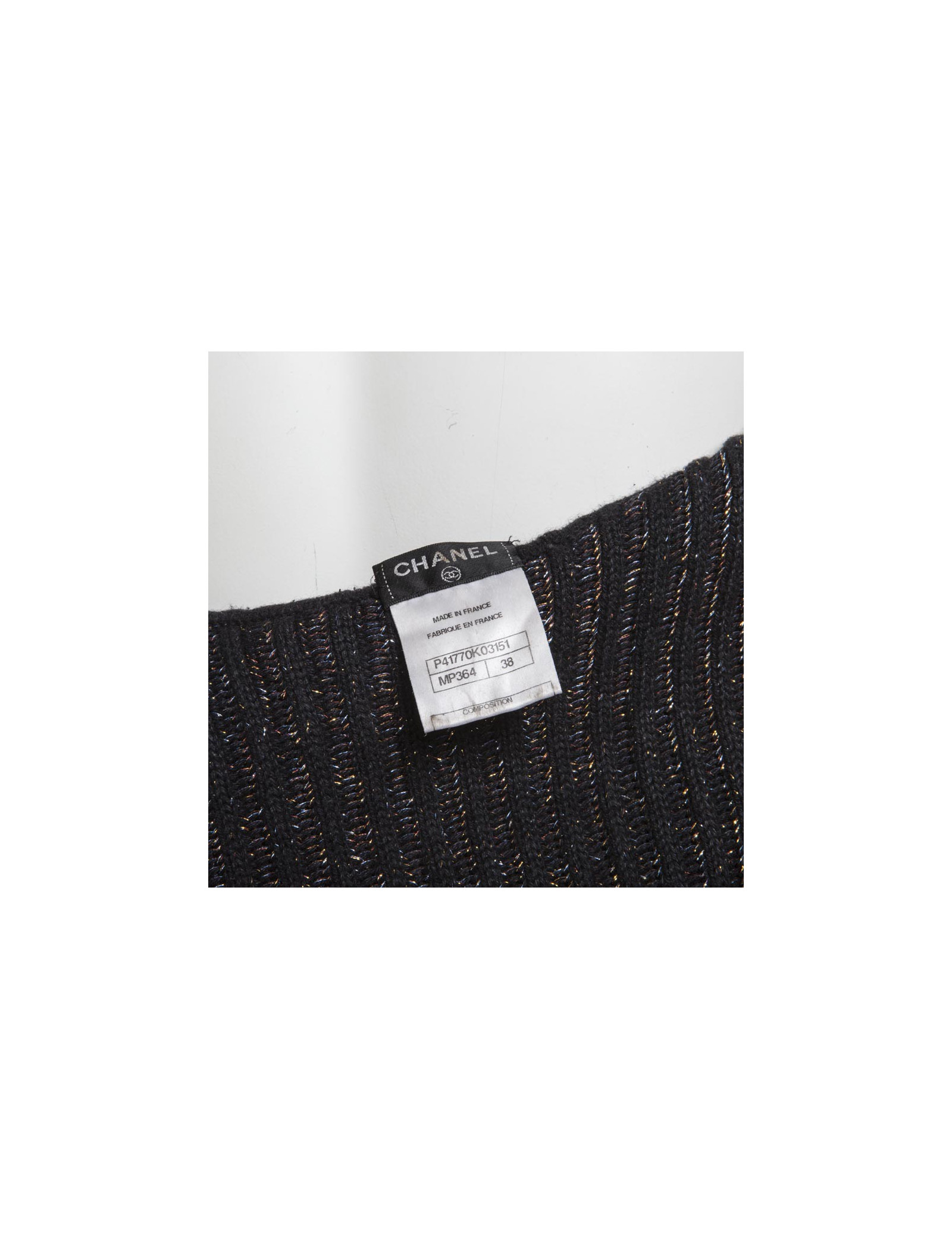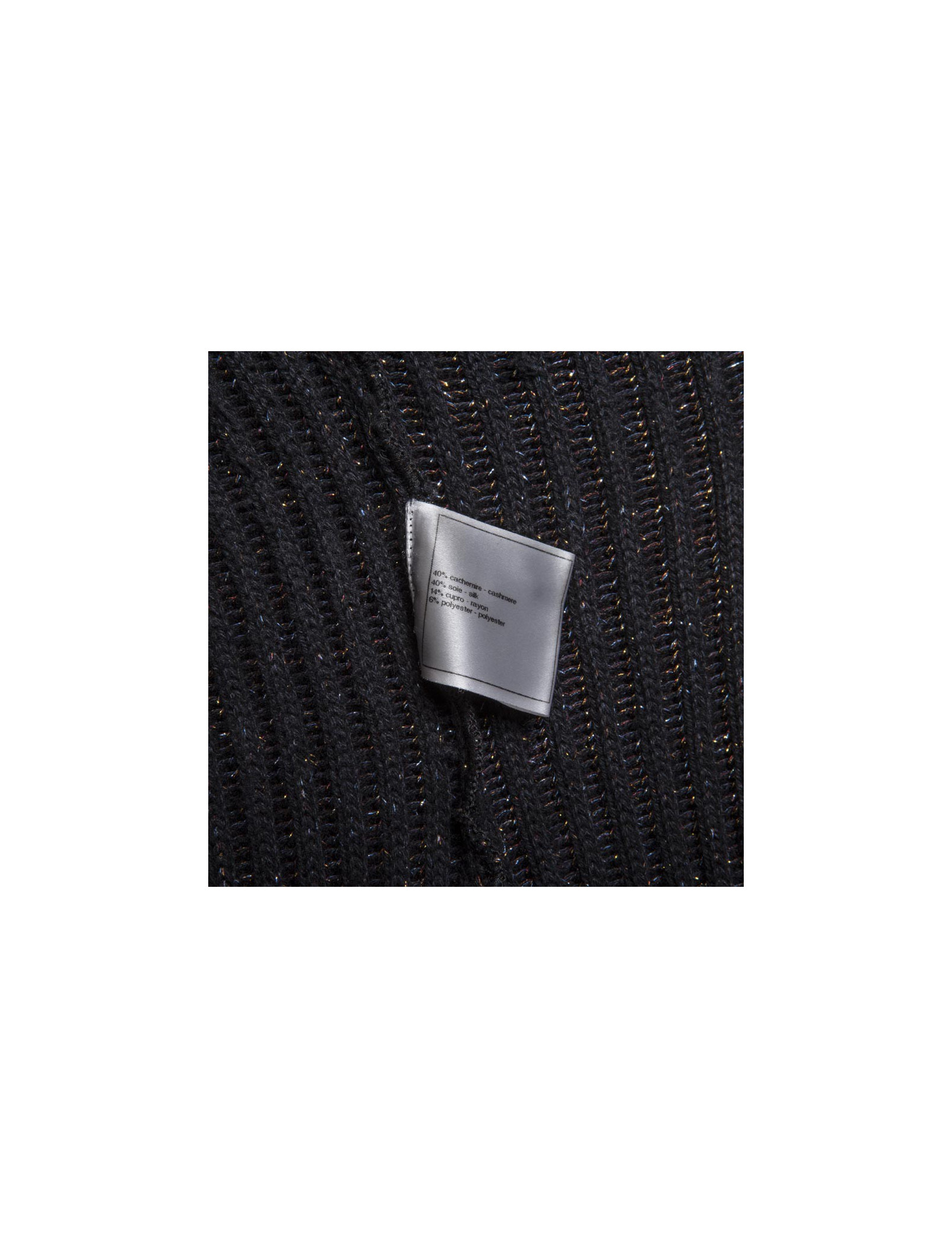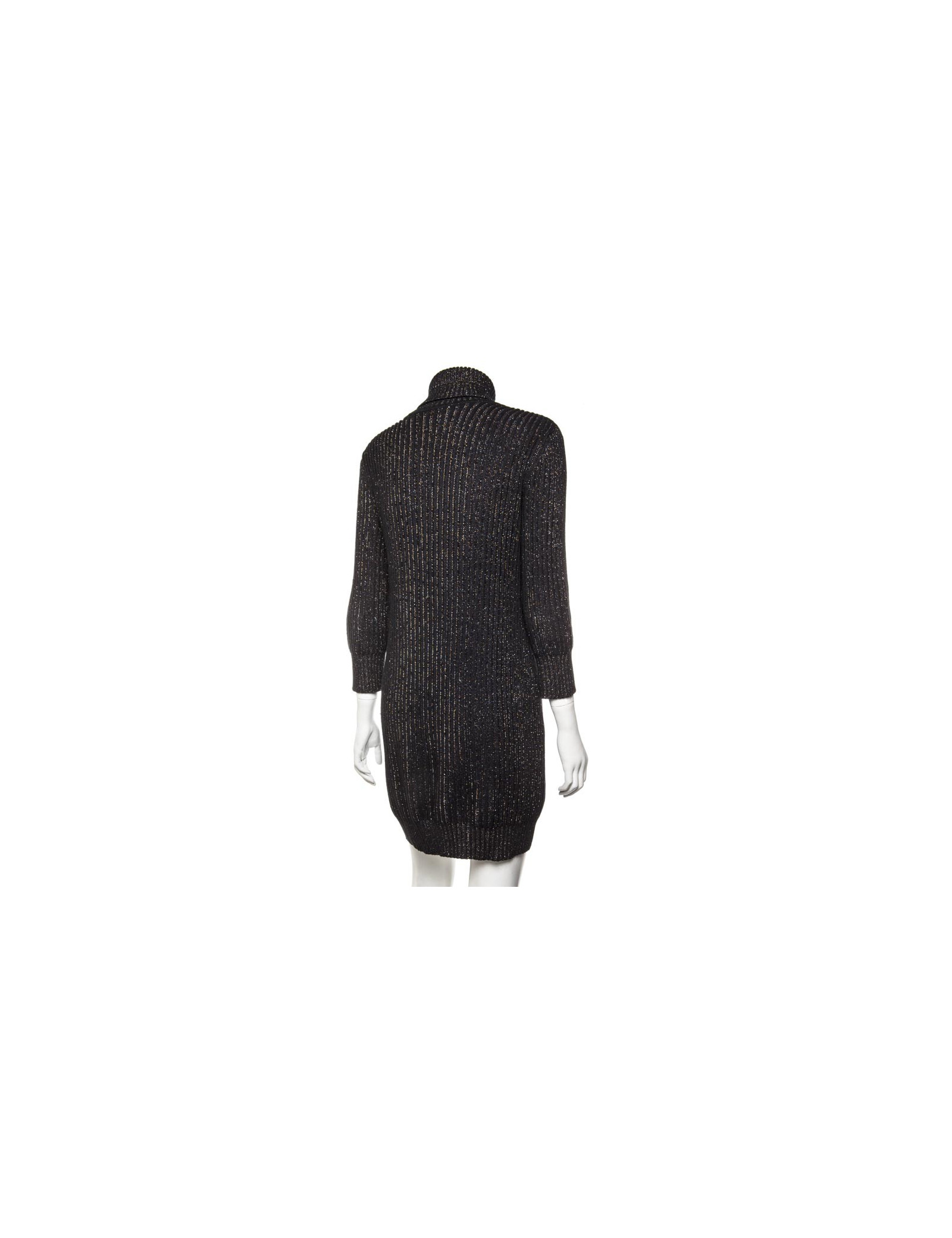 Collection récente. Robe en maille côtelée marron col roulé Chanel, cachemire et soie noir et fils de lurex multicolores, en très bon état. un mini écusson en métal or cuivré vieilli gravé "CC", cousu en bas de la robe a gauche.
