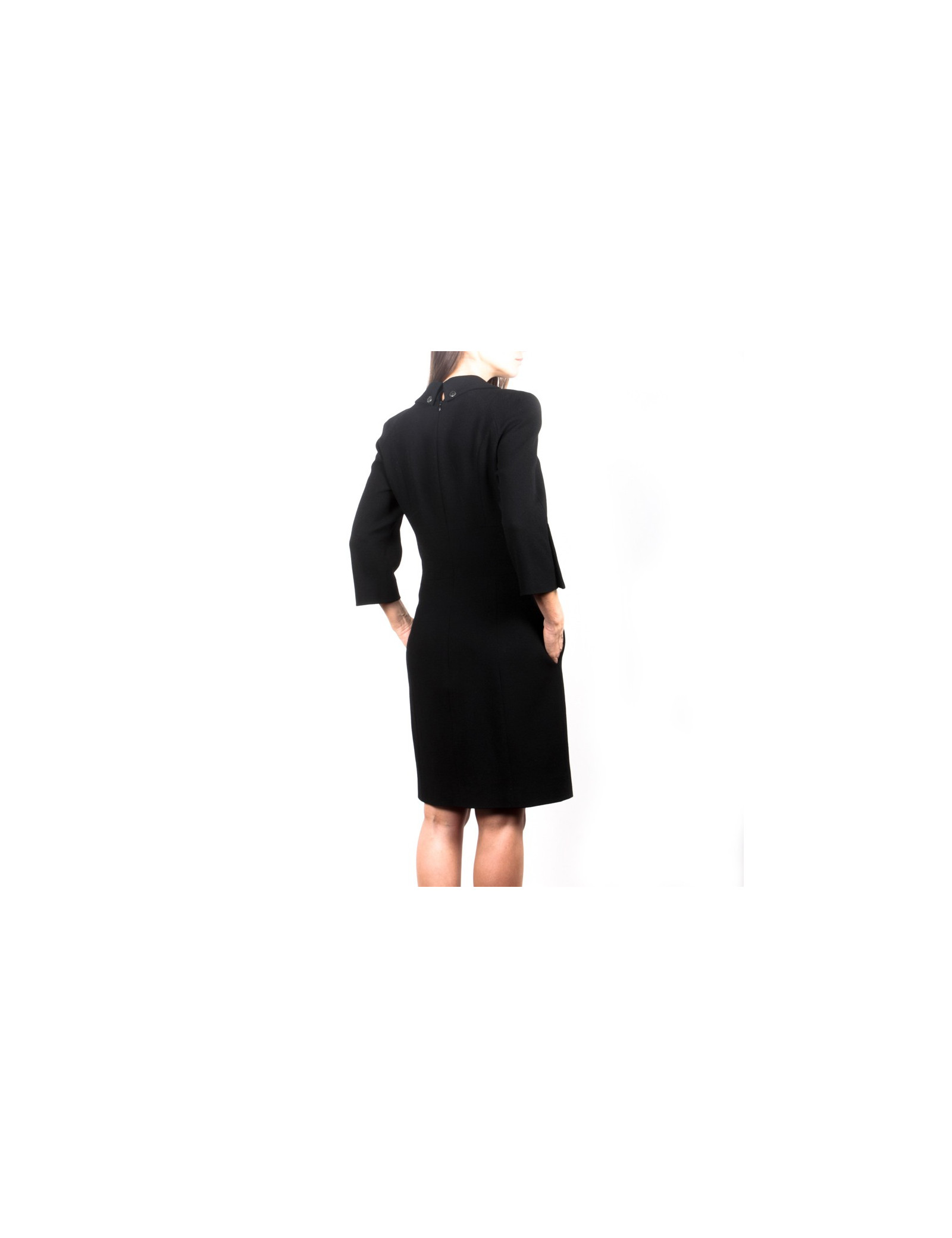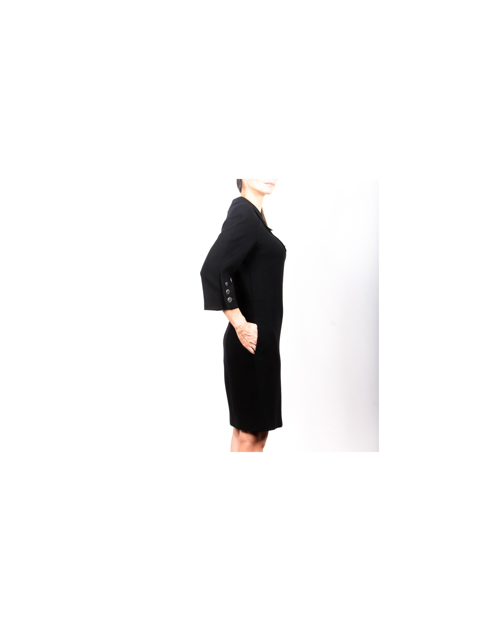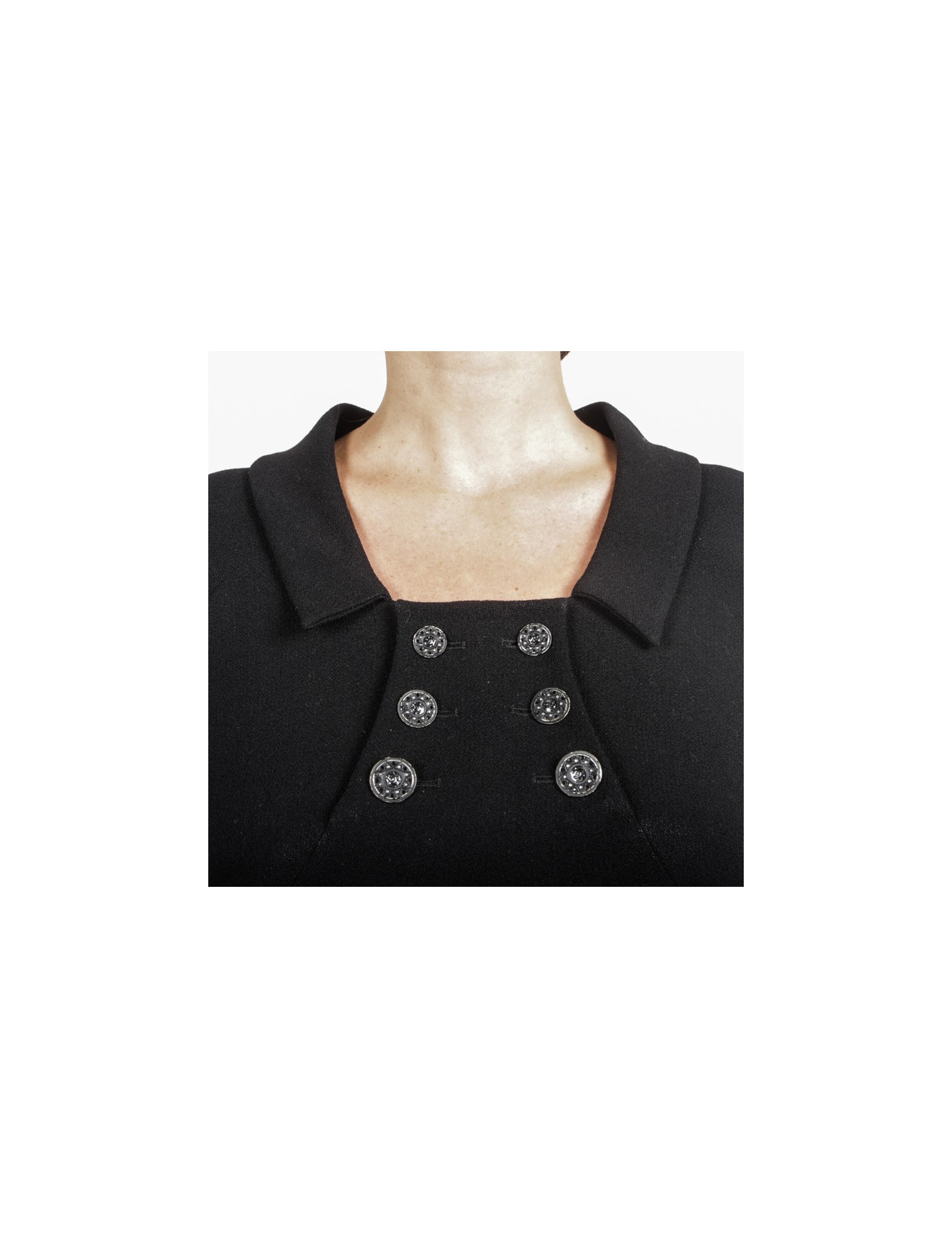 Robe Chanel en laine noire avec des découpes et 2 poches verticales sur les cotés.