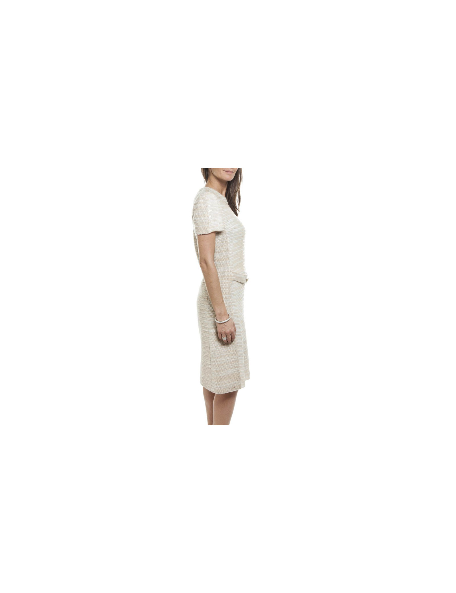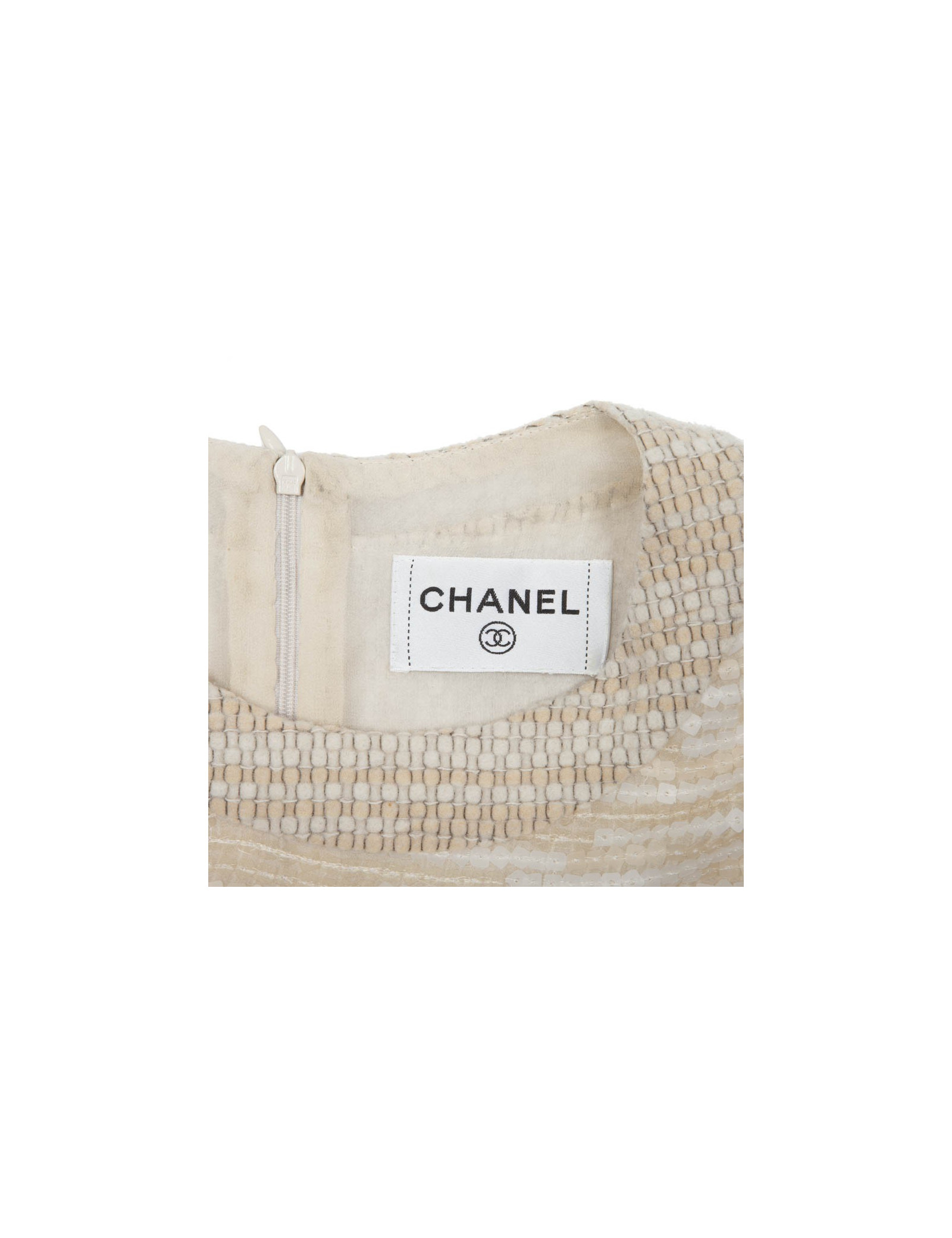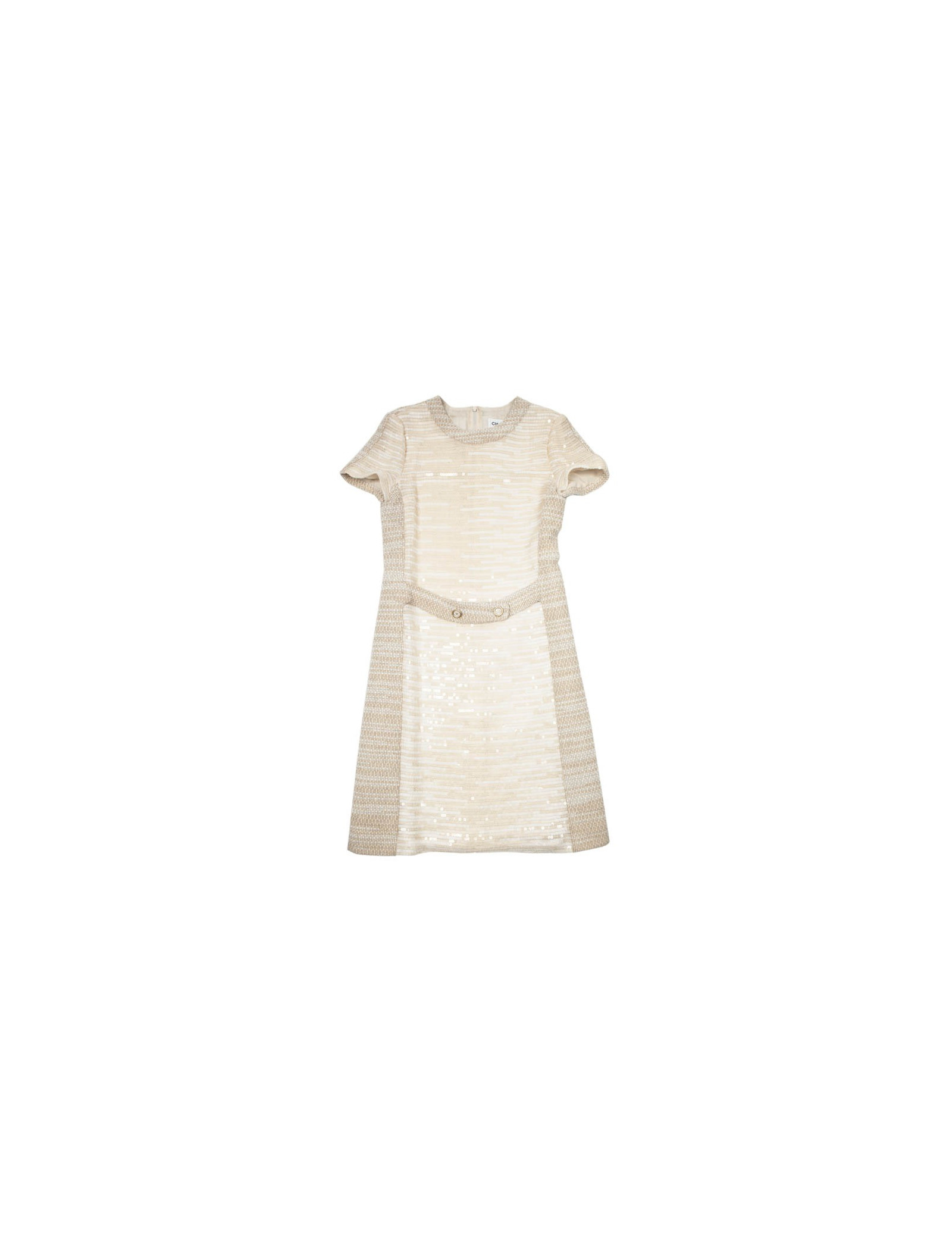 Robe en tweed laine et mohair dans les tons beige, agrémentée sur la partie avant de sequins du même ton. Fermeture zippée dans le dos.