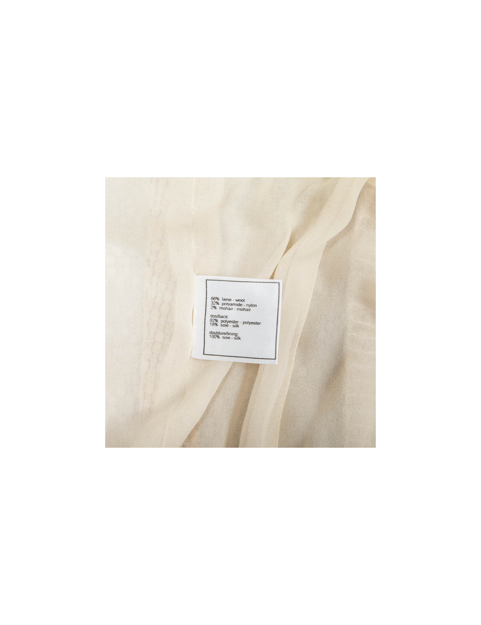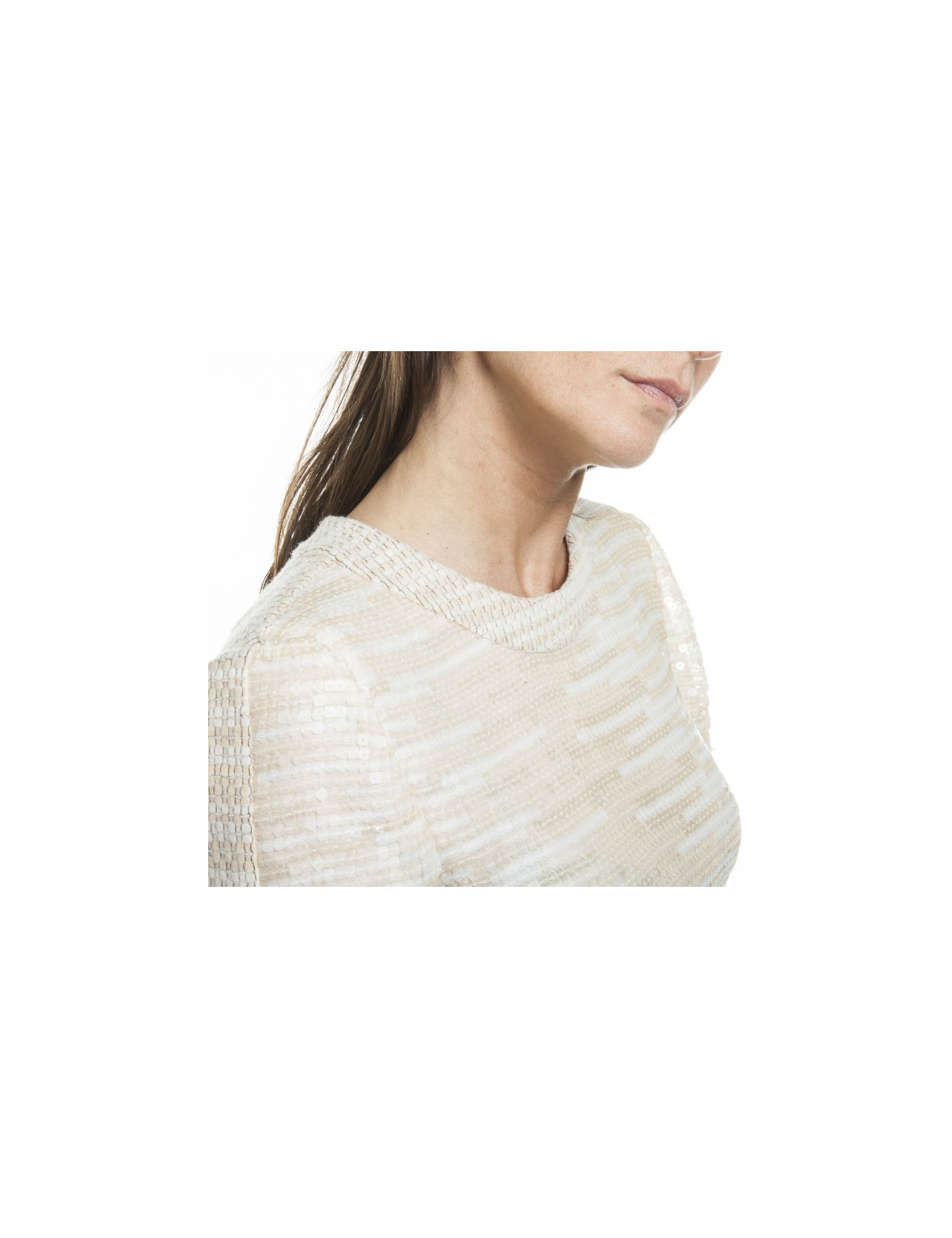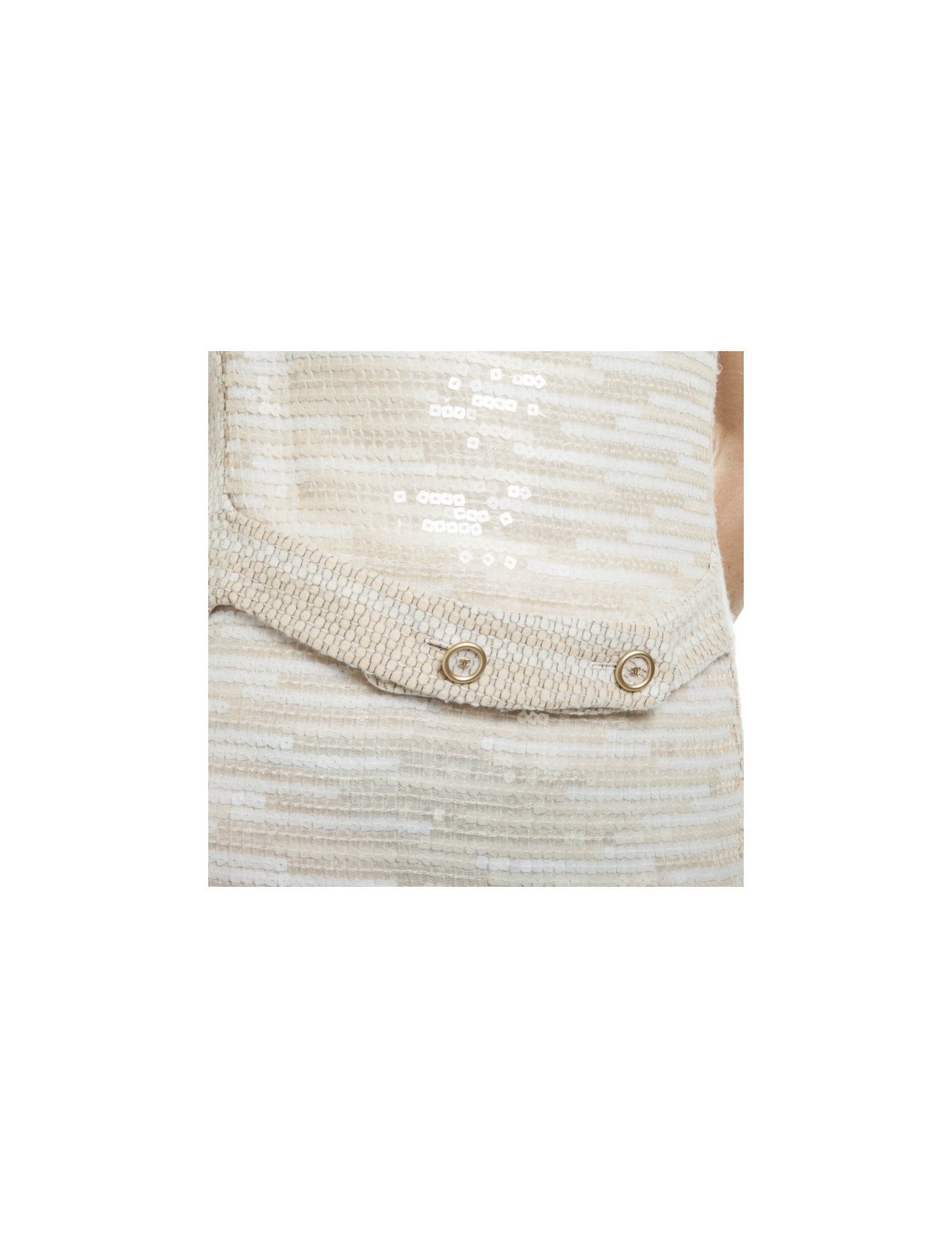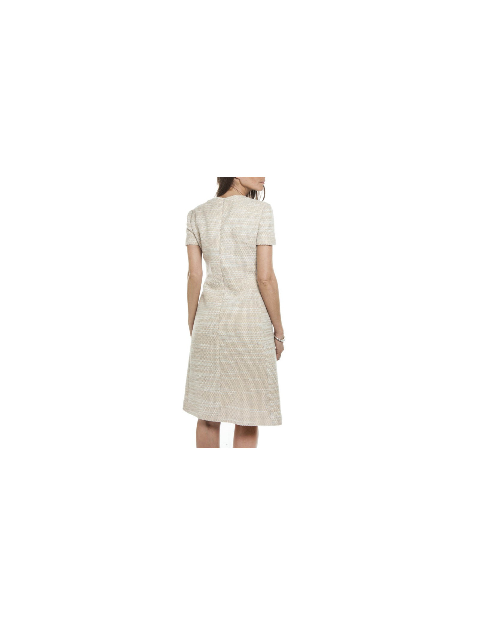 Robe en tweed laine et mohair dans les tons beige, agrémentée sur la partie avant de sequins du même ton. Fermeture zippée dans le dos.