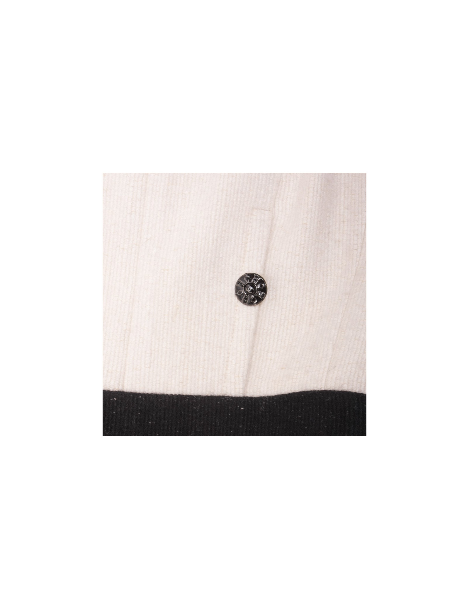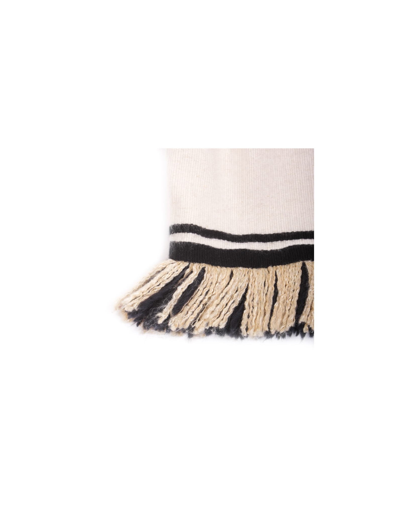 Elle est gansée et ceinturée de noir et se termine par le bas par 2 rangées de franges beige et noir.