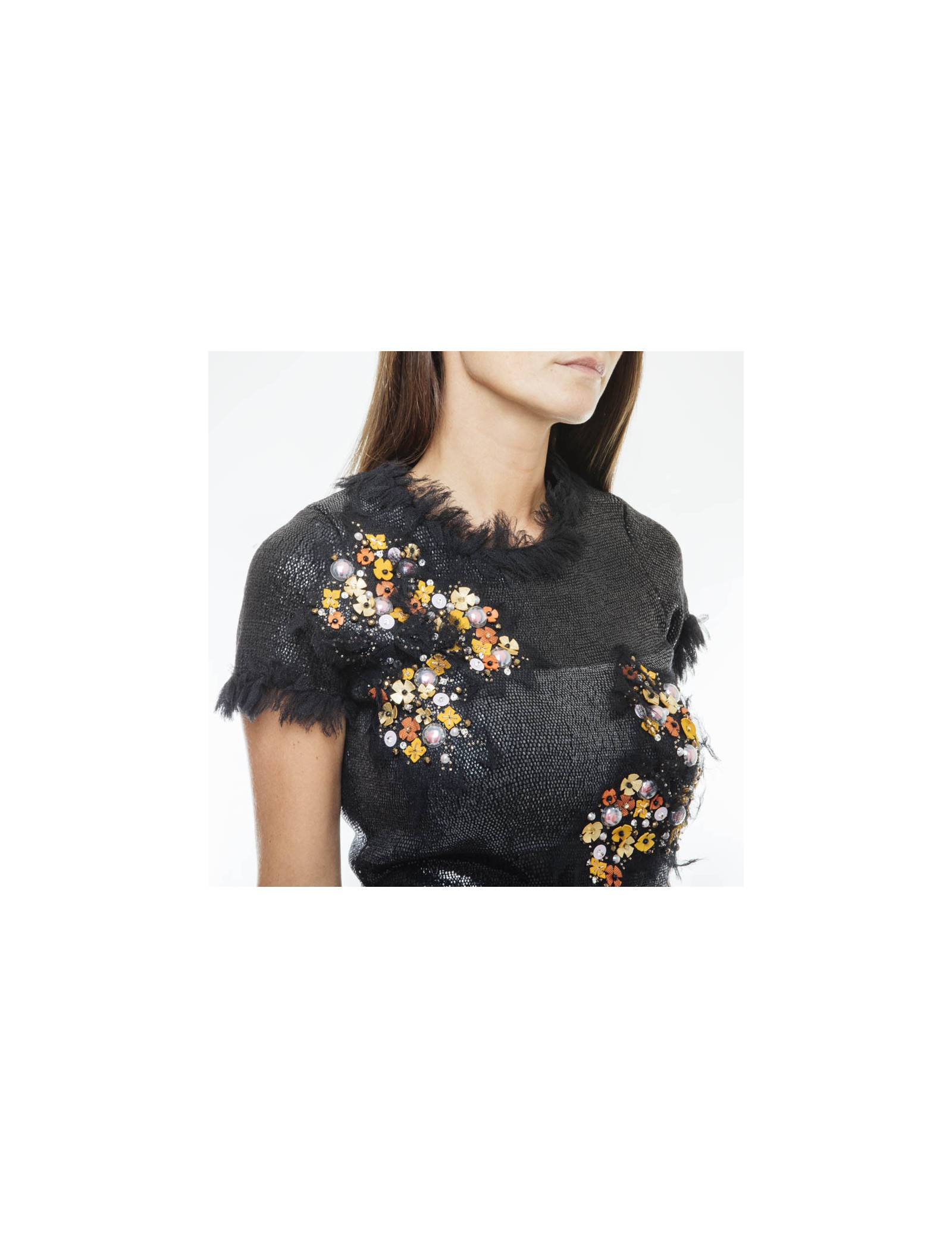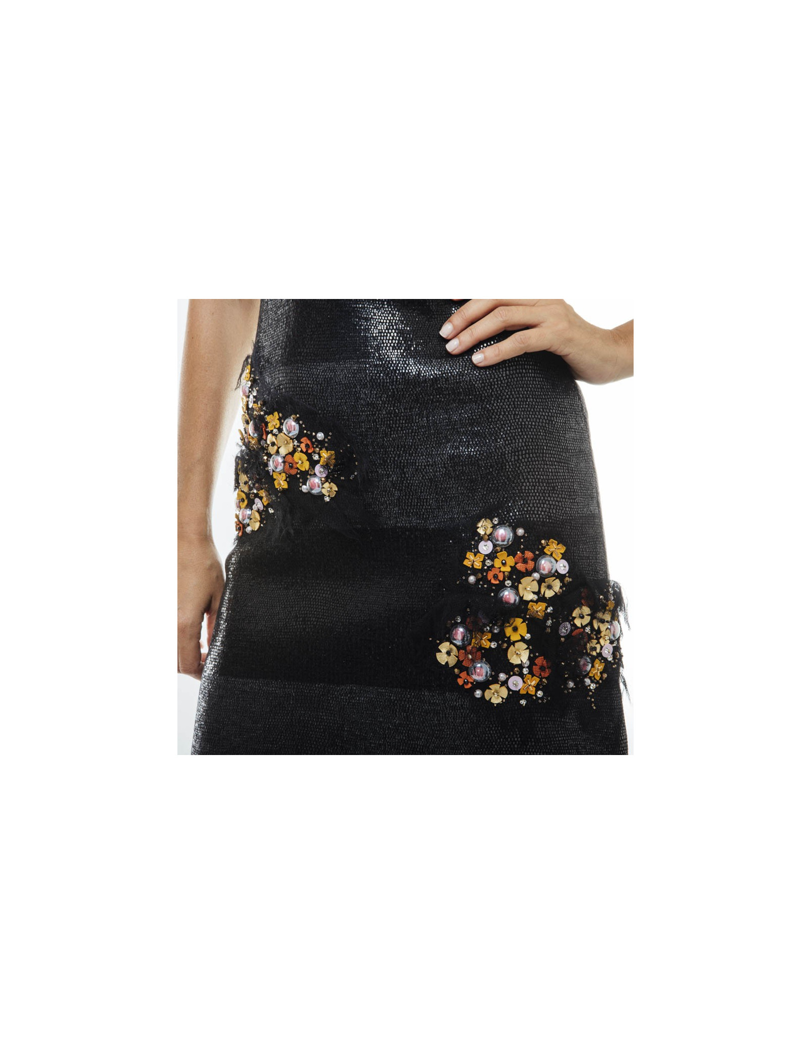 La robe est lamée noire et brodée de fleurs orange et or sur le devant, les manches sont courtes et il y a des petites franges en tulle autour du col, des manches ainsi que dans le bas .
