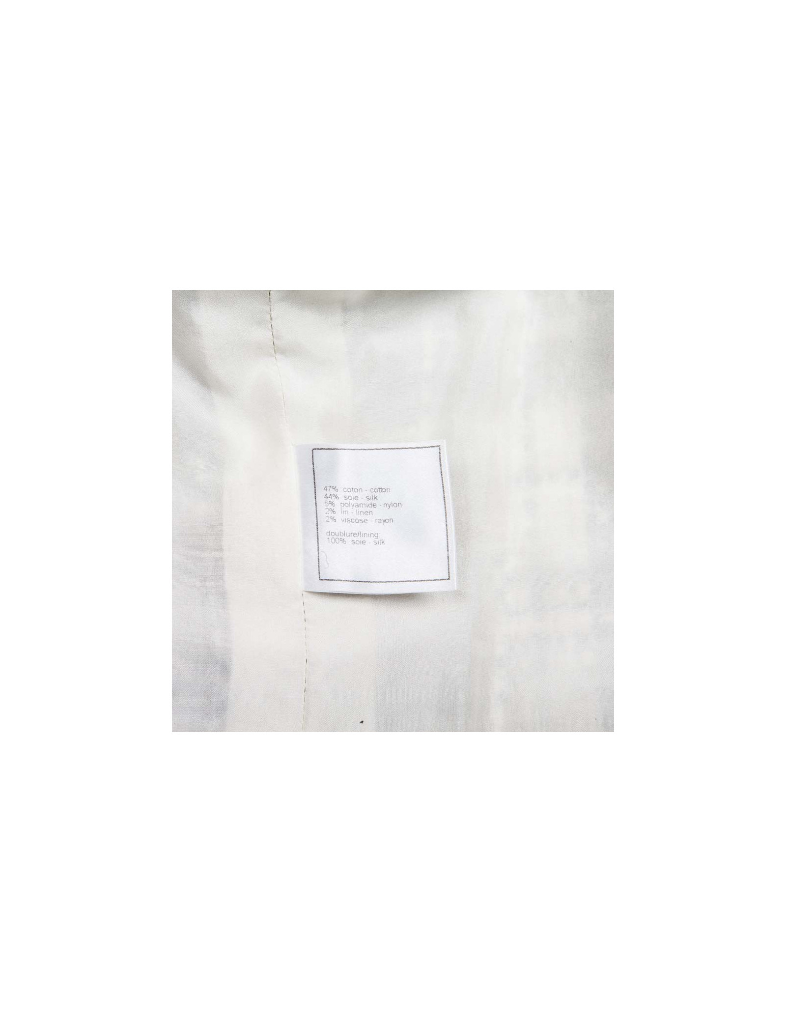 La doublure est en soie naturelle. Le col est rond et échancré bordé d'un galon en polyester noir.Les manches raglan sont courtes et les poches sont plaquées et bordées du même galon.
