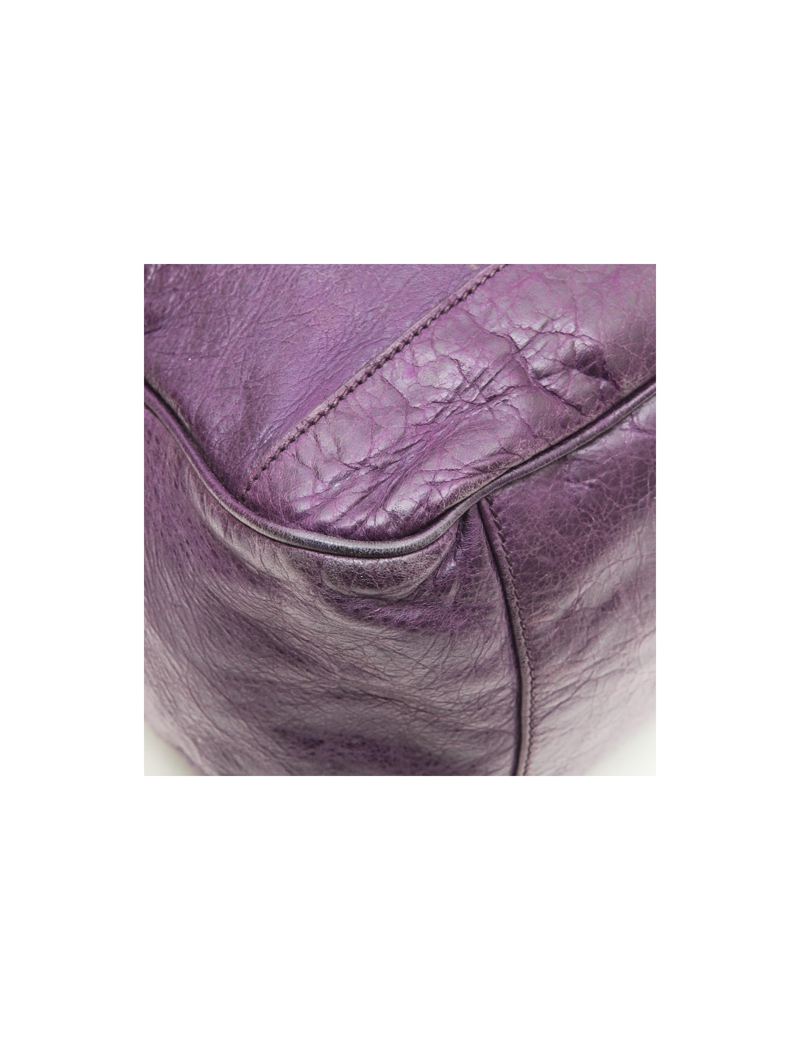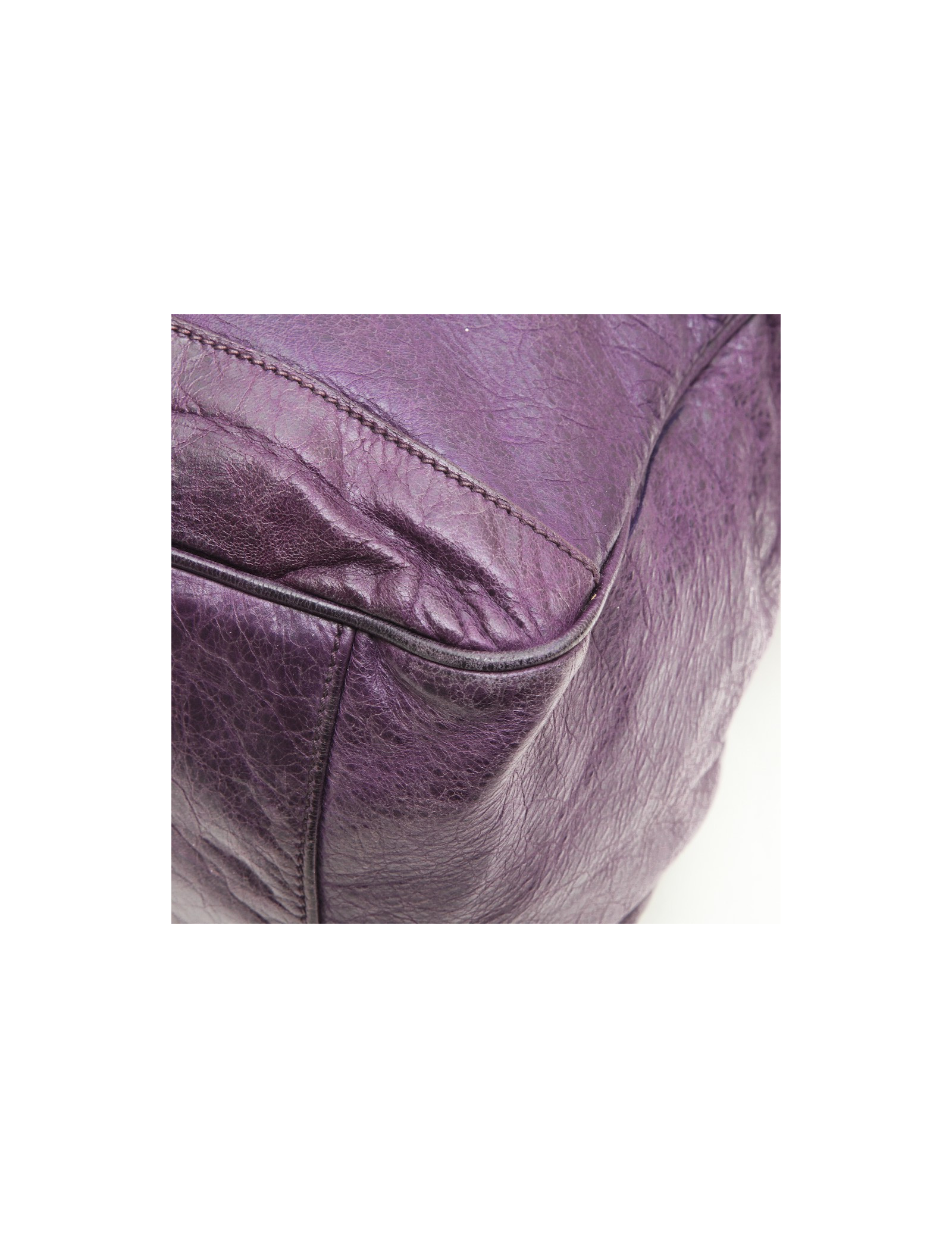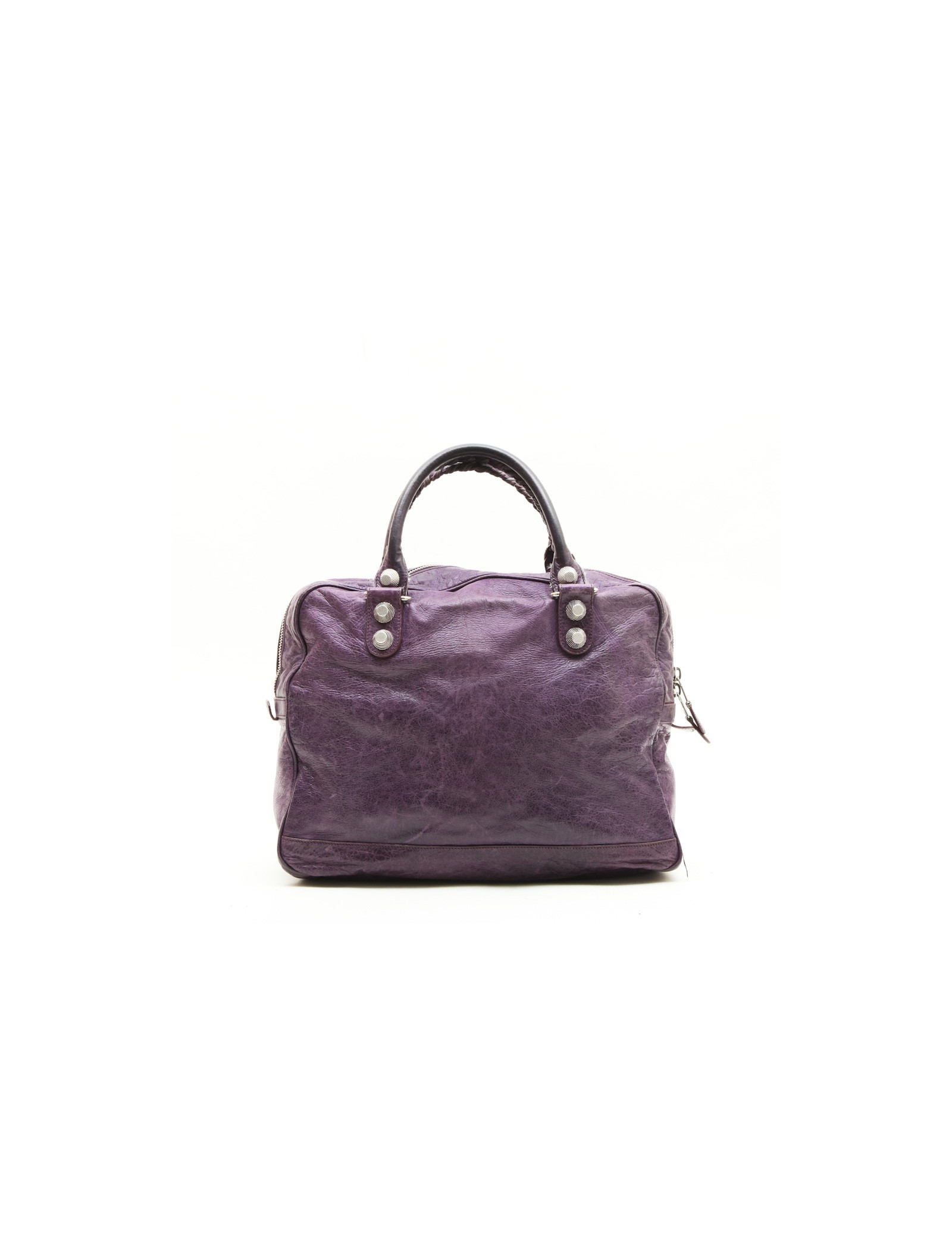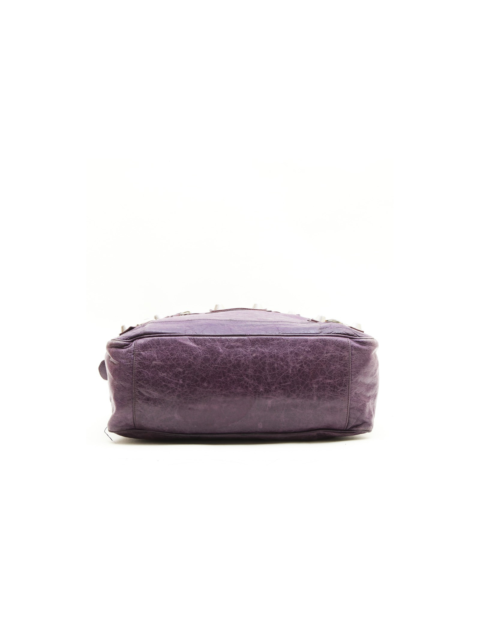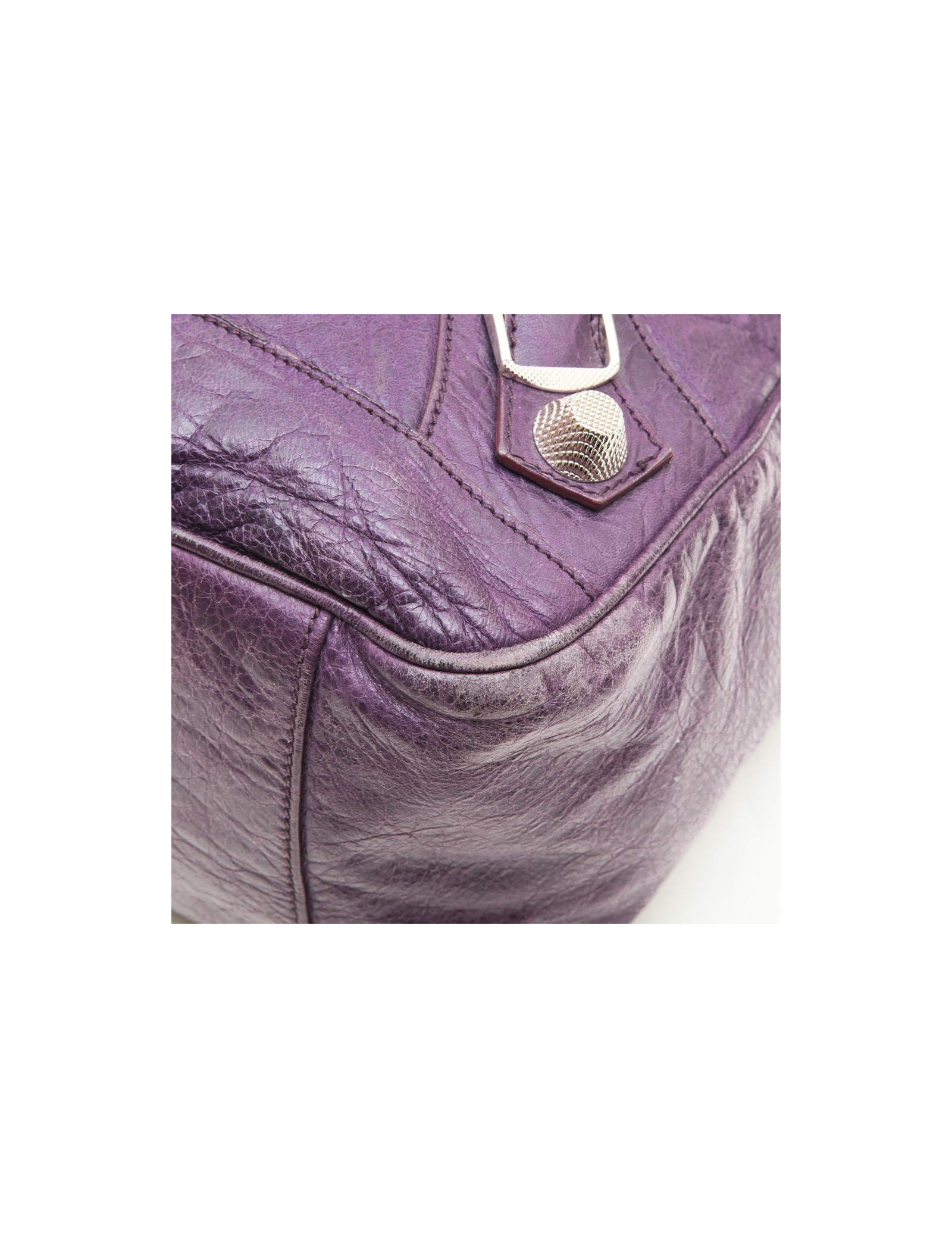 Sac de la maison Balenciaga en cuir vieilli violet. Il se porte à la main à l'aide de deux anses. L'intérieur est en toile noire avec une grande poche zippée.
