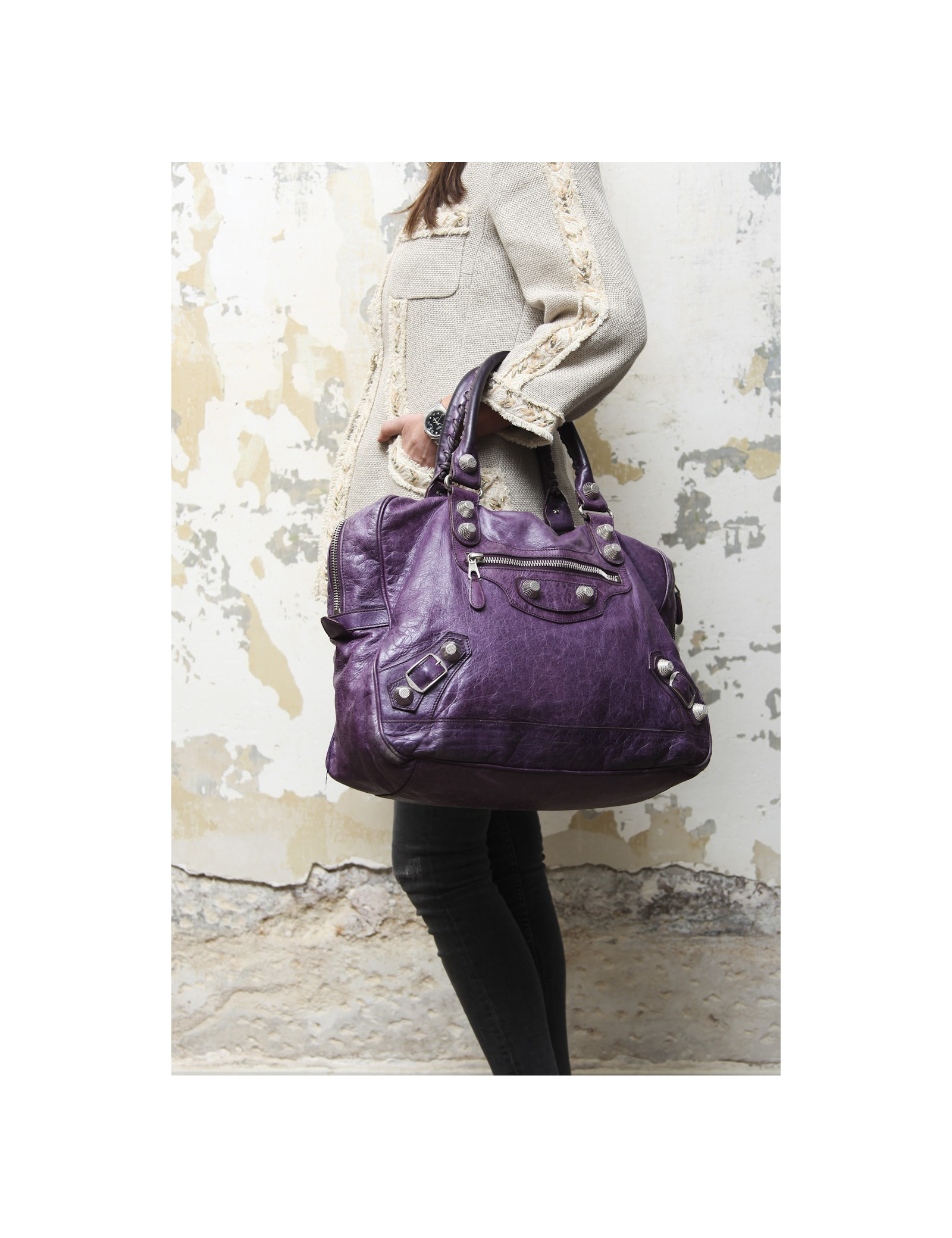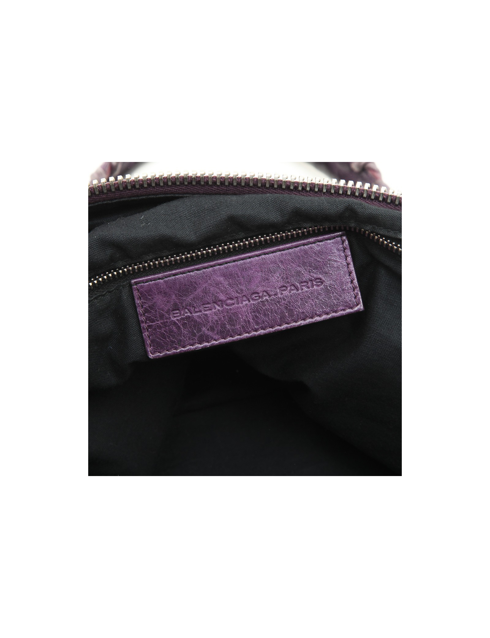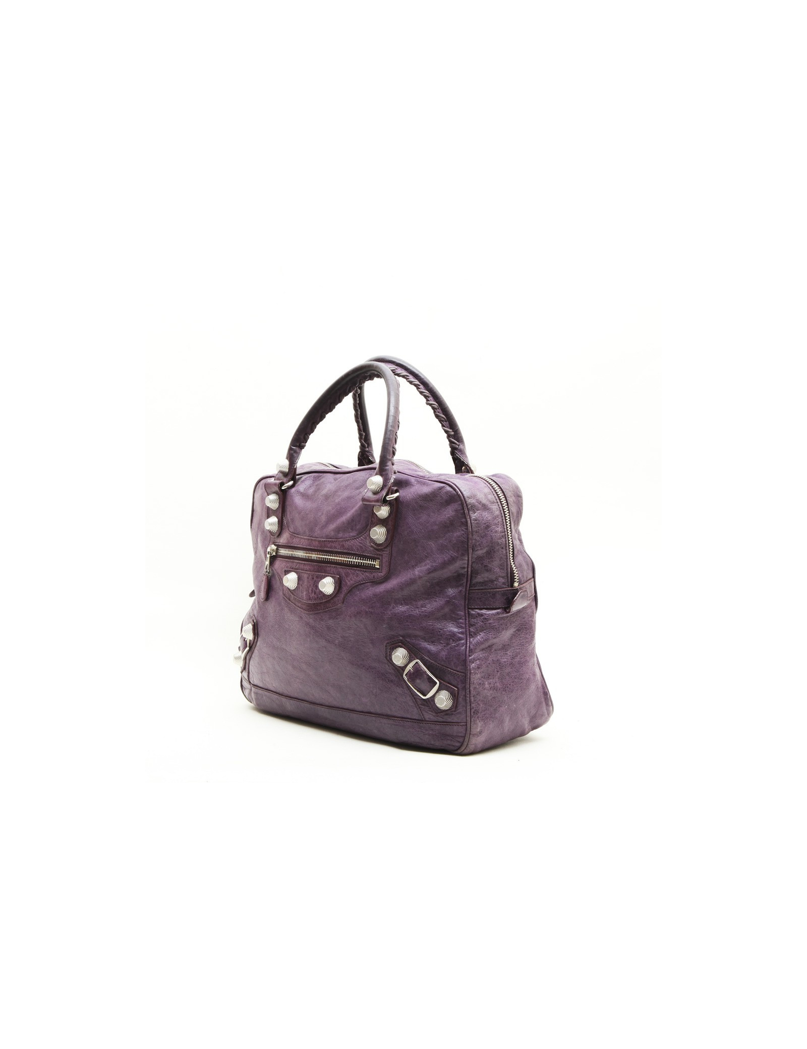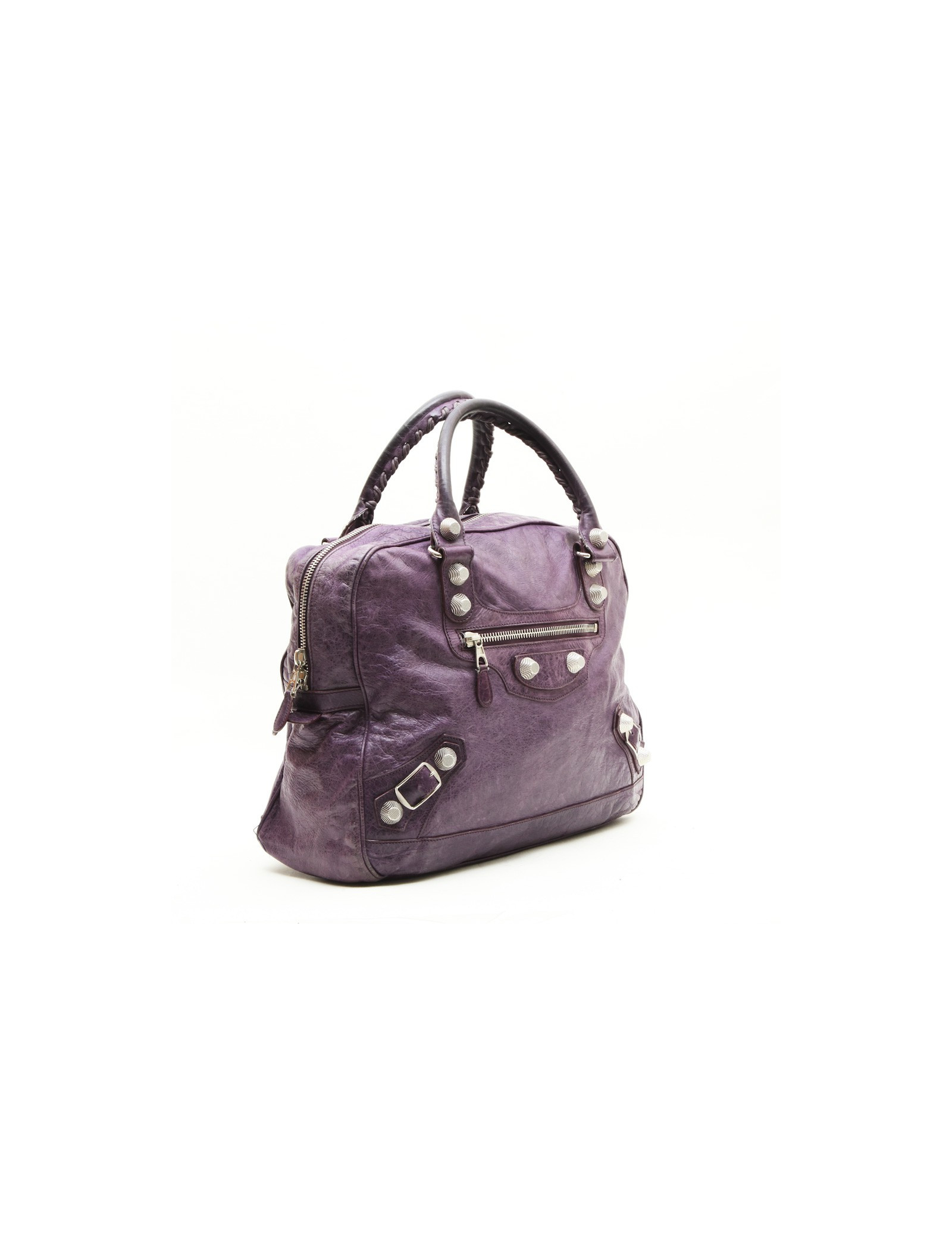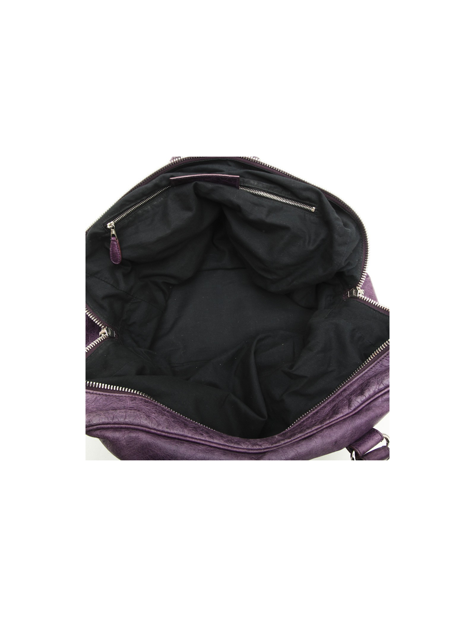 Sac de la maison Balenciaga en cuir vieilli violet. Il se porte à la main à l'aide de deux anses. L'intérieur est en toile noire avec une grande poche zippée.