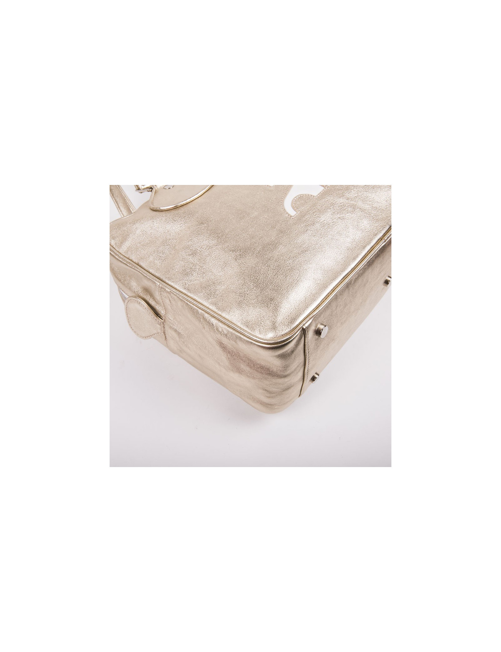 Sac Courrèges en cuir d'agneau lisse souple doré. Accastillage argent. Fermeture à glissière double L'intérieur est en toile argent mat avec nombreux compartiments dont une poche zippée.