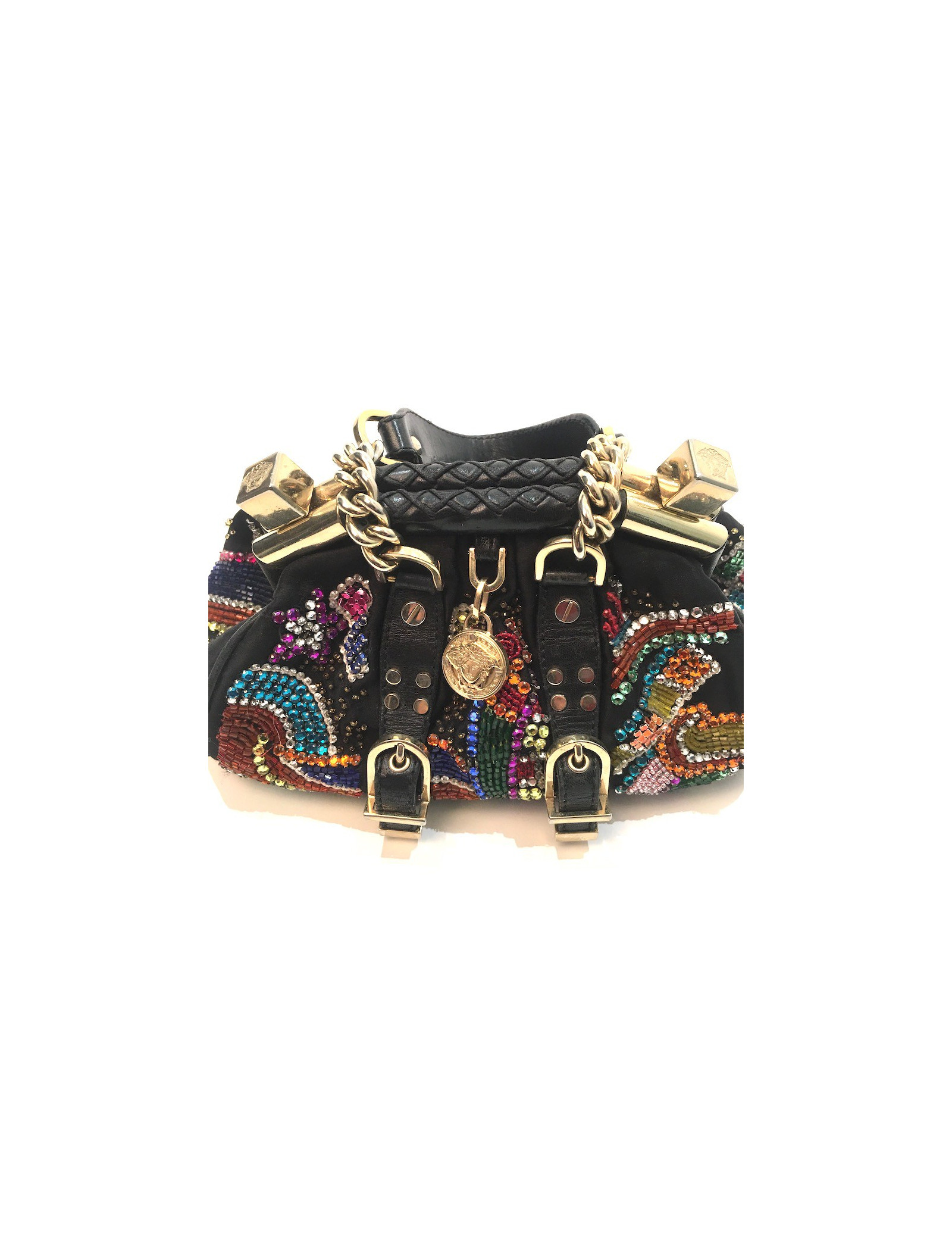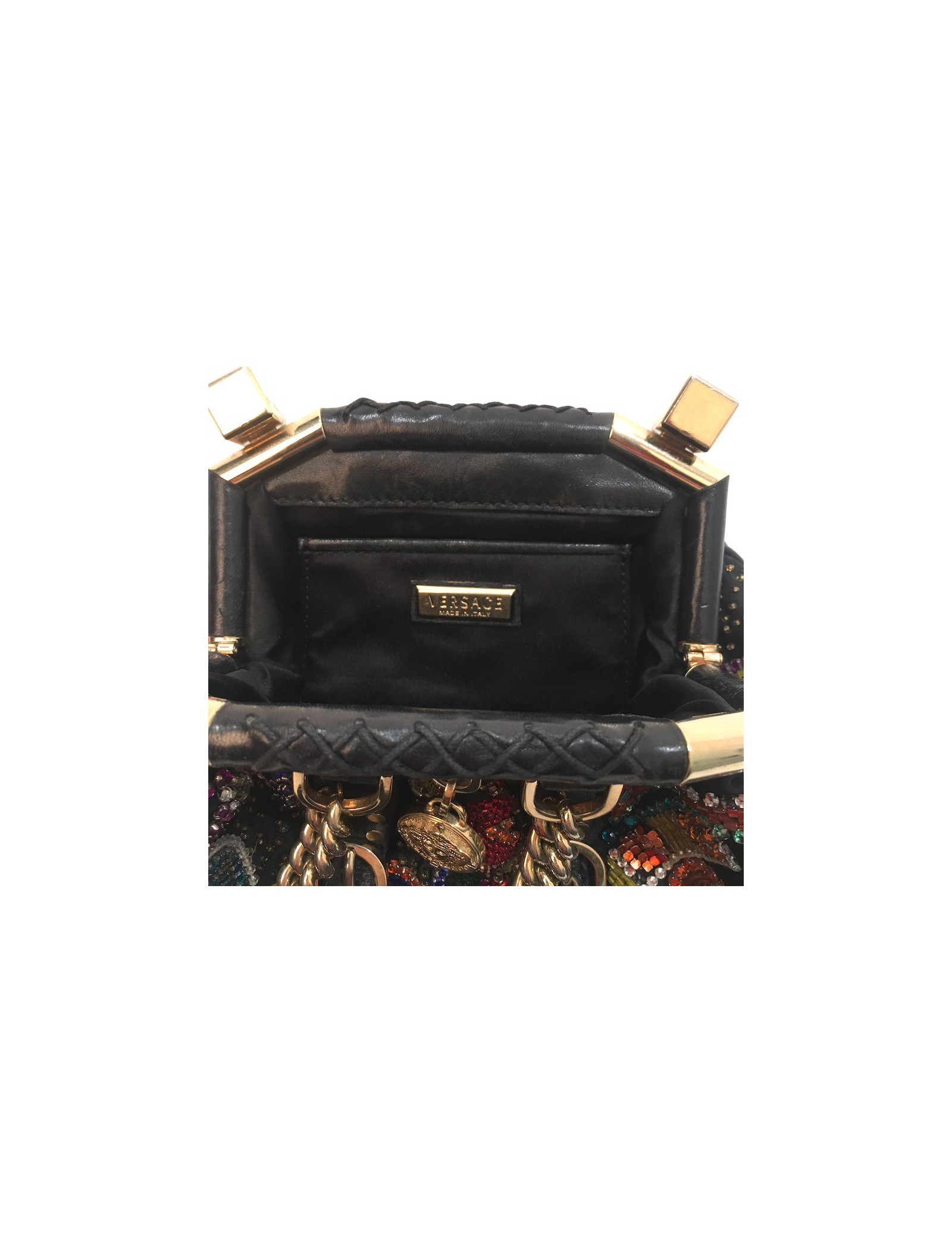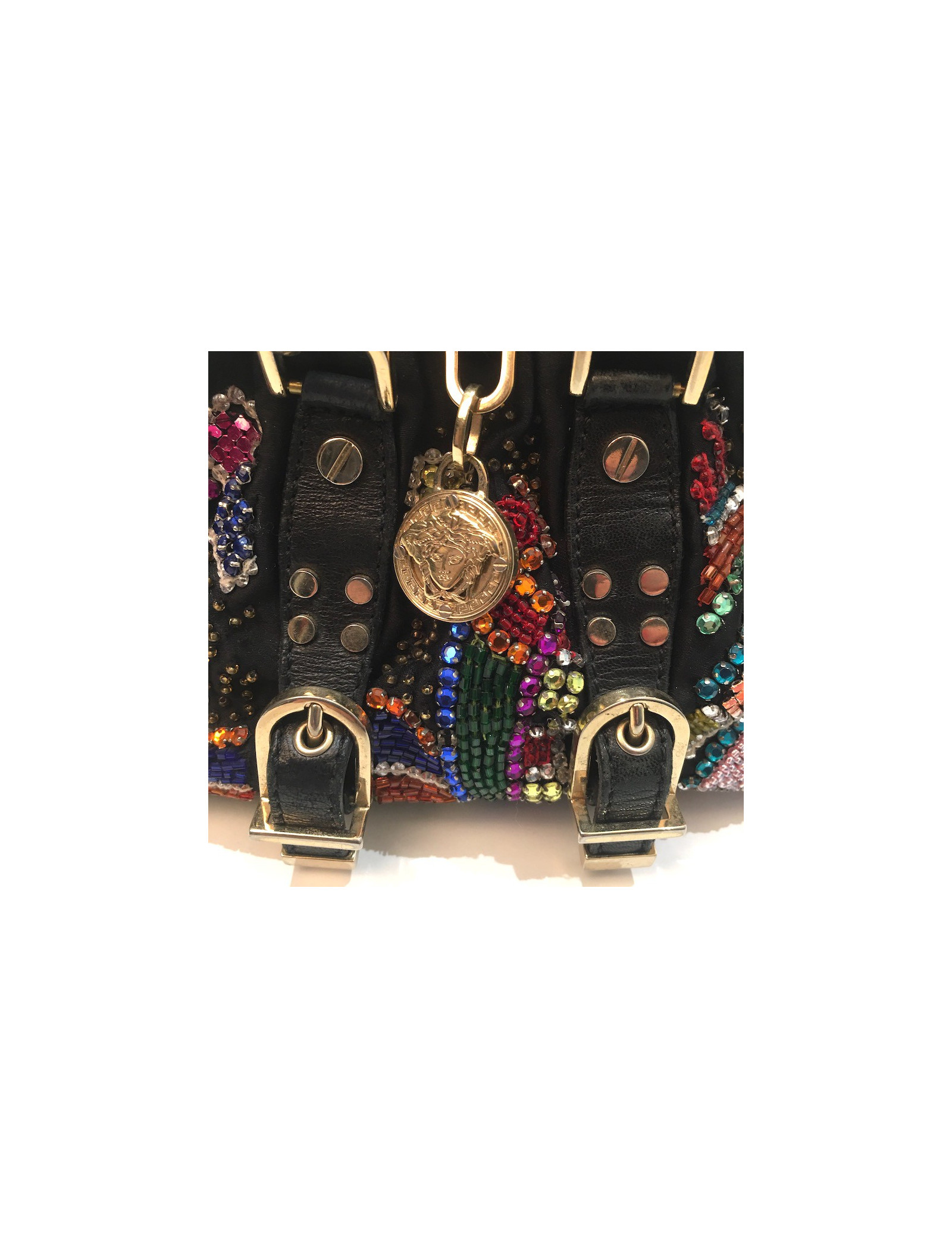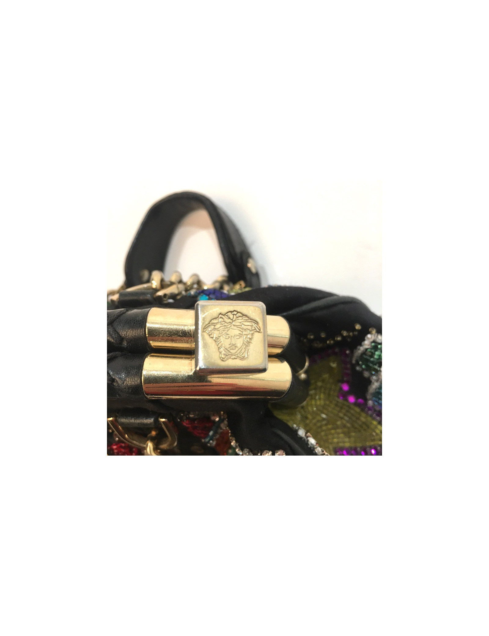 Petit sac Versace en satin orné de perles et strass multicolores. La bijouterie est dorée, ouverture par deux fermoirs à bascule. Les finitions sont en cuir. Un médaillon Medusa à l'effigie de la marque VERSACE sur le devant du sac. A l'intérieur un espace de rangement avec une petite poche plaquée. Il se porte à main. Il sera parfait pour accessoiriser votre tenue.