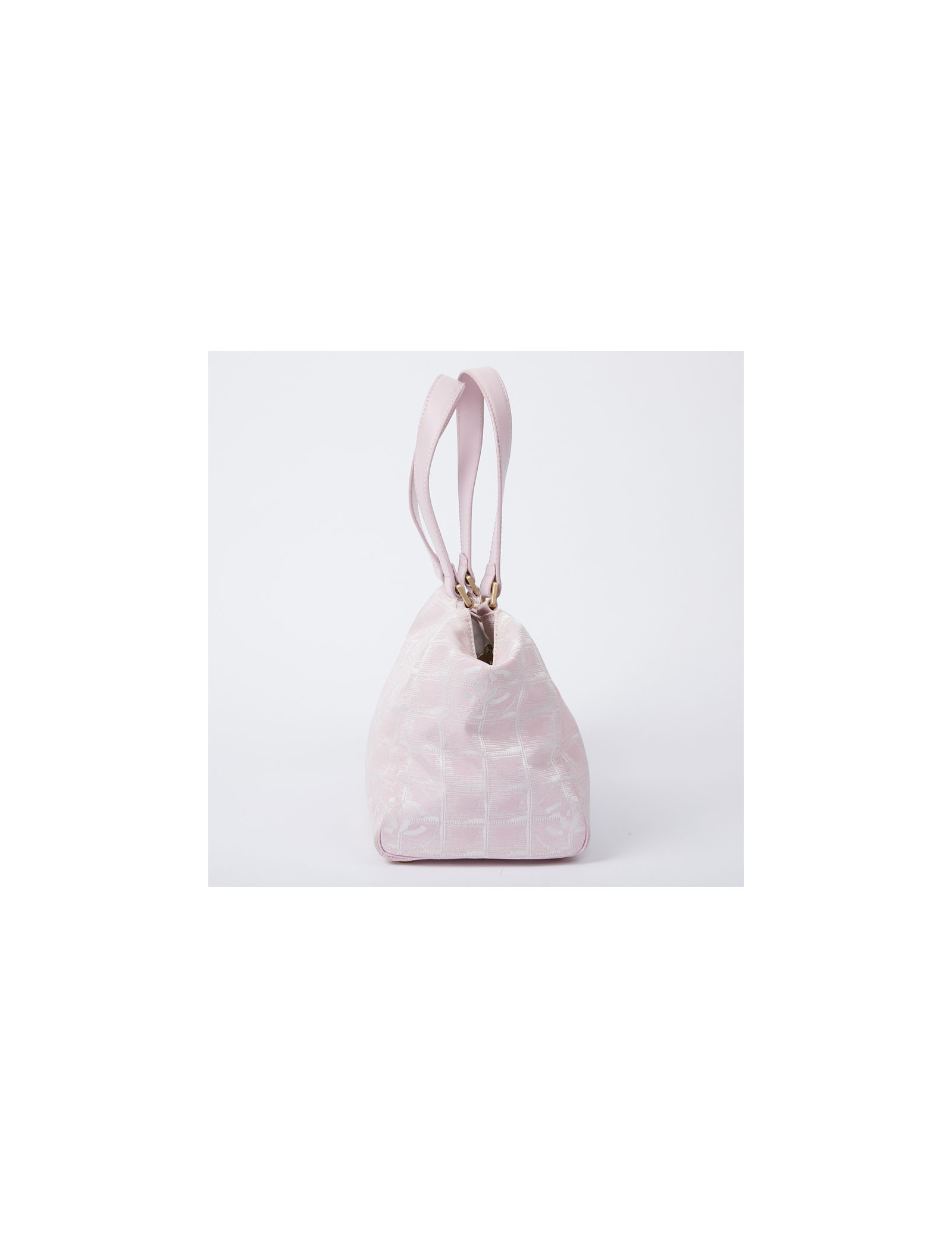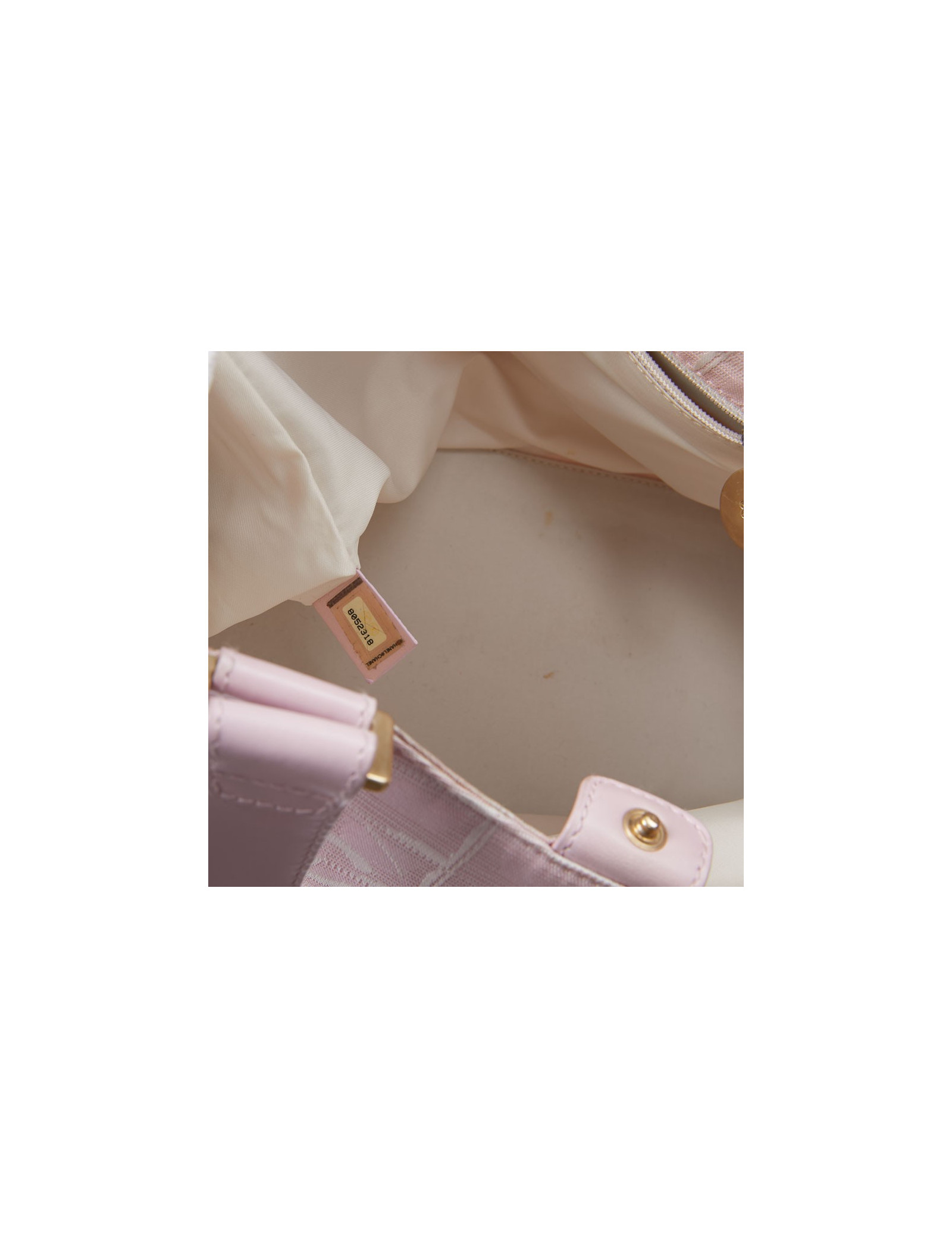 Ce petit sac porté à la main Chanel est en toile monogram rose et blanc brillant. Fermeture par un bouton pression. La bijouterie est dorée. Il est doublé en toile blanche avec une petite poche zippée. Idéal pour les beaux jours. Il se porte à la main avec sa double poignée en cuir légèrement froissé. Il est en très bon état.