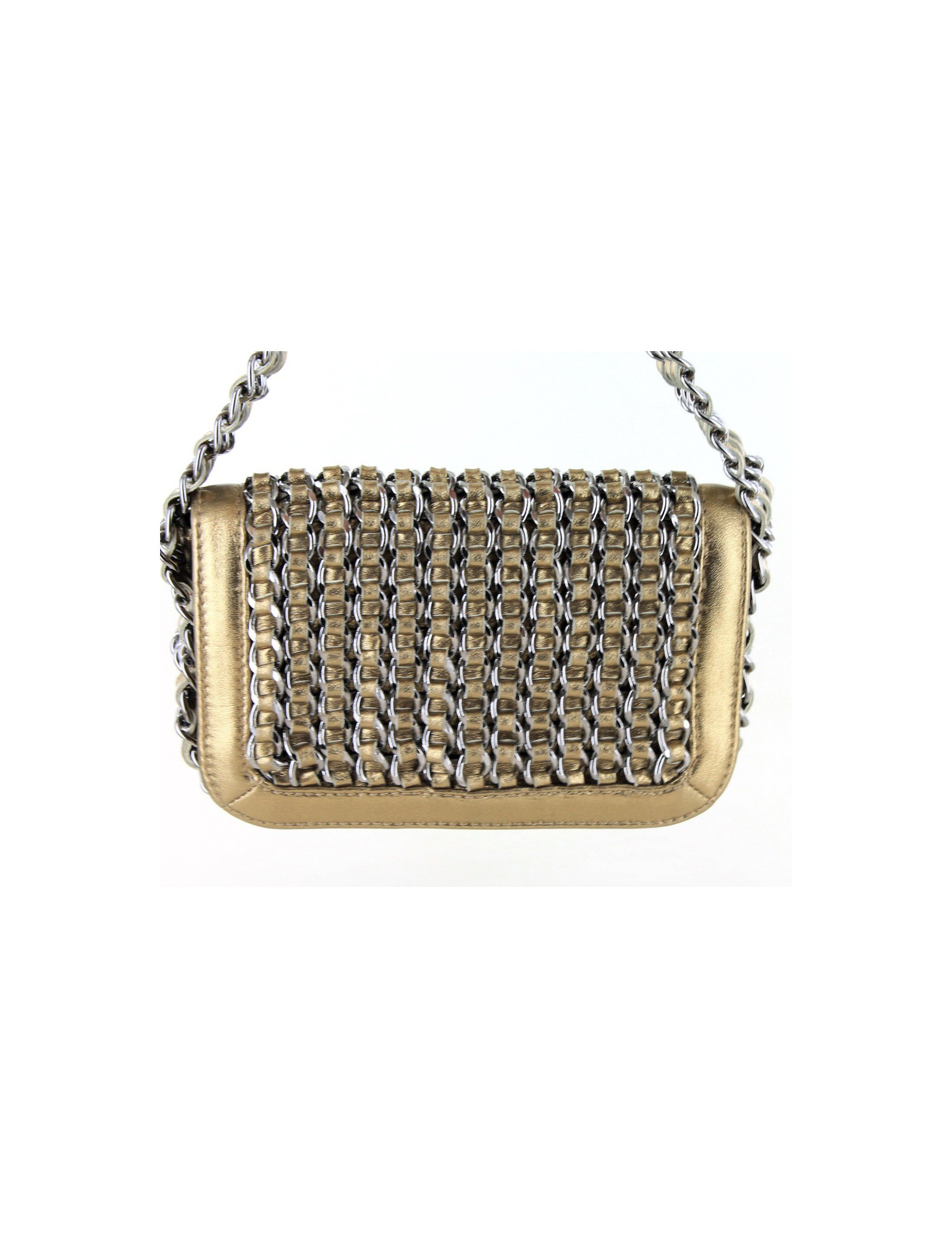 Collector ! Ce petit sac bijou CHANEL est en cuir lamé bronze doré. Sur le rabat il y a des chaines sur lesquelles sont entrelacées des rubans de cuir. La bijouterie est en argent palladié. Il se porte au bras ou à la main par une bandoulière regroupant trois chaines entrelacées par des rubans de cuir. L'intérieur est en toile monogramme avec une poche plate. Il est en très bon état, aucune usure.
