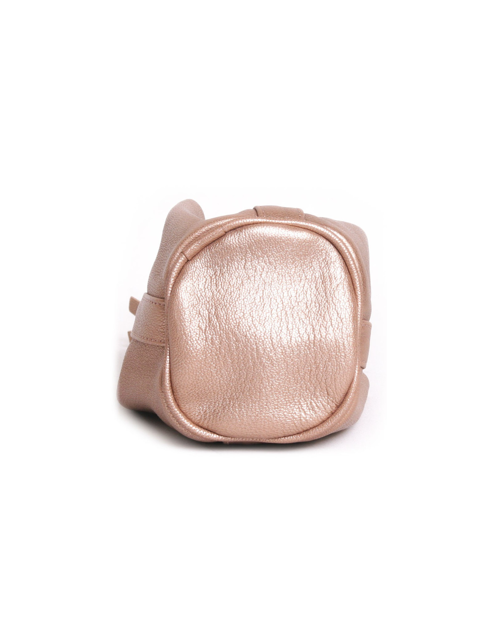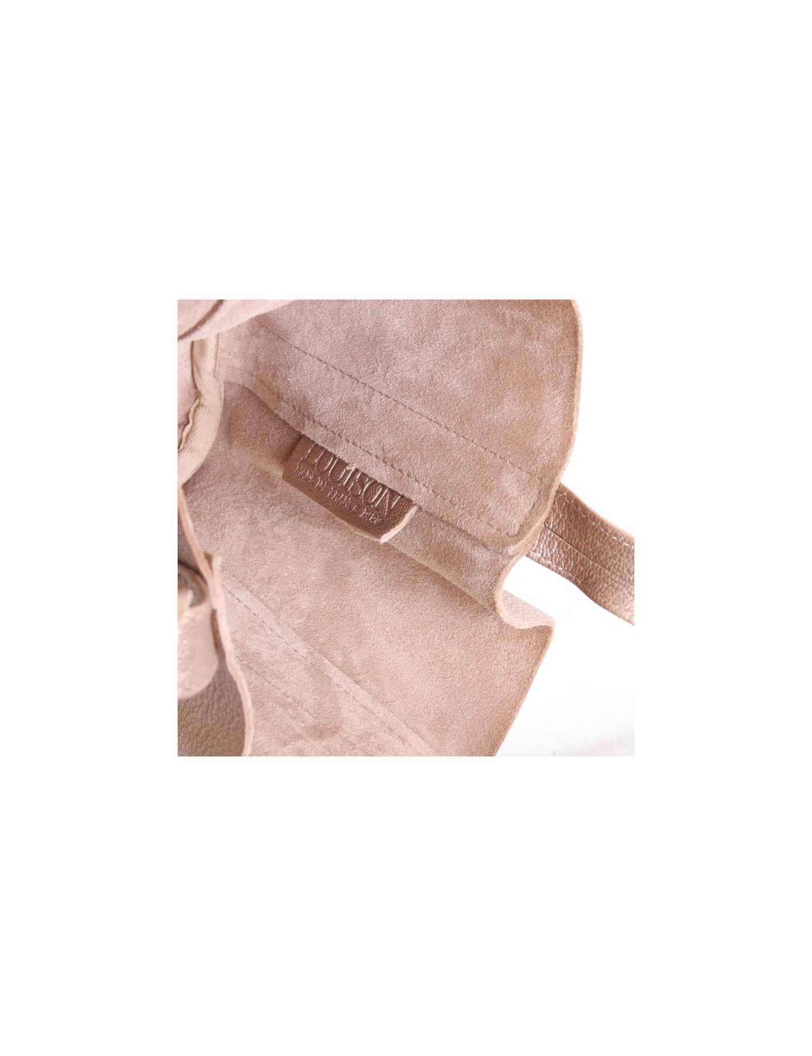 Très joli sac en cuir lamé. Il est porté à la main en bourse (grâce à une pression permettant de refermer le contenu) ou en cabas classique. L'intérieur en daim marron ajoute au sac un aspect raffiné au-delà de l'aspect pratique que lui donnent ses petites dimensions.