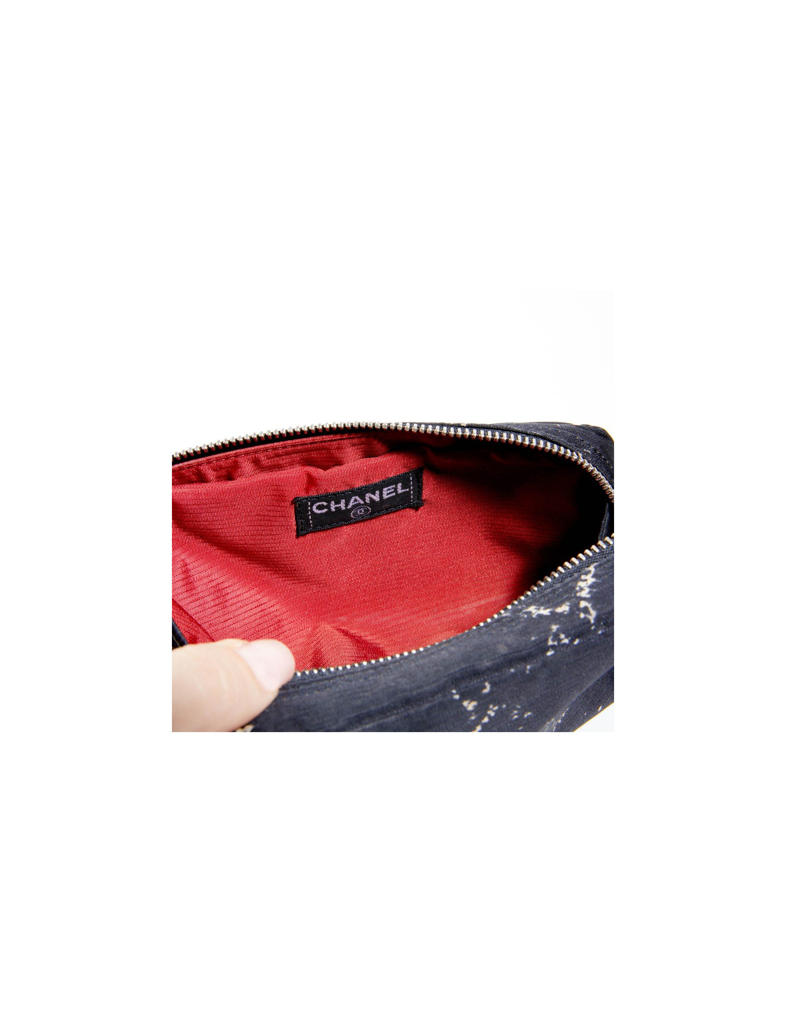 Ceinture Chanel agrémentée d'un longue pochette et de son porte-monnaie en toile. Elle a son hologramme. Elle est en très bon état extérieur, mais a des traces sous le rabat, ayant déjà été portée. Se ferme par un bouton pression argent. Le porte-monnaie se ferme par un zip.