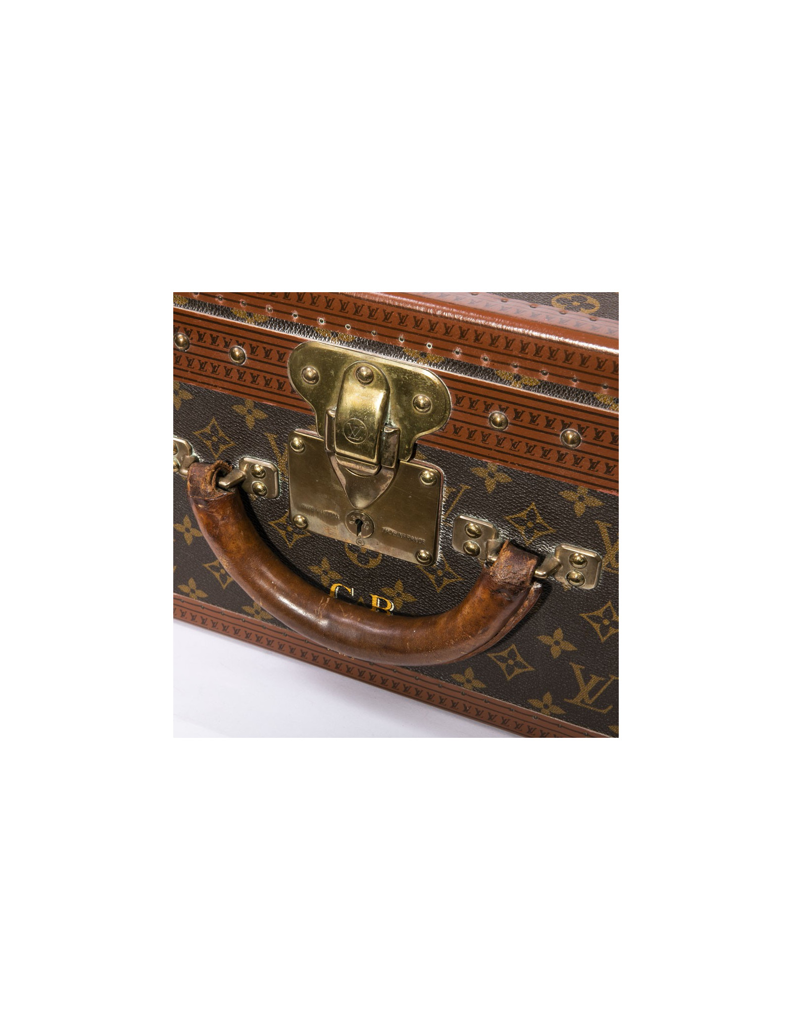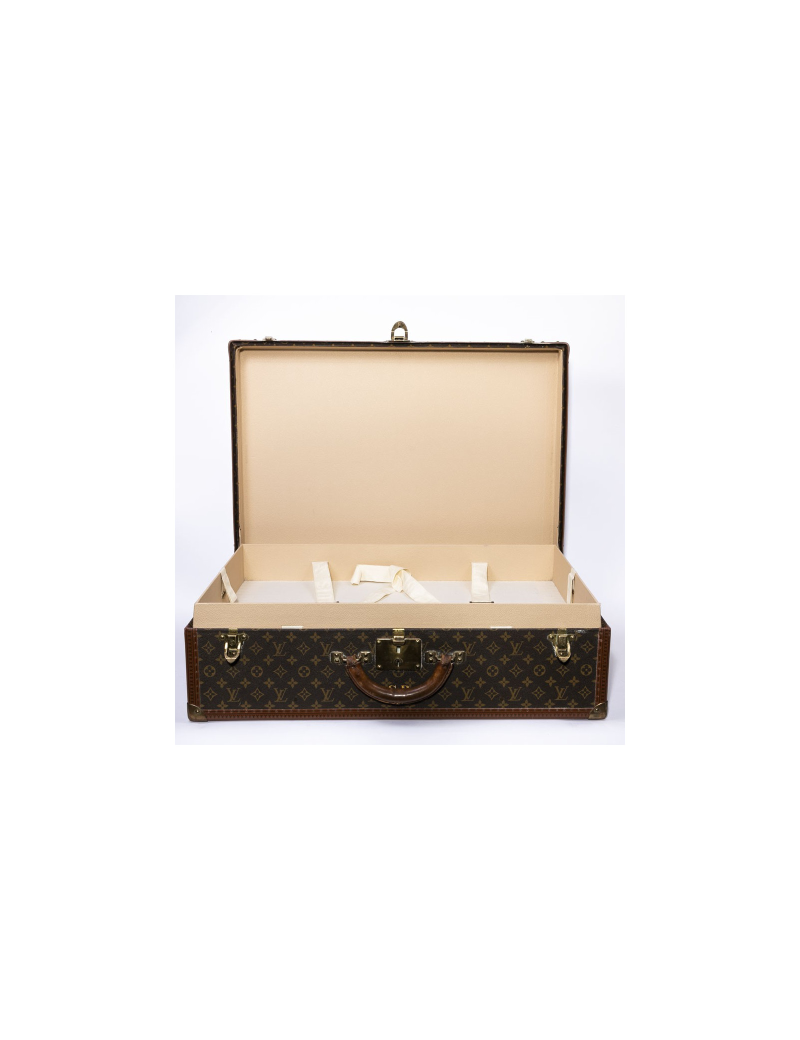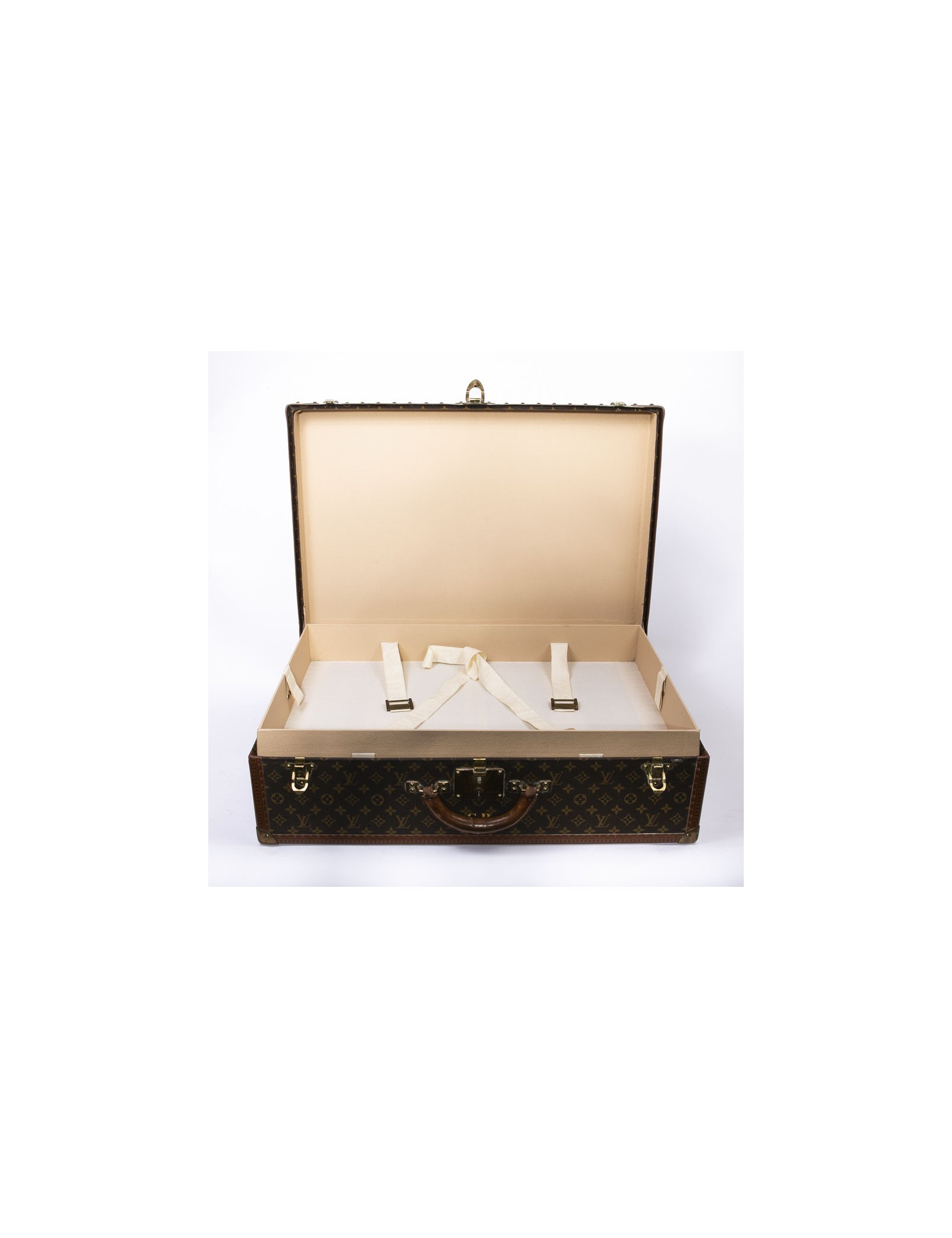 Cette magnifique malle (valise rigide) LOUIS VUITTON est en toile monogram. C'est le modèle Bisten 70. L' accastillage est en métal doré. La doublure est en toile. La poignée arrondie est en cuir. L'intérieur est composé d'un double compartiment de rangement avec sangles de maintien. Pour fermer la malle une Serrure "S" ( avec deux clés) est renforcée de deux loquets complémentaires. Les bordures de la malle sont en cuir Monogram renforcées de rivets et angles en métal doré. La valise porte les initiales "CB" sous la serrure. Le porte-étiquette d'adresse est présent . Elle est en bon état d'usage (marques et griffures d'usure sur la toile, et métallerie vieillie par le temps, intérieur parfait).