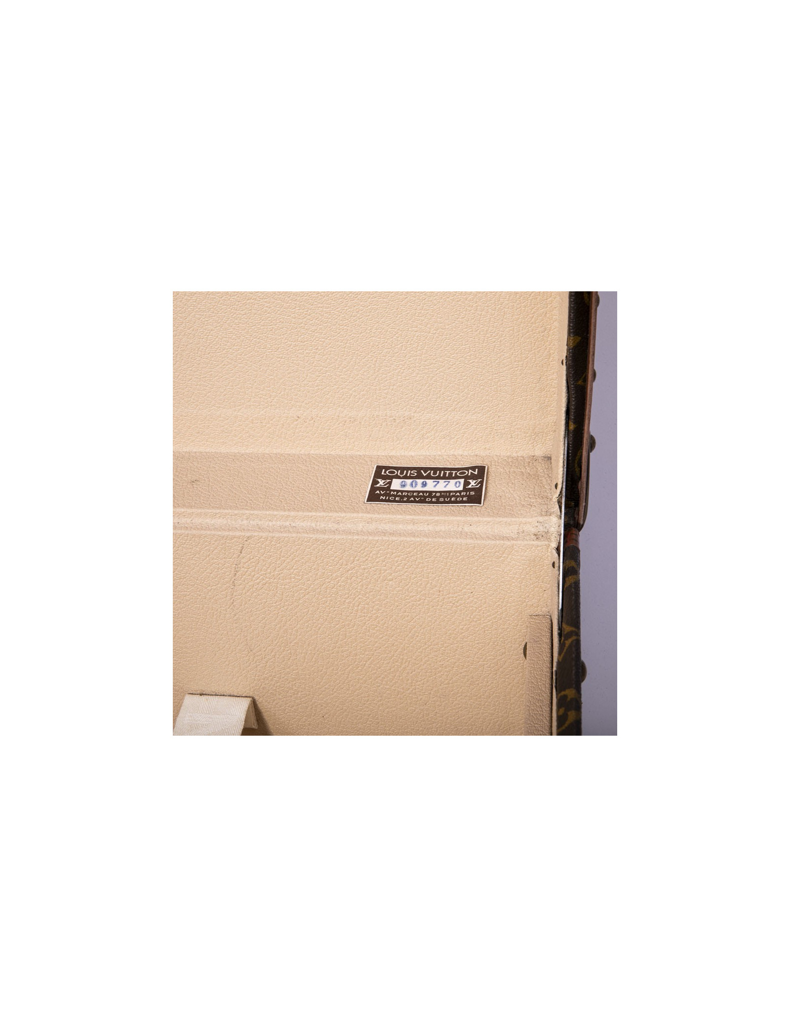 Cette malle en toile marron est Made in France. Elle a un numéro de série 9097... .