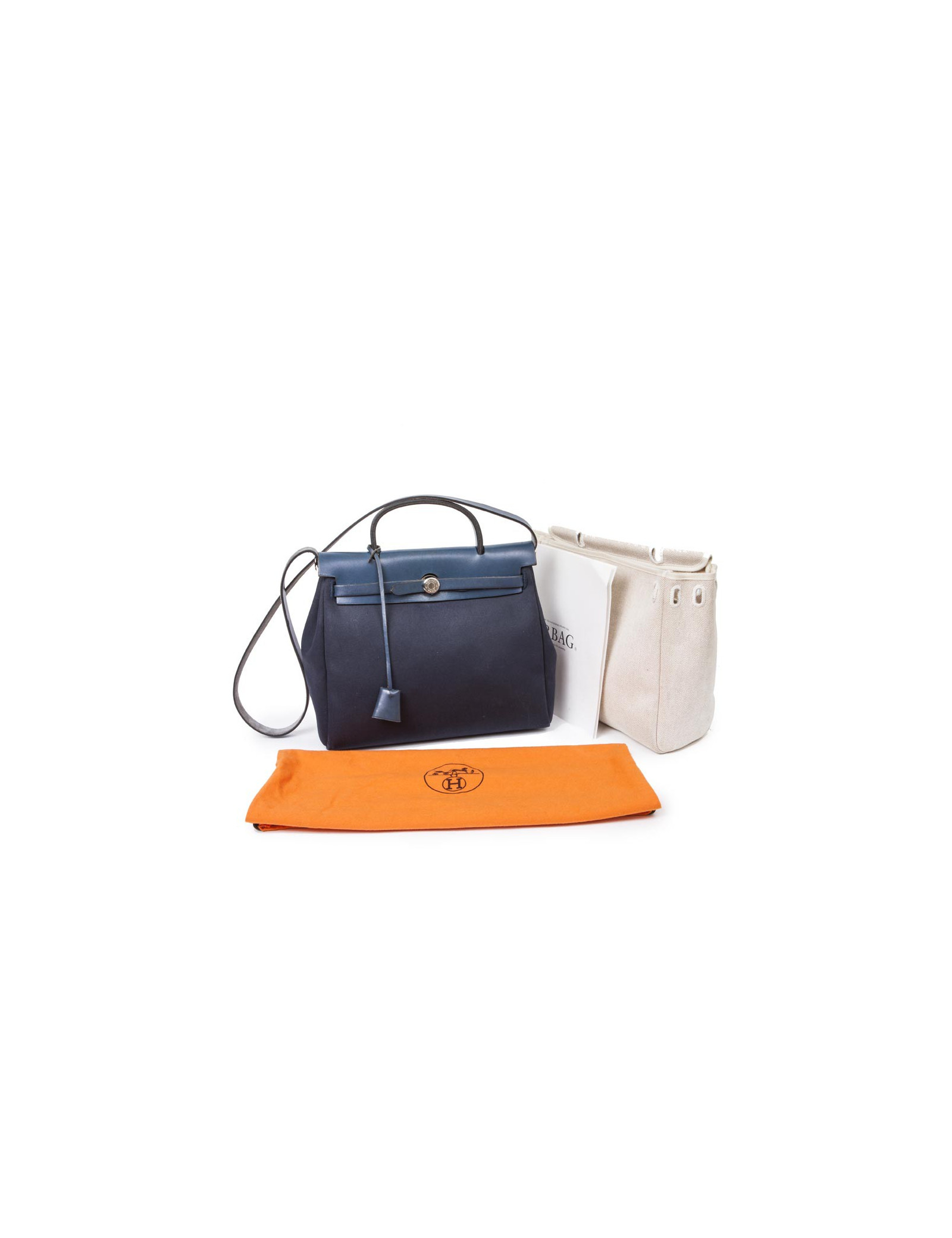 Sac Herbag HERMES en toile et cuir bleu nuit. Il a une bijouterie en métal argenté et est porté main avec la poignée, ou épaule avec la bandoulière : 100 cm. Il est vendu avec tirette, clés, cadena et clochette. Il a une poche supplémentaire en toile naturelle en très bon état et la notice de montage. Les deux poches ont une fente intérieure plaquée.