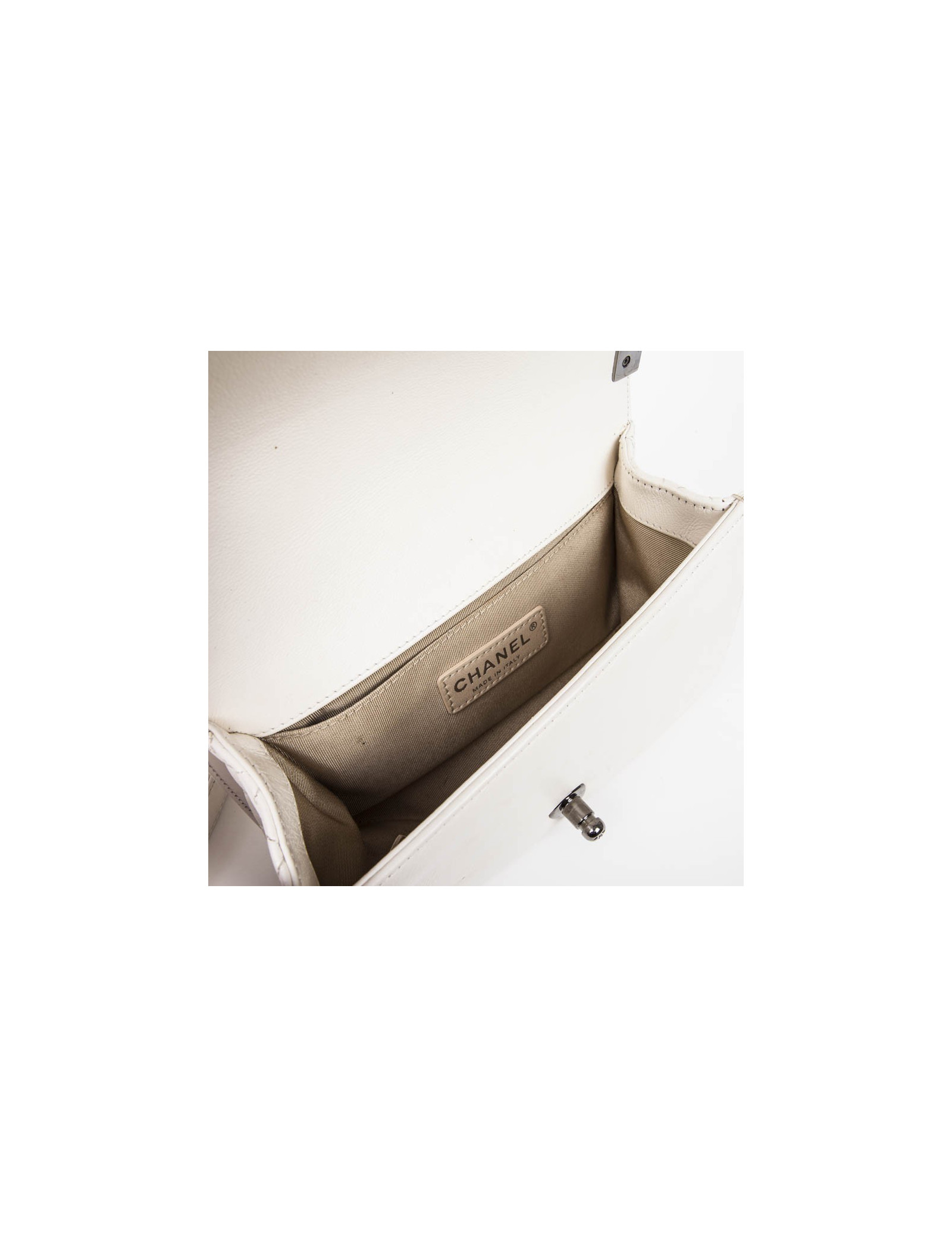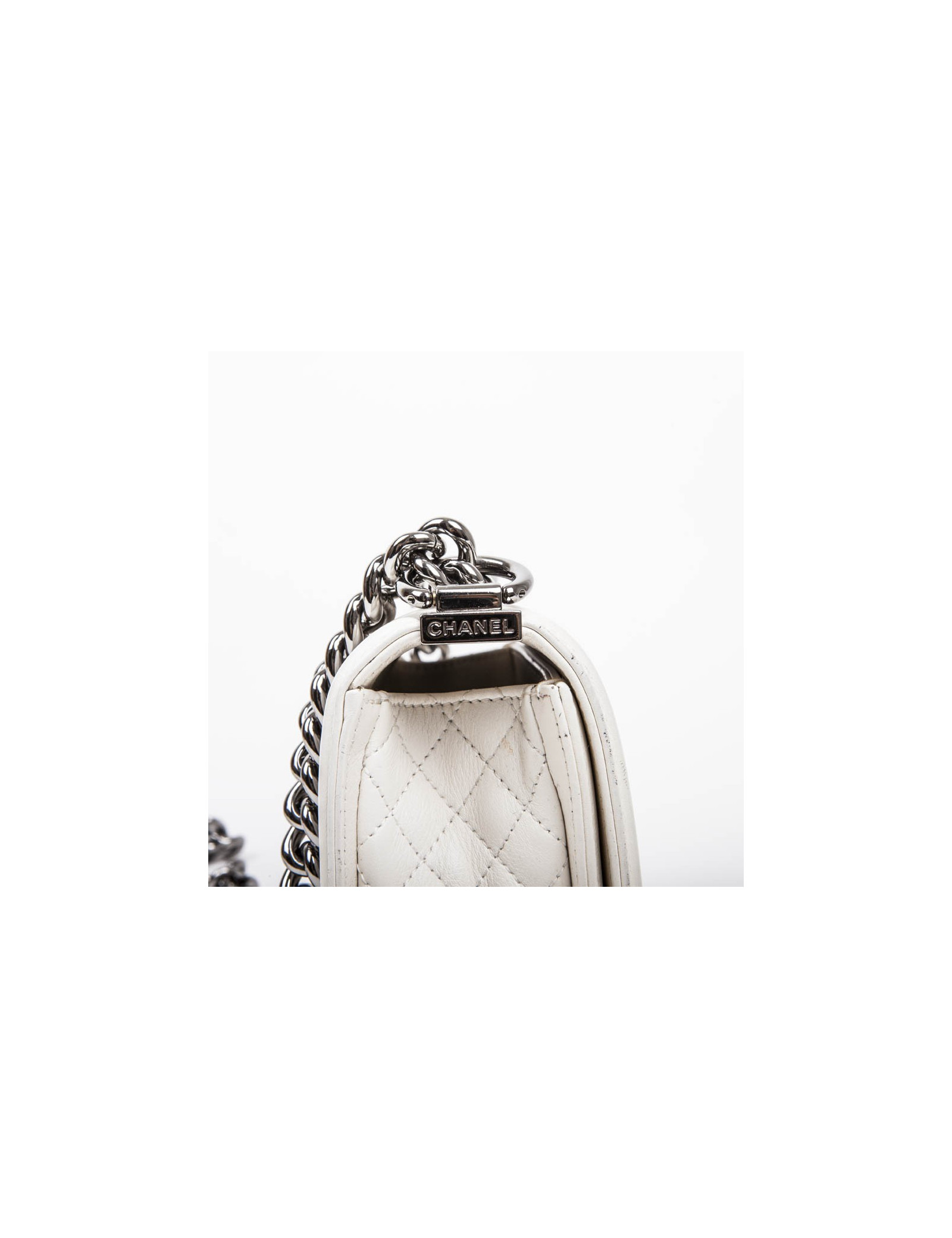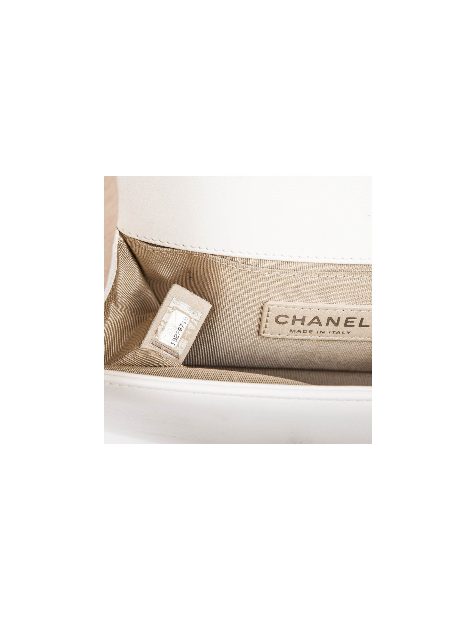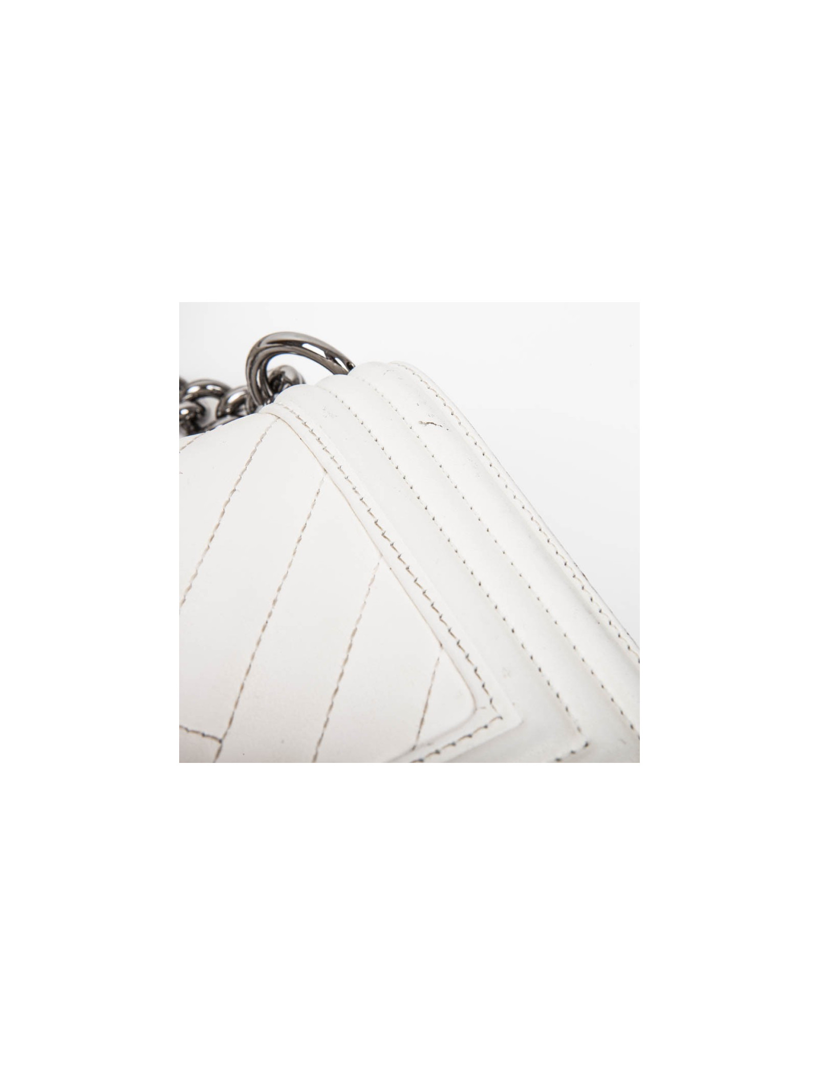 Sac "Boy" Chanel en cuir blanc matelassé. Petit modèle. Accastillage métal argent ruthénium. Fermeture avec clip siglé "CC". Porté épaule ou crossover avec l'anse réglable. Intérieur en cuir de la même teinte. Hologramme 1927... Made in Italy.