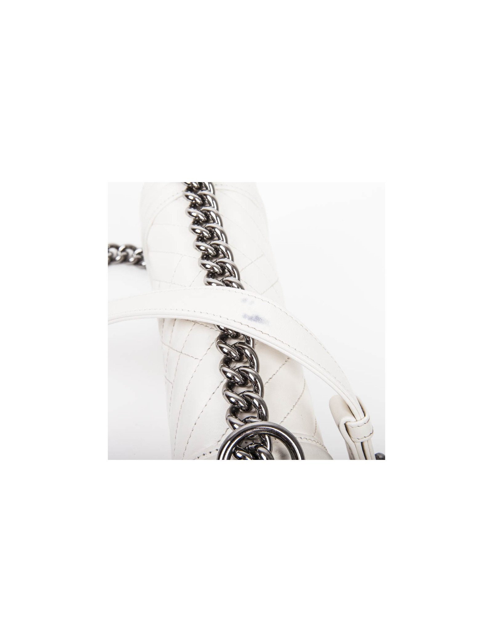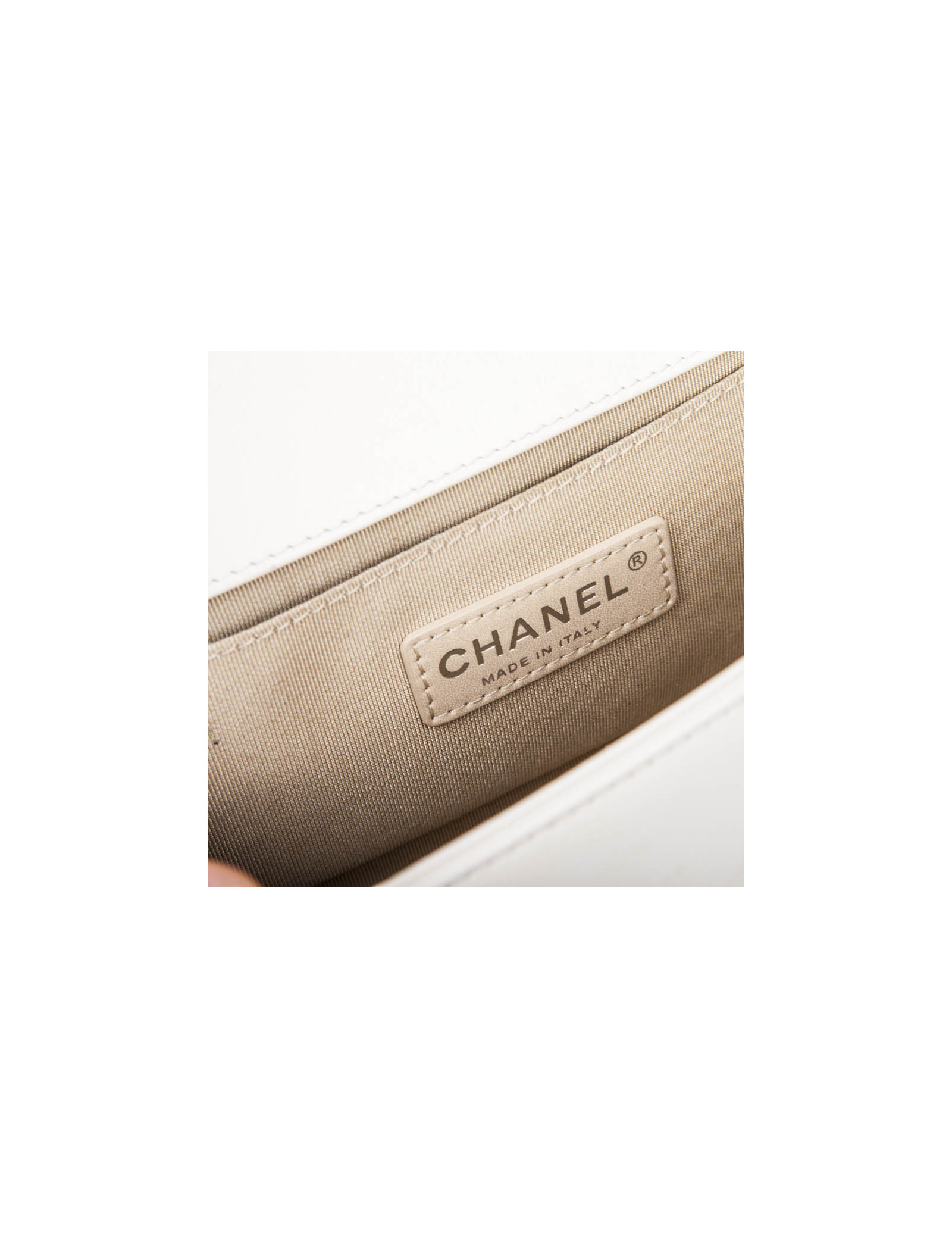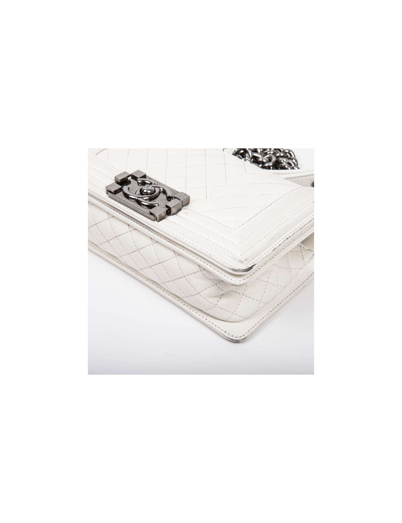 Sac "Boy" Chanel en cuir blanc matelassé. Petit modèle. Accastillage métal argent ruthénium. Fermeture avec clip siglé "CC". Porté épaule ou crossover avec l'anse réglable. Intérieur en cuir de la même teinte. Hologramme 1927... Made in Italy.