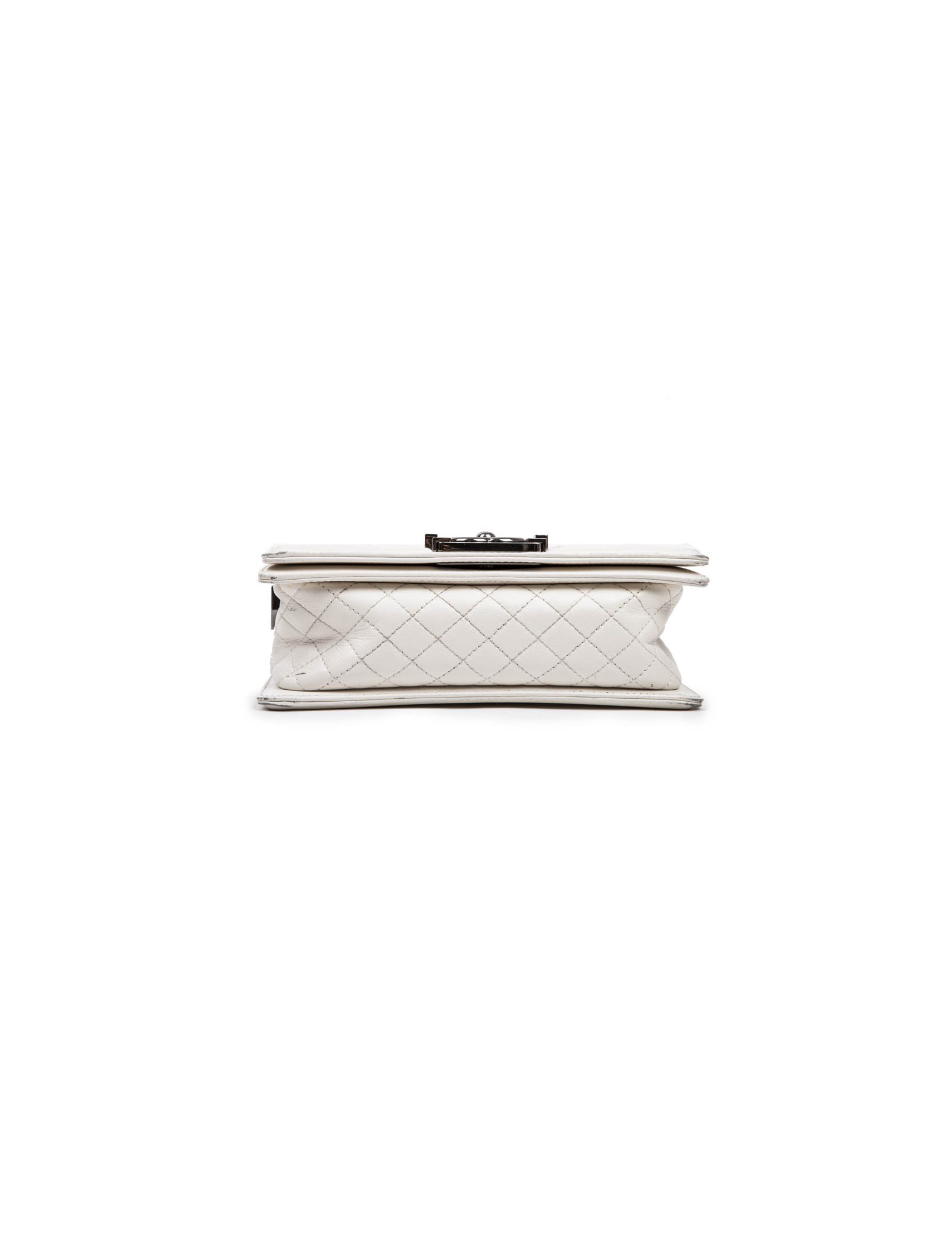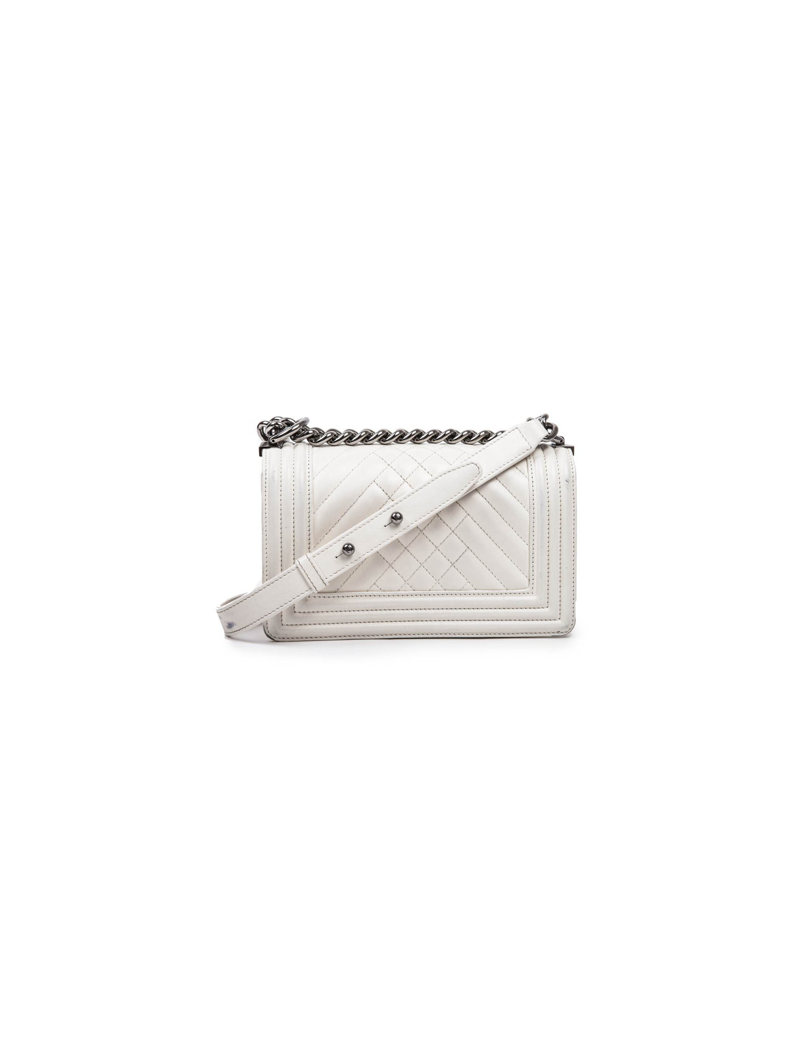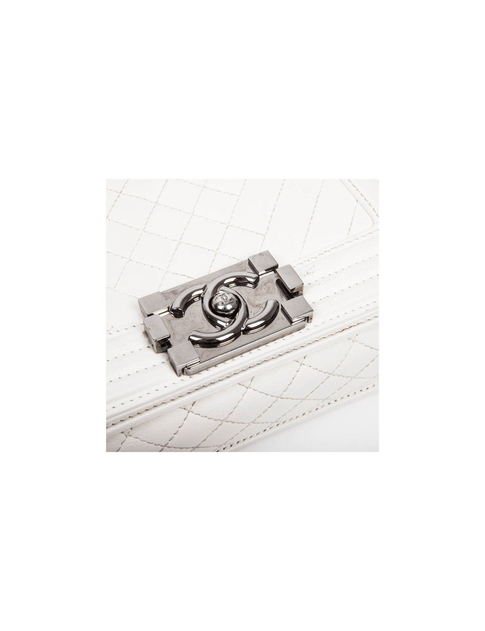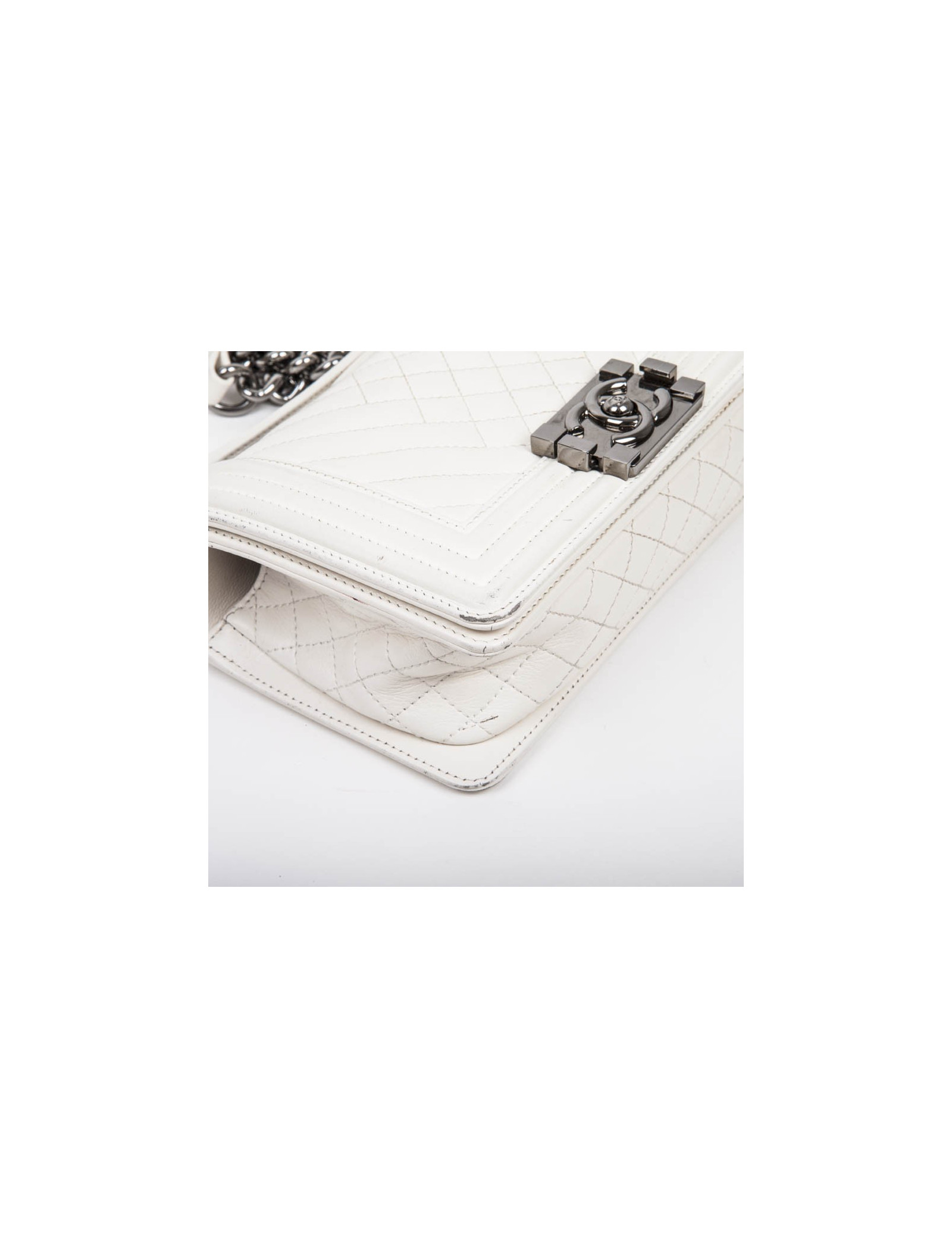 Sac "Boy" Chanel en cuir blanc matelassé. Petit modèle. Accastillage métal argent ruthénium. Fermeture avec clip siglé "CC". Porté épaule ou crossover avec l'anse réglable. Intérieur en cuir de la même teinte. Hologramme 1927... Made in Italy.