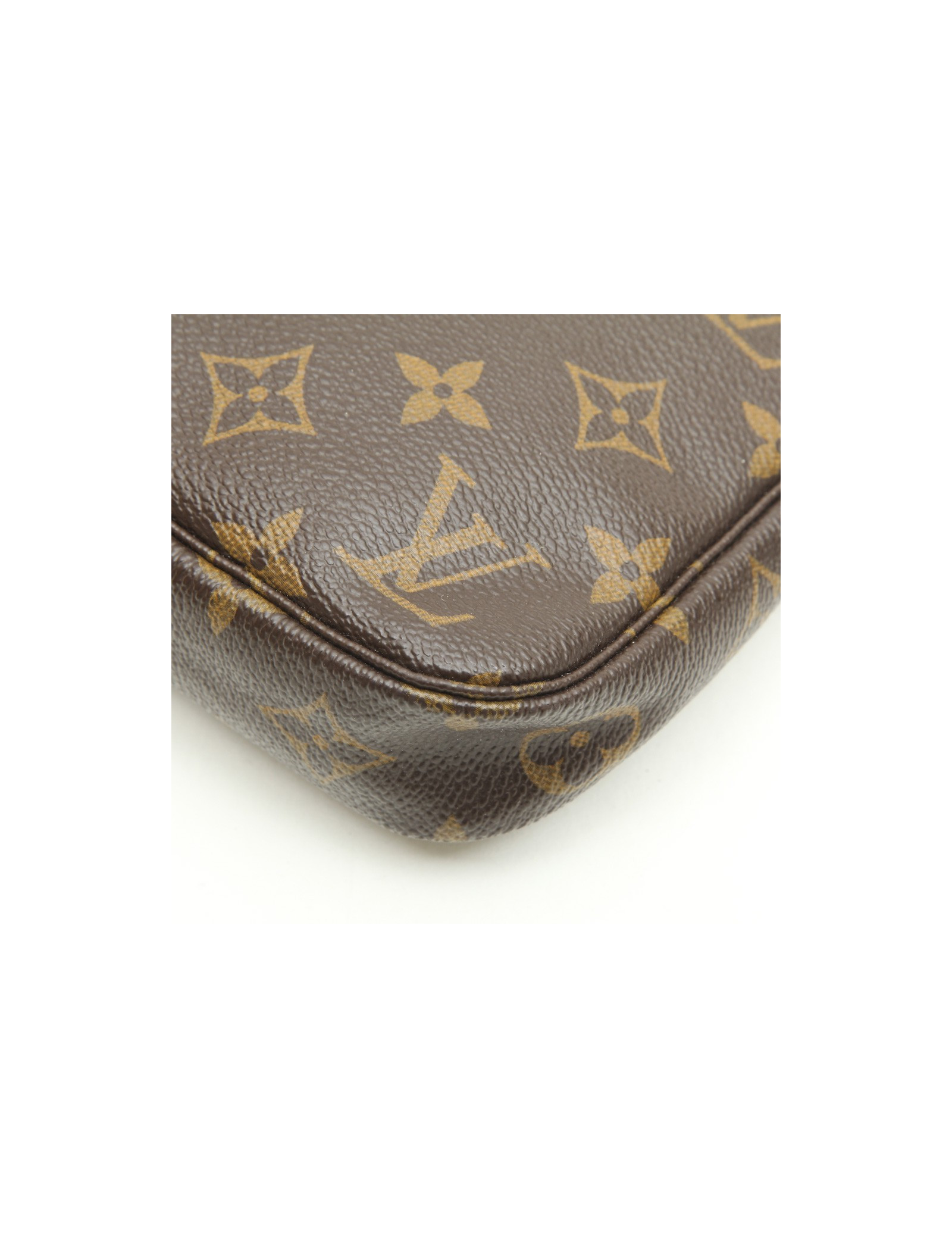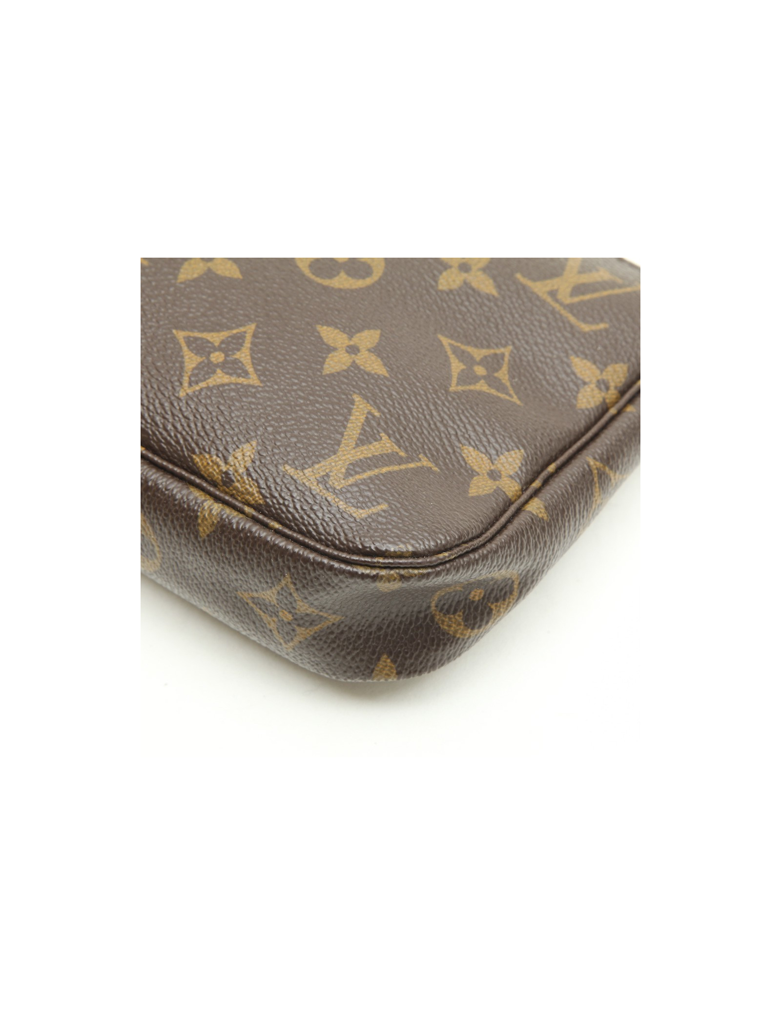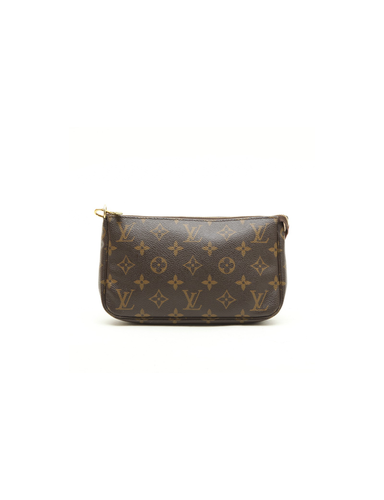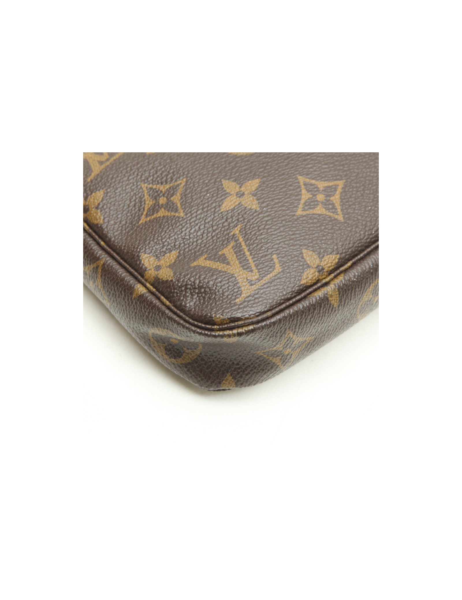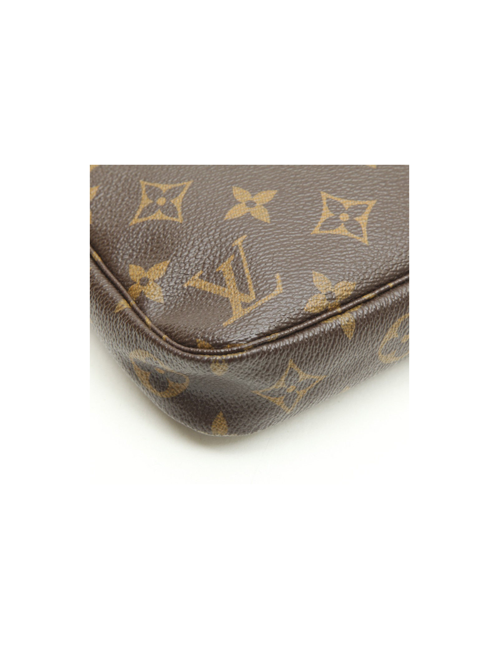 Pochette Louis Vuitton en toile monogram marron. Bijouterie dorée. Fermeture zippée.