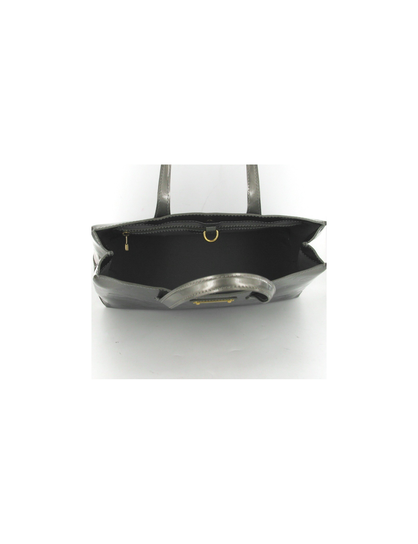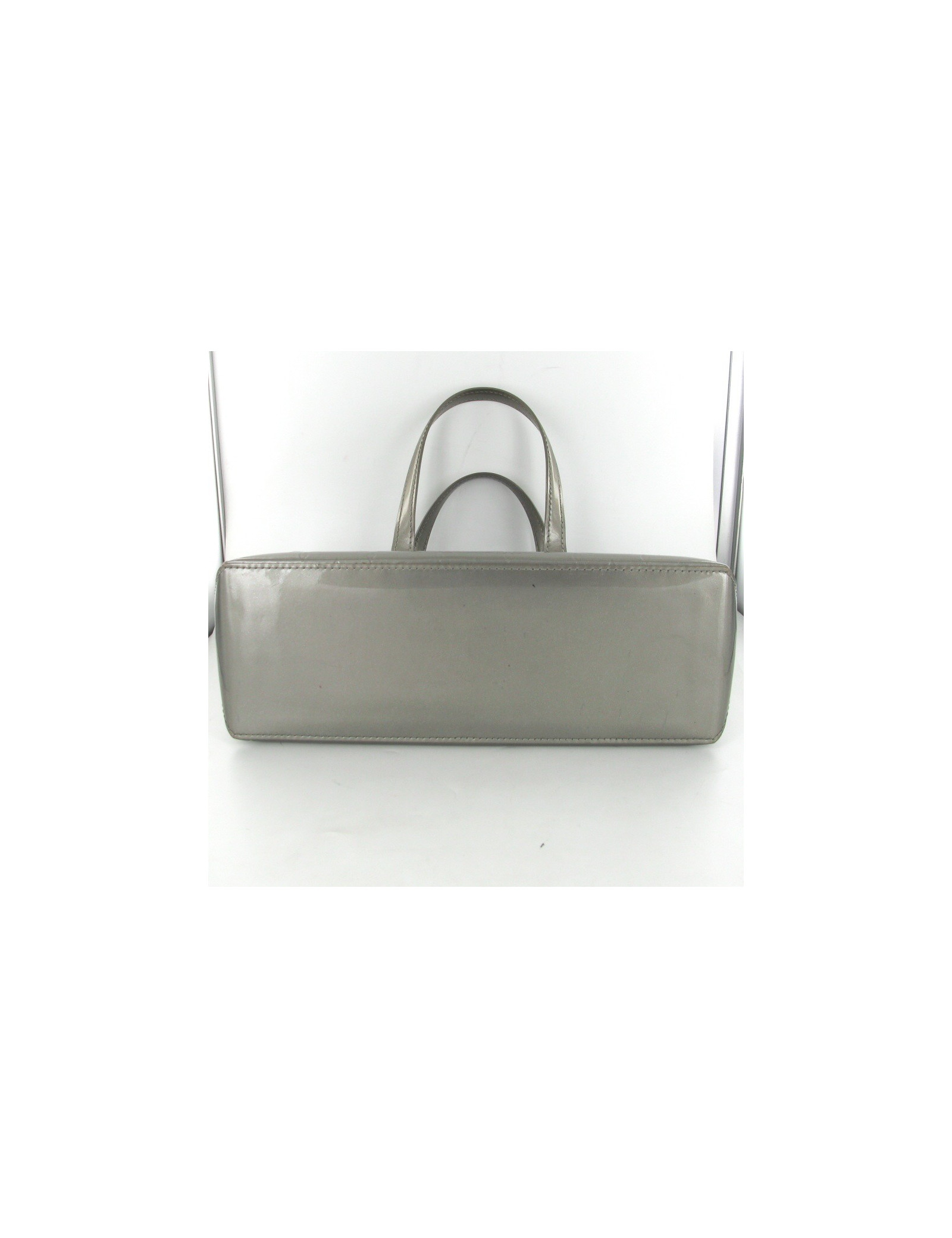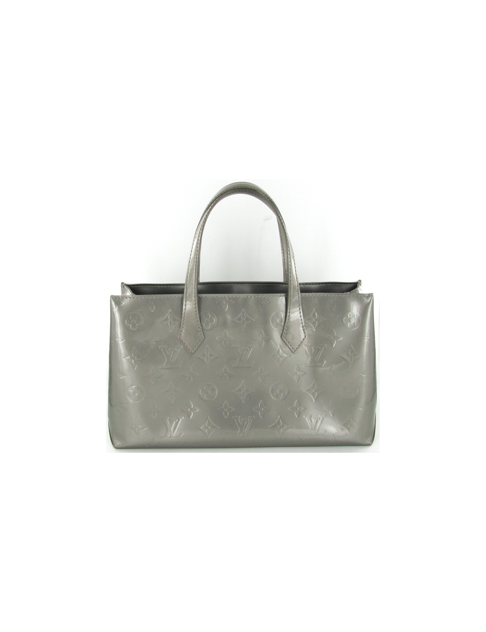 Joli sac à main Louis Vuitton en cuir vernis gris monogrammé. La bijouterie est en laiton dorée, l'intérieur est en toile grise. Il possède une poche intérieure zippée. Il y a plusieurs traces de stylo à bille sur la face arrière, elles sont peu visibles.