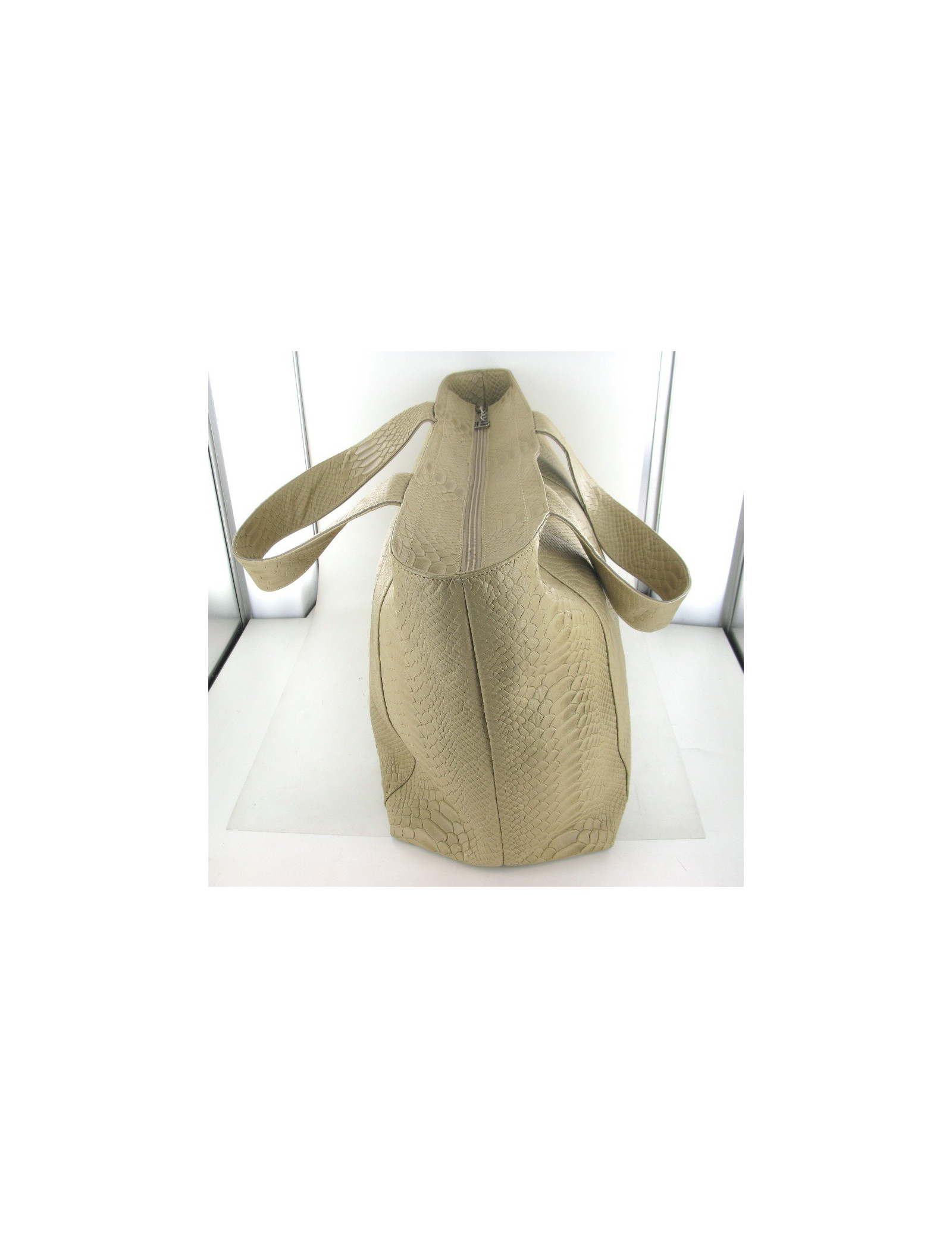 Magnifique cabas BALMAIN en cuir façon python beige. La fermeture est zippée, l'intérieur est en toile marron siglée BALMAIN. Il y a 2 poches intérieures dont une zippée. La bijouterie est en argent palladiée.