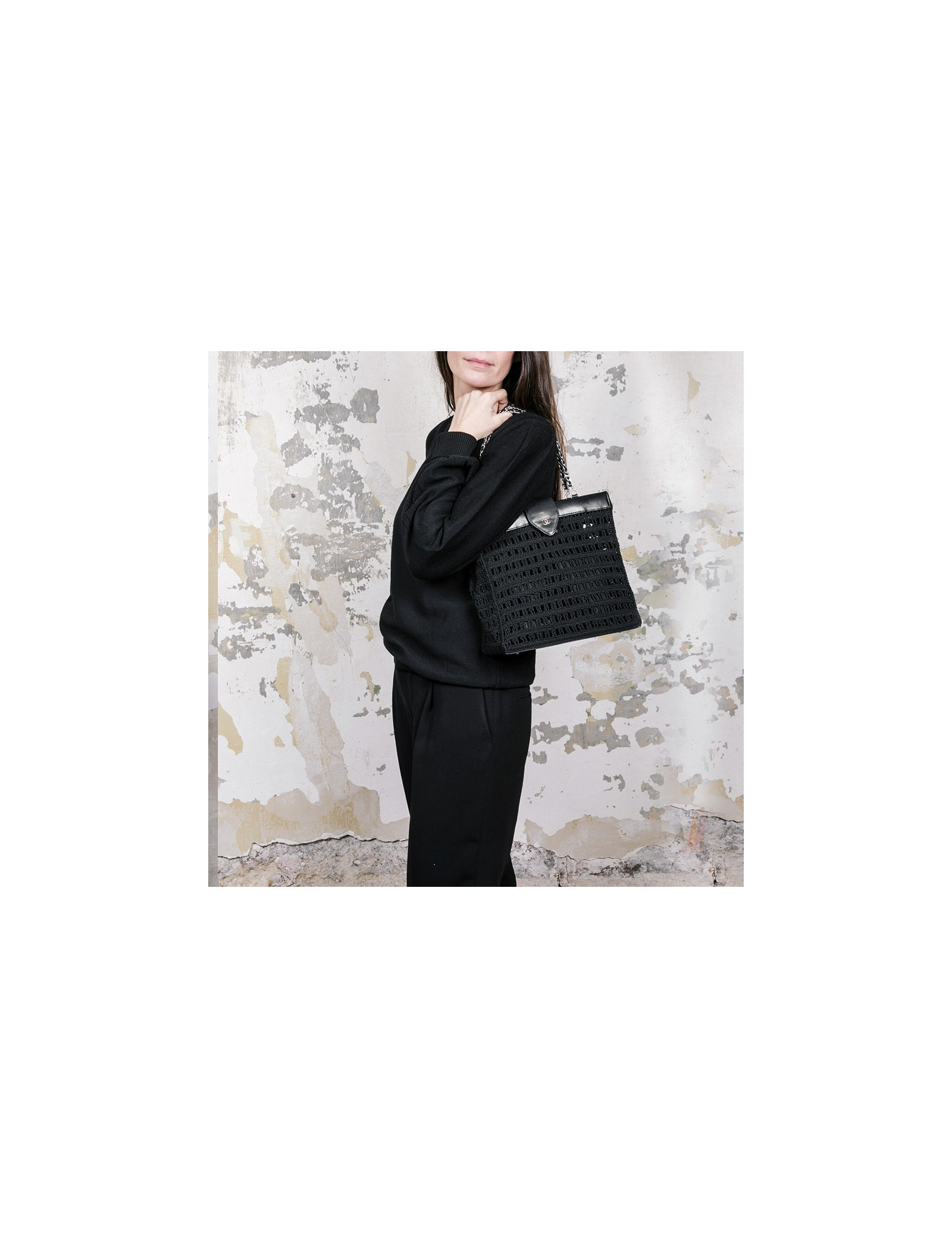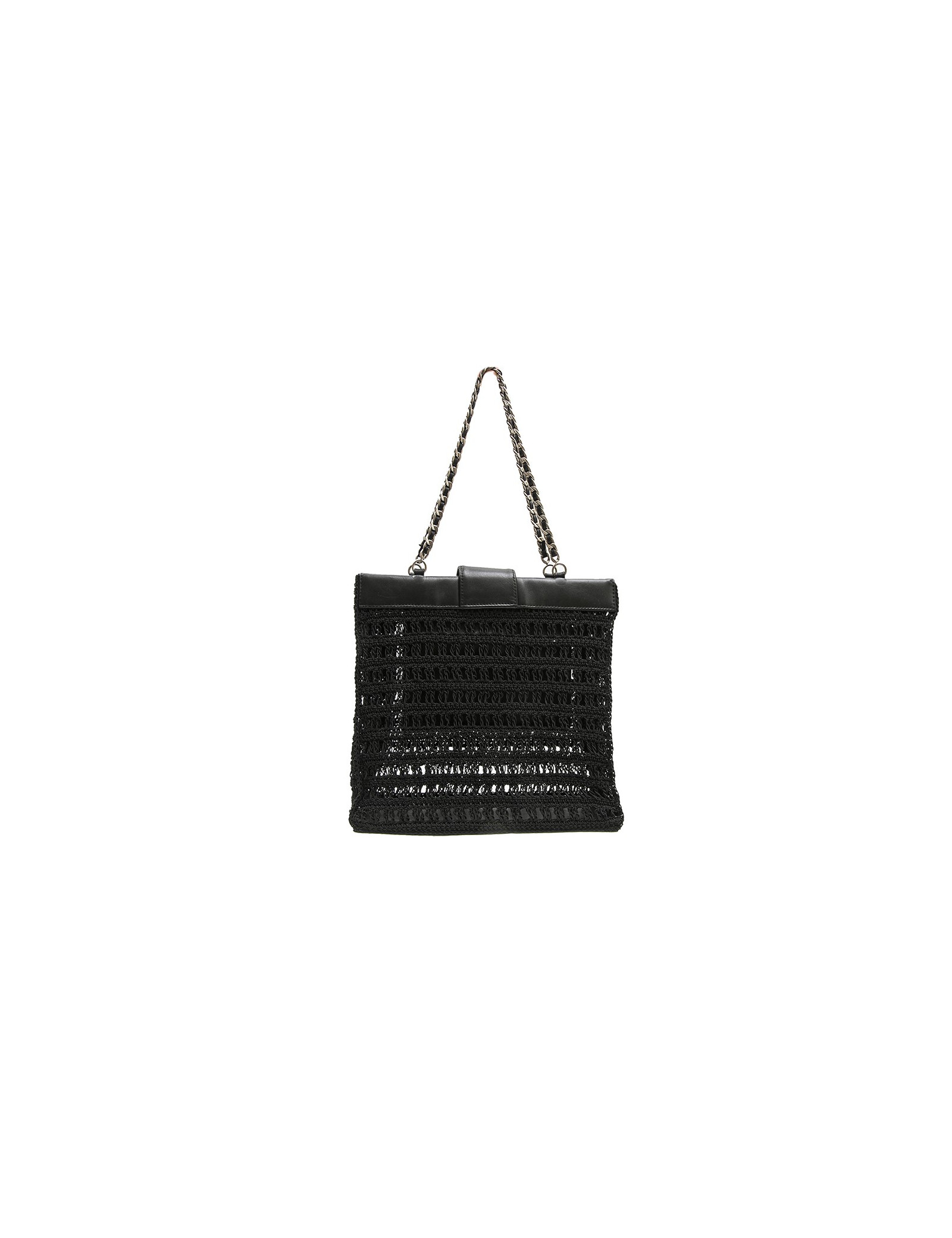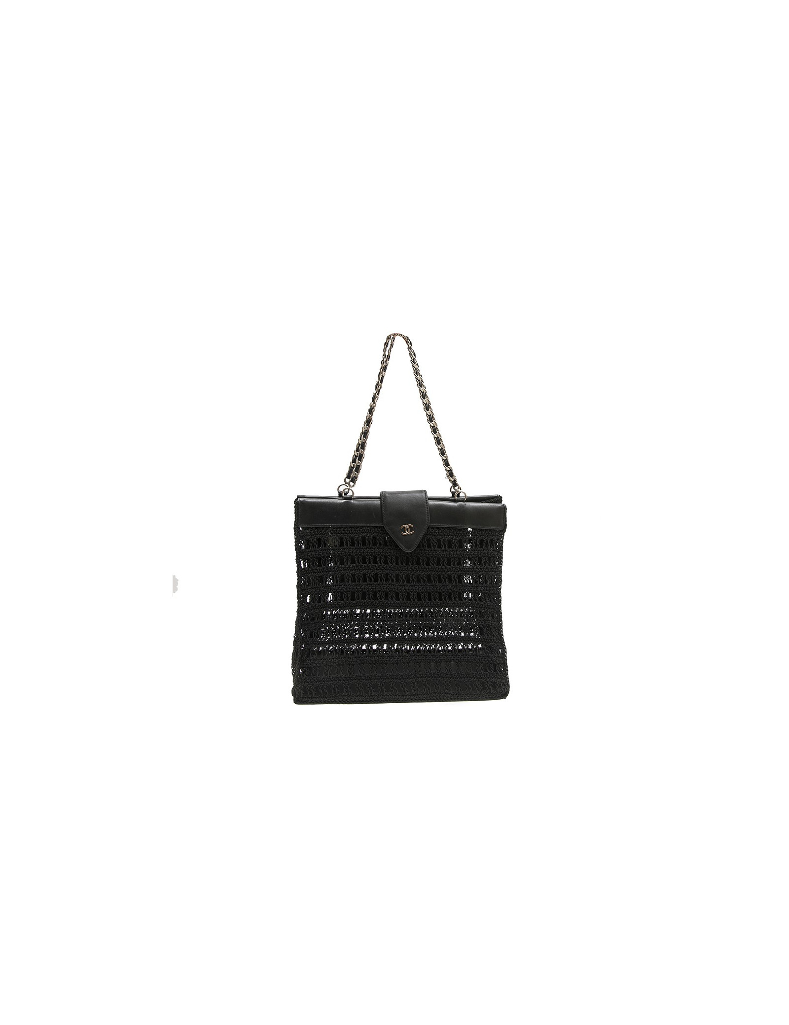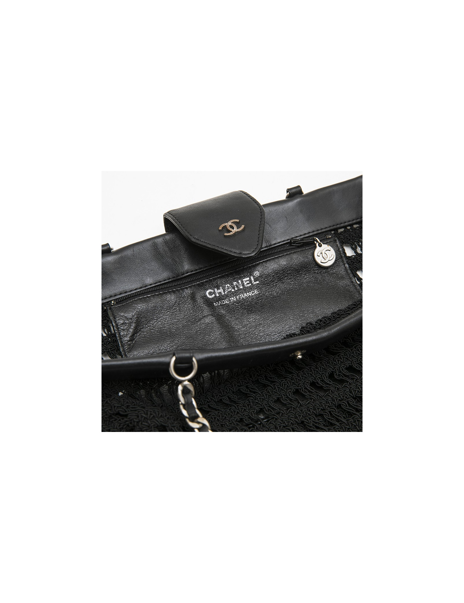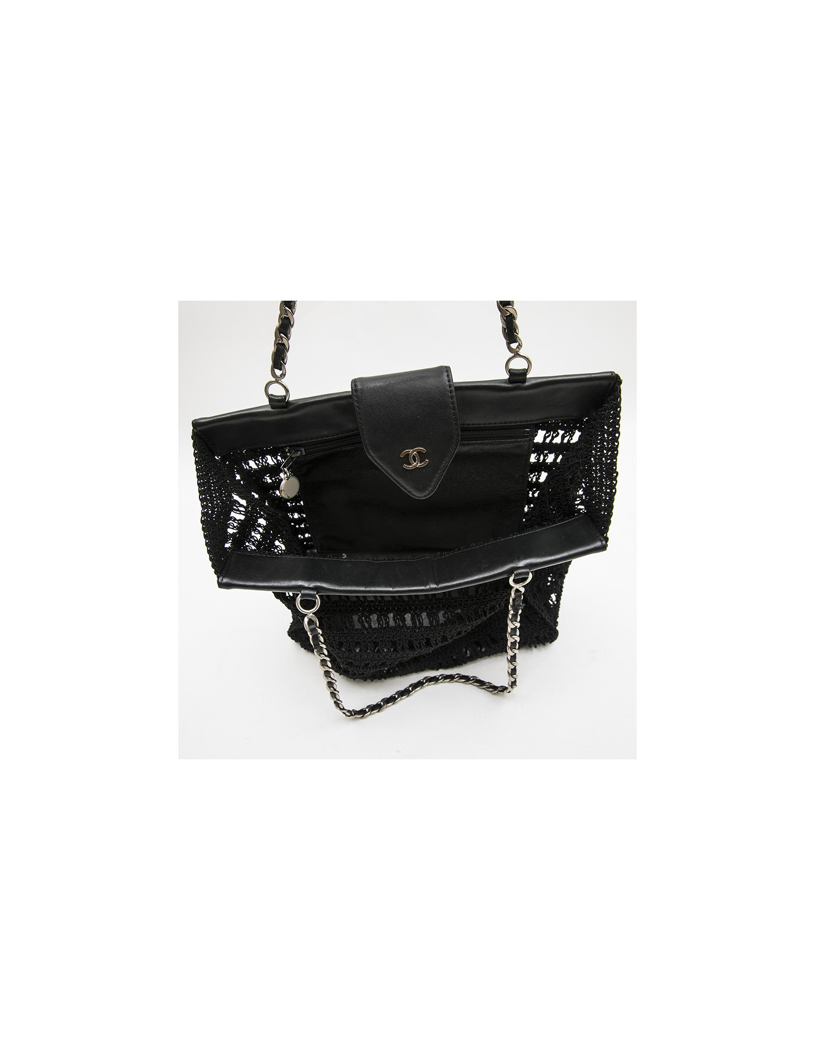Sac Chanel noir, cuir et crochet avec poche intérieure zipée. Bijouterie métal argent mat. Fermeture par bouton pression.