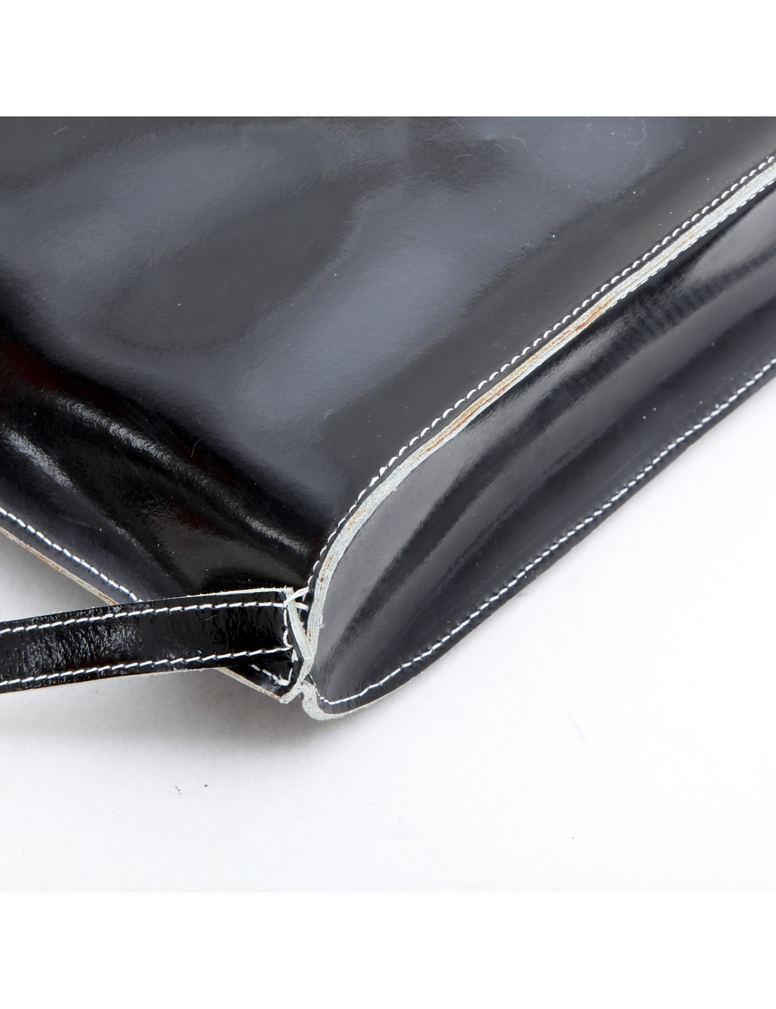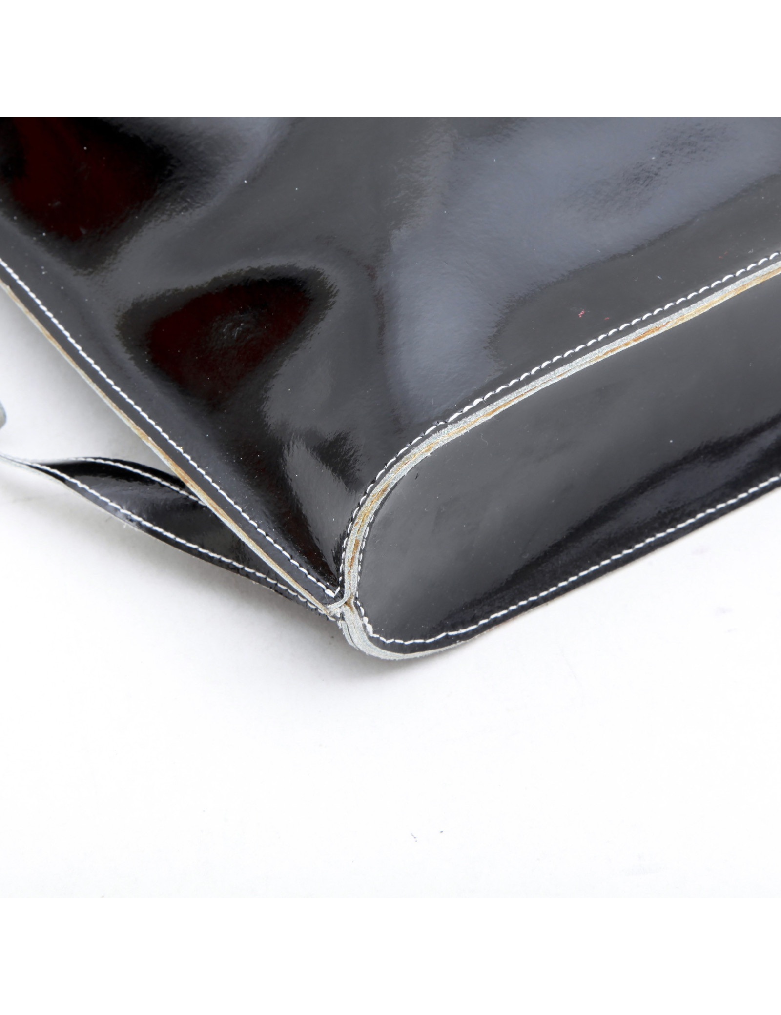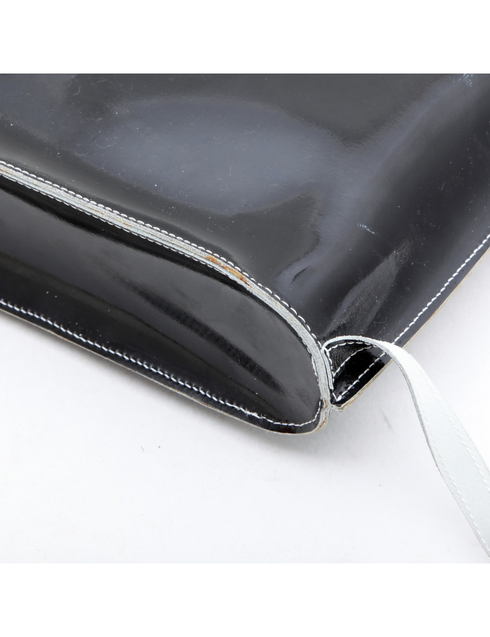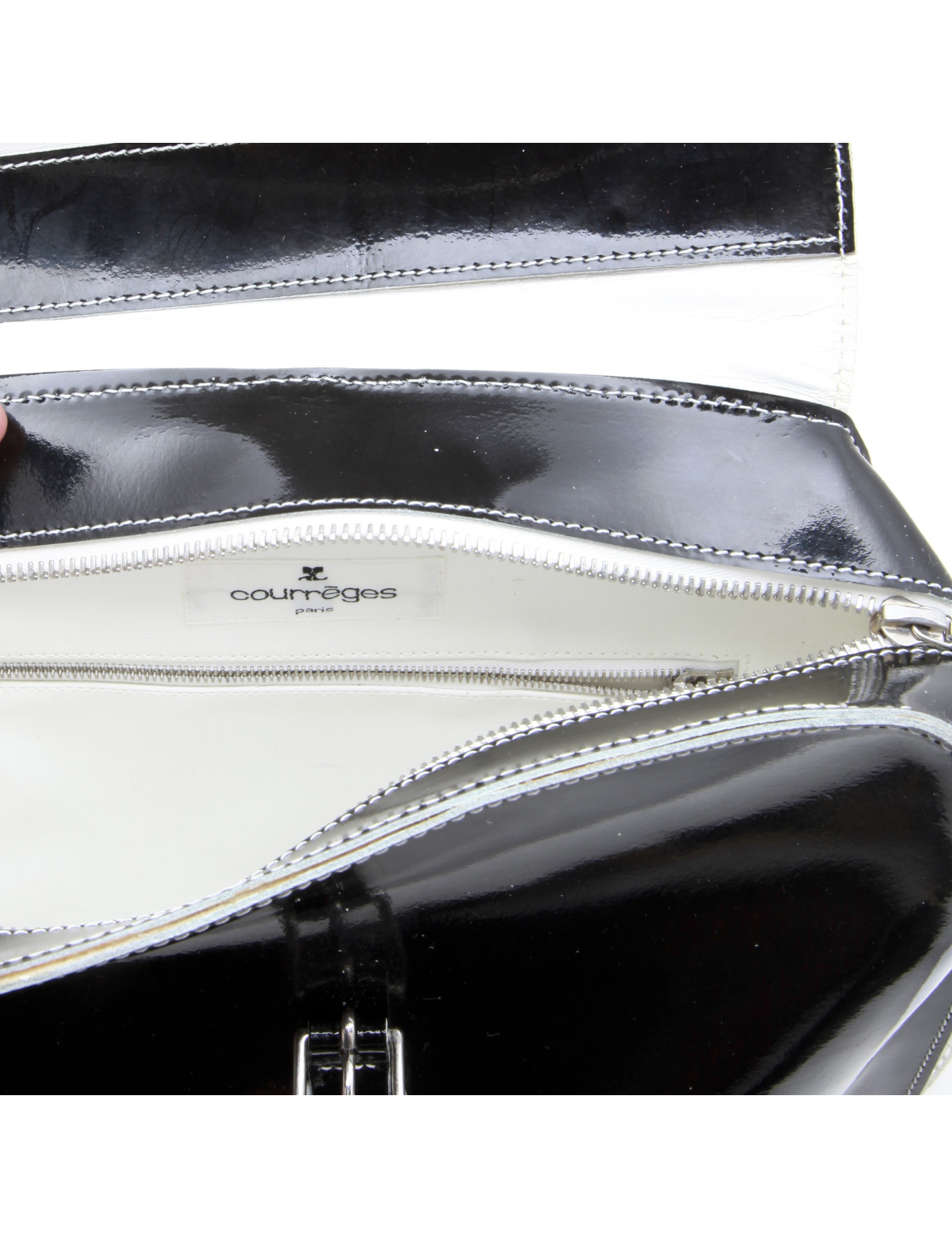 Sac à dos Courrèges en cuir verni noir. Bijouterie argentée. L'intérieur est en cuir lisse blanc.