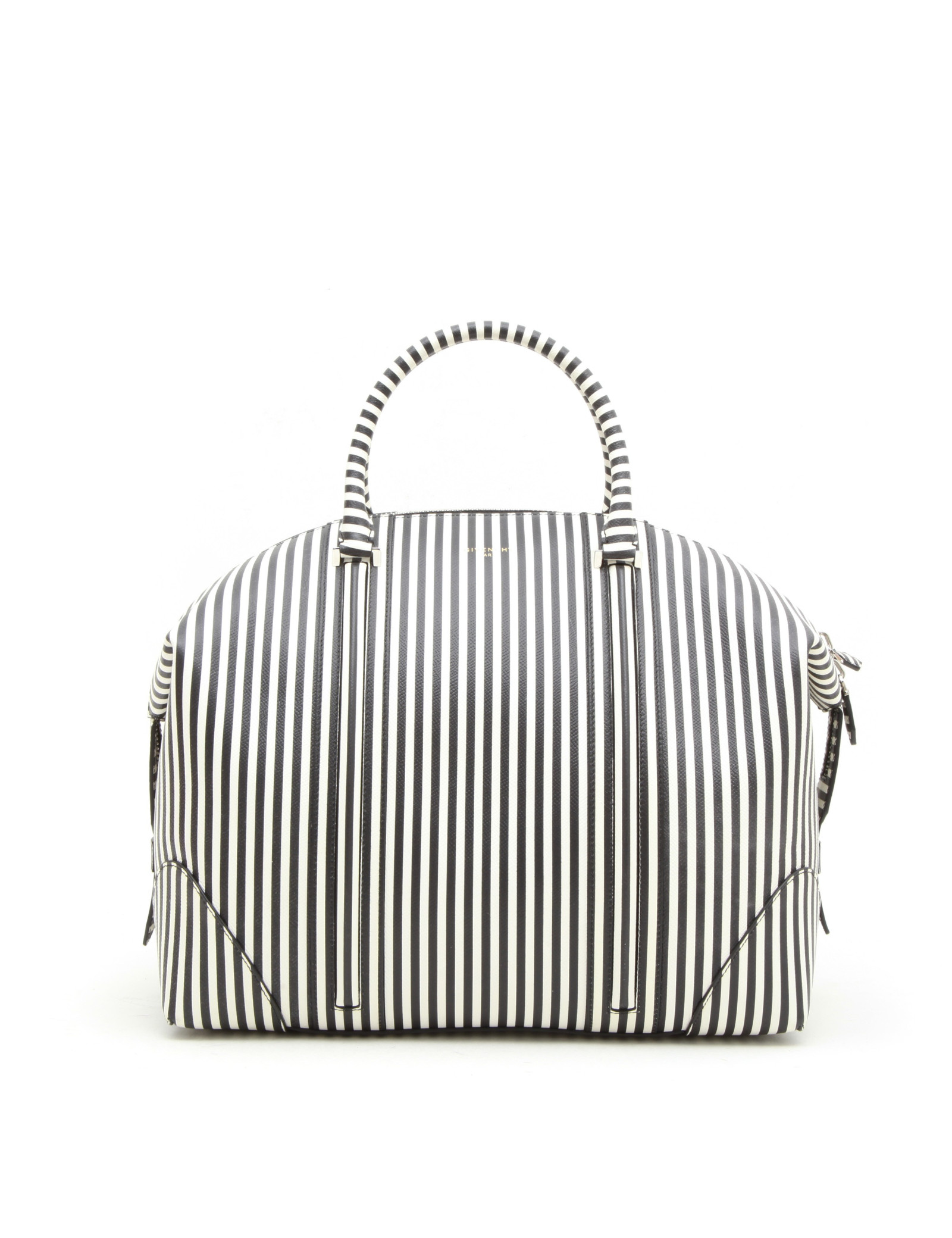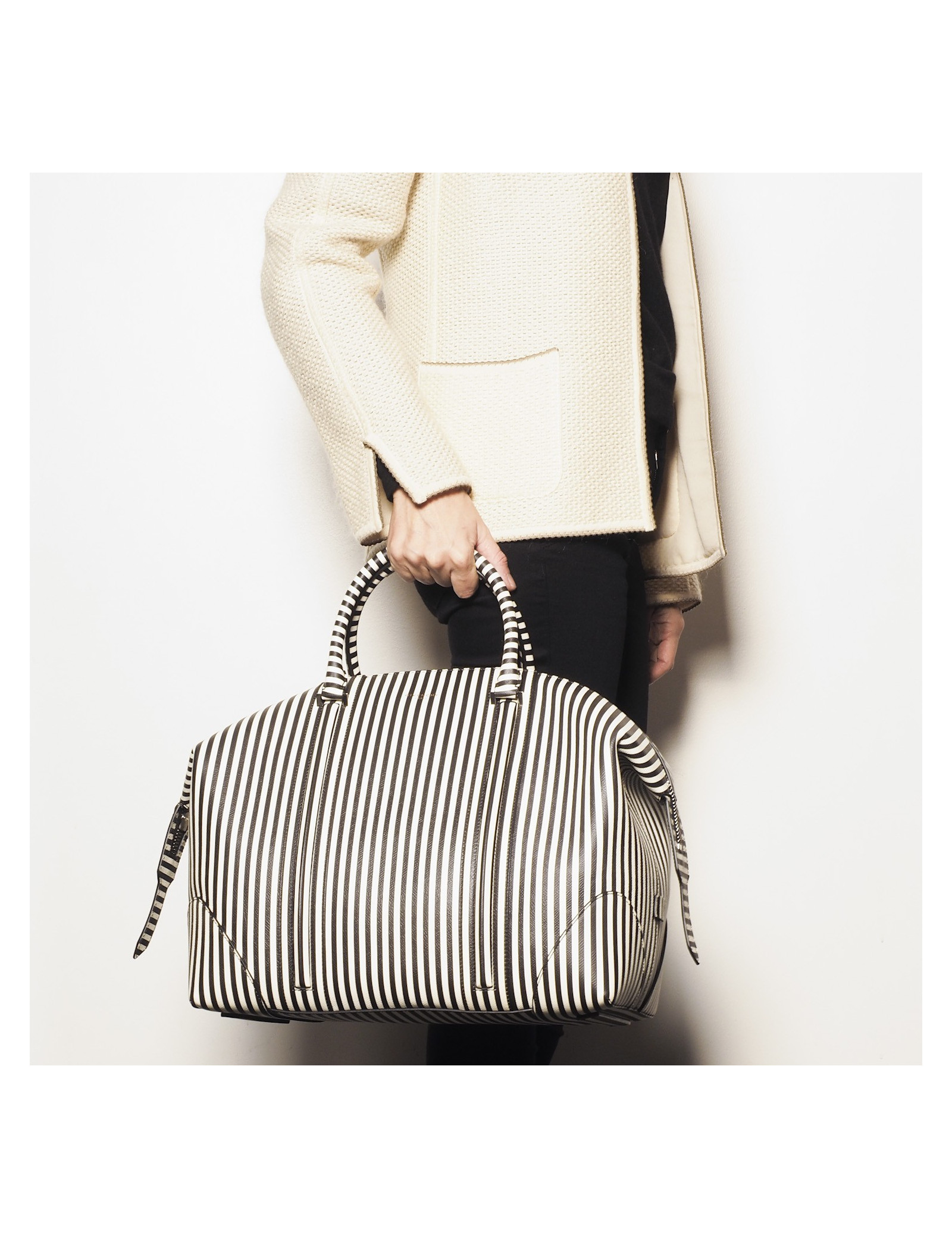Sac de weekend Givenchy, porté main, en cuir blanc rayé noir. Fabriqué en Italie. Etat neuf.